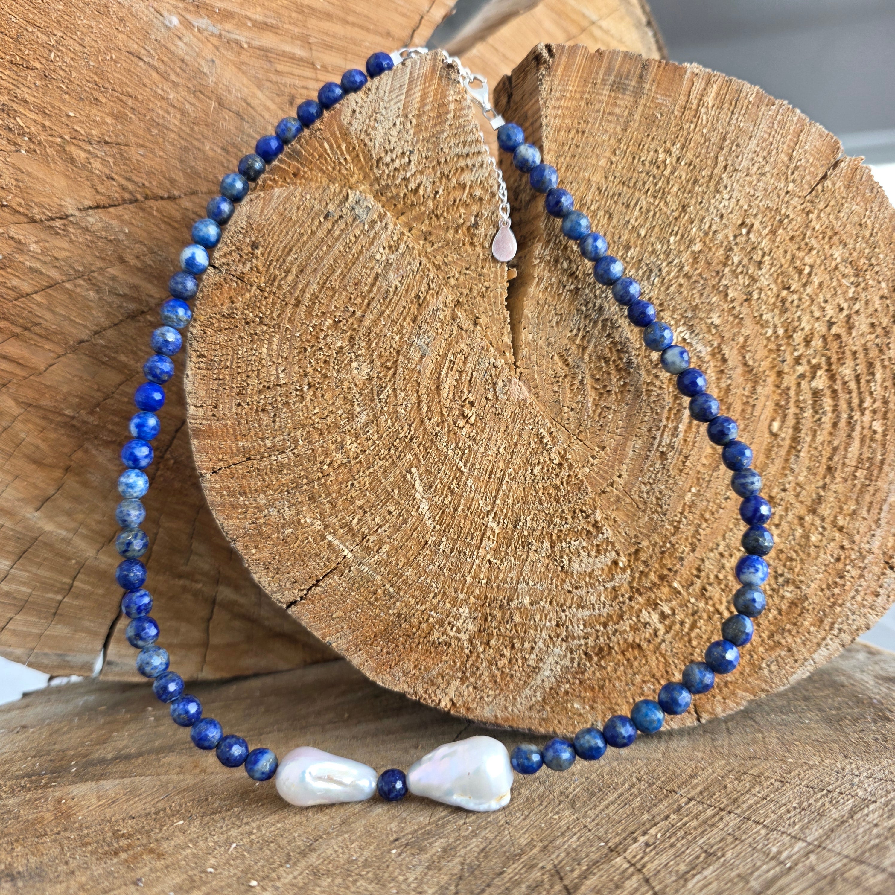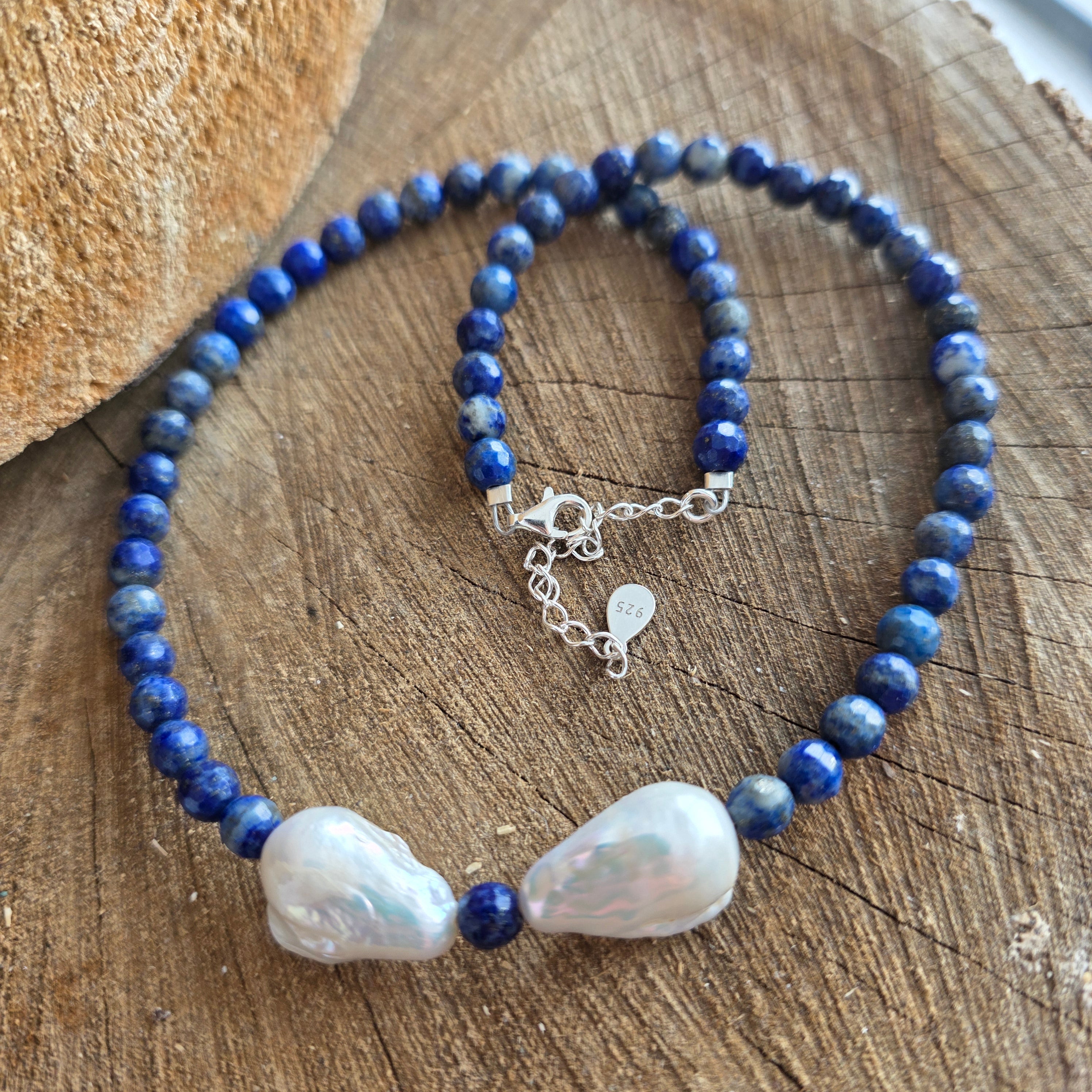 Материали: лапис лазули (фасетирани топчета 6 мм), естествени барокови перли, сребро 925