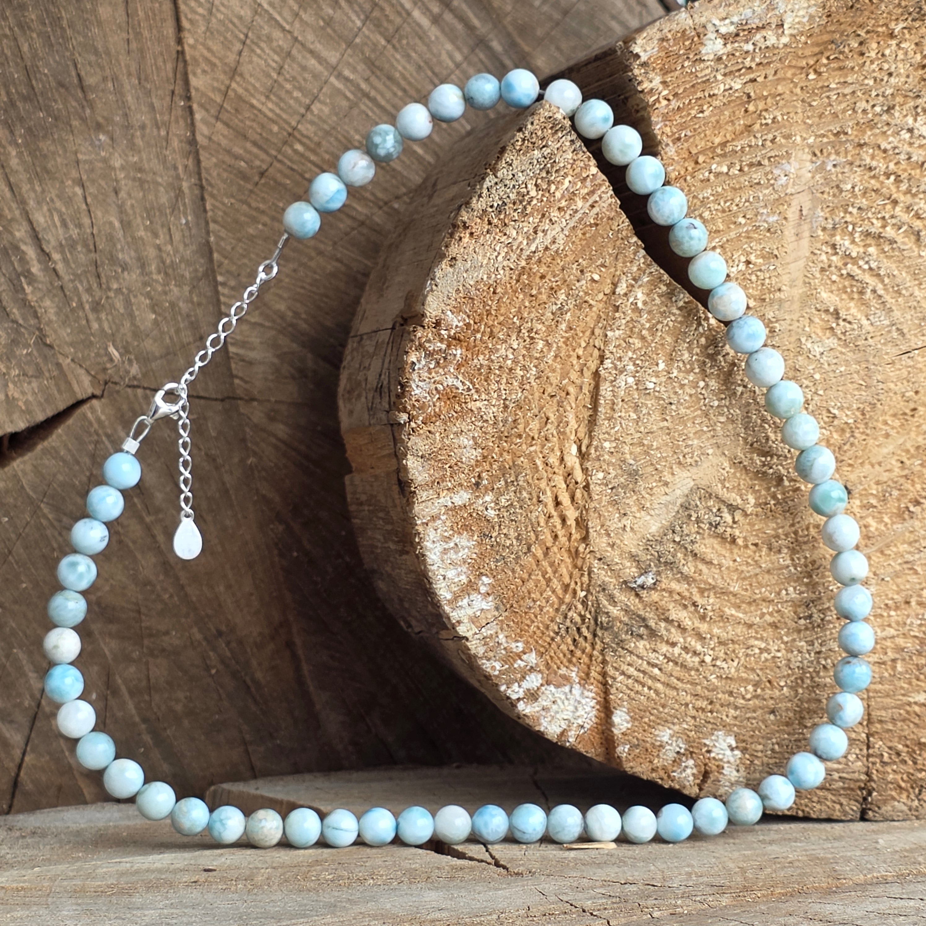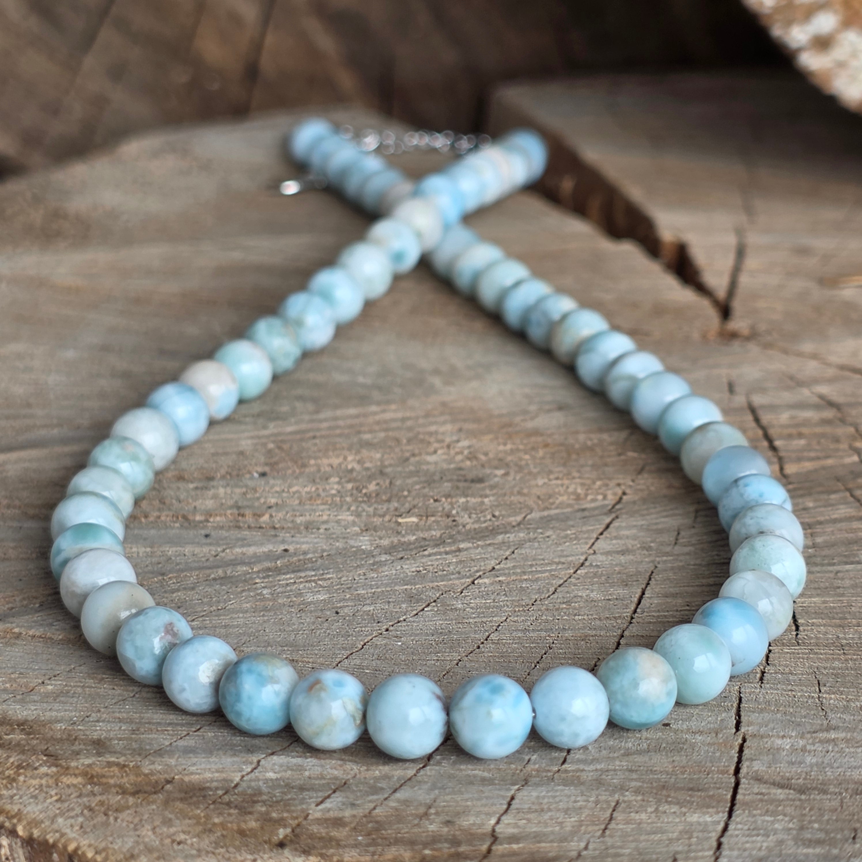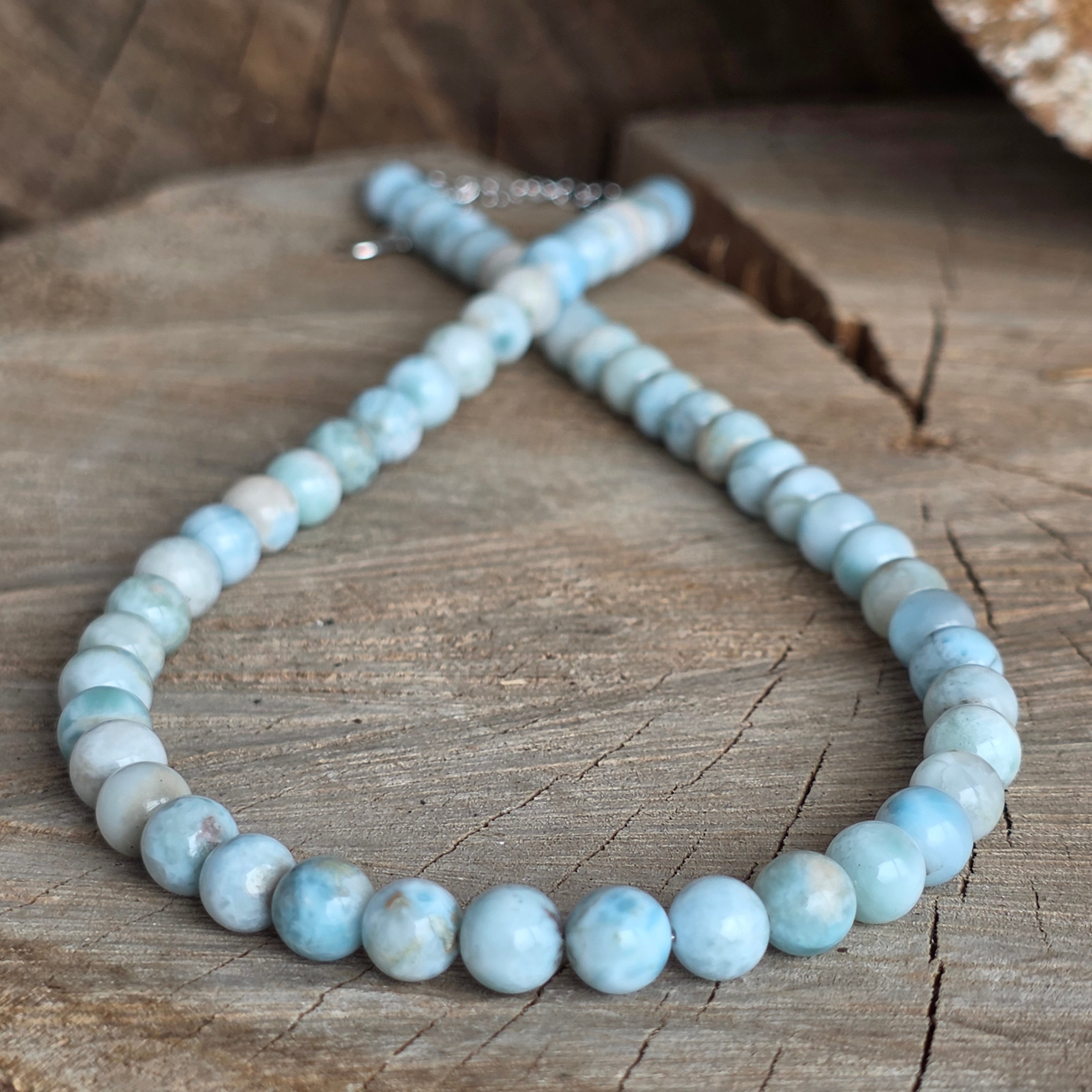 Колие, което изглежда, че съхранява в себе си спокойствието на морето – неговите нюанси на светлосиньо, преминати от бели форми, напомнят за меки вълни и ясно небе. Изработено от натурален ларимар с топчета 7 мм, това бижу носи усещане за свежест и баланс.