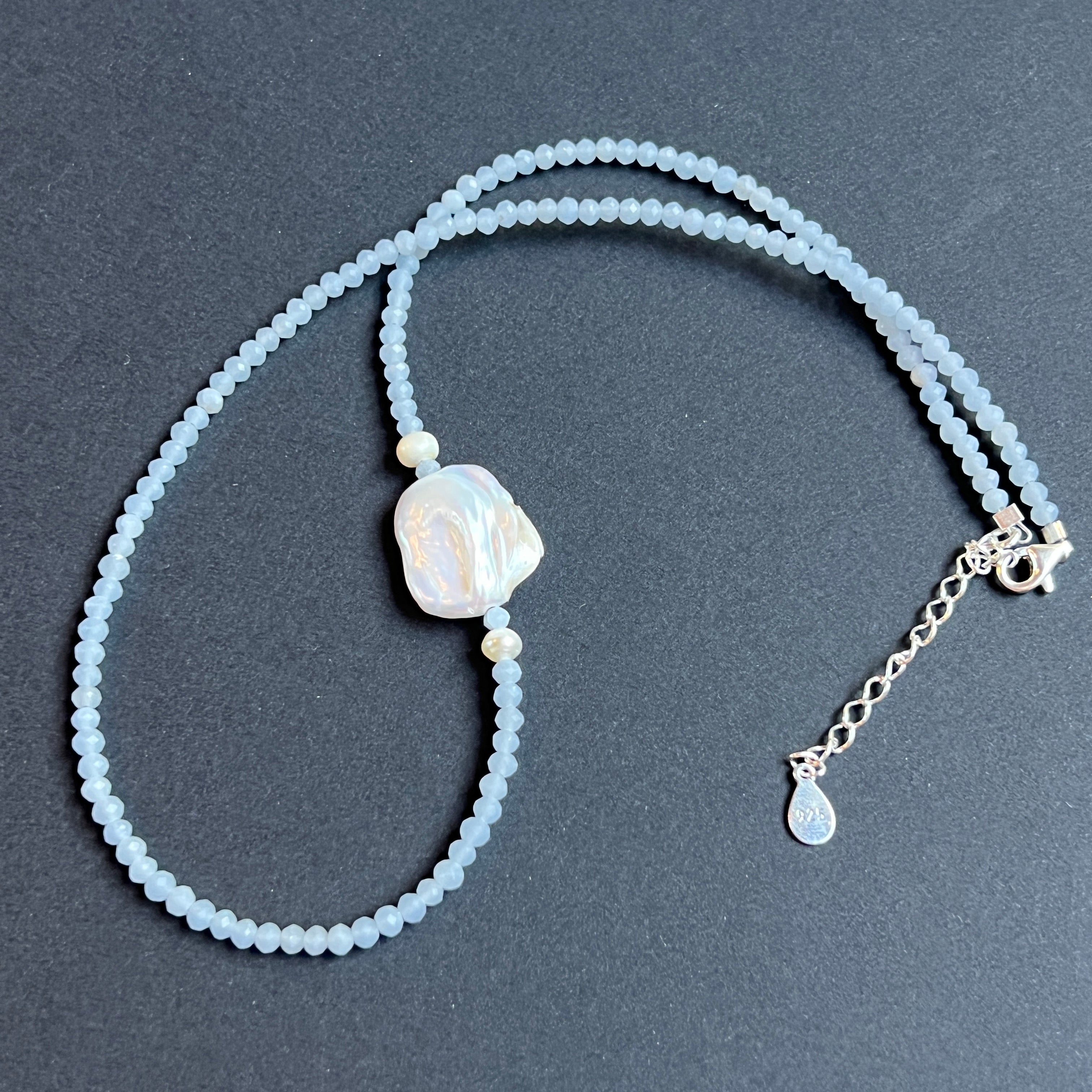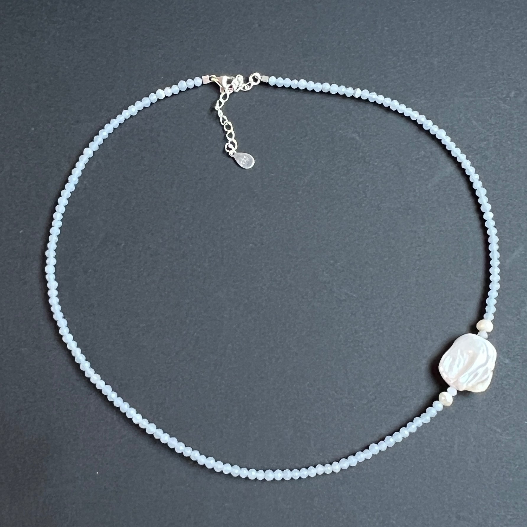 Колие като шепот, дошъл от небето – деликатно, ефирно и дълбоко успокояващо. Фацетираните дискове от ангелит с диаметър 3,5 мм, нежни като прах от синя светлина, се сплитат във низ от яснота и мир, като спокойно вдишване сред суетата.