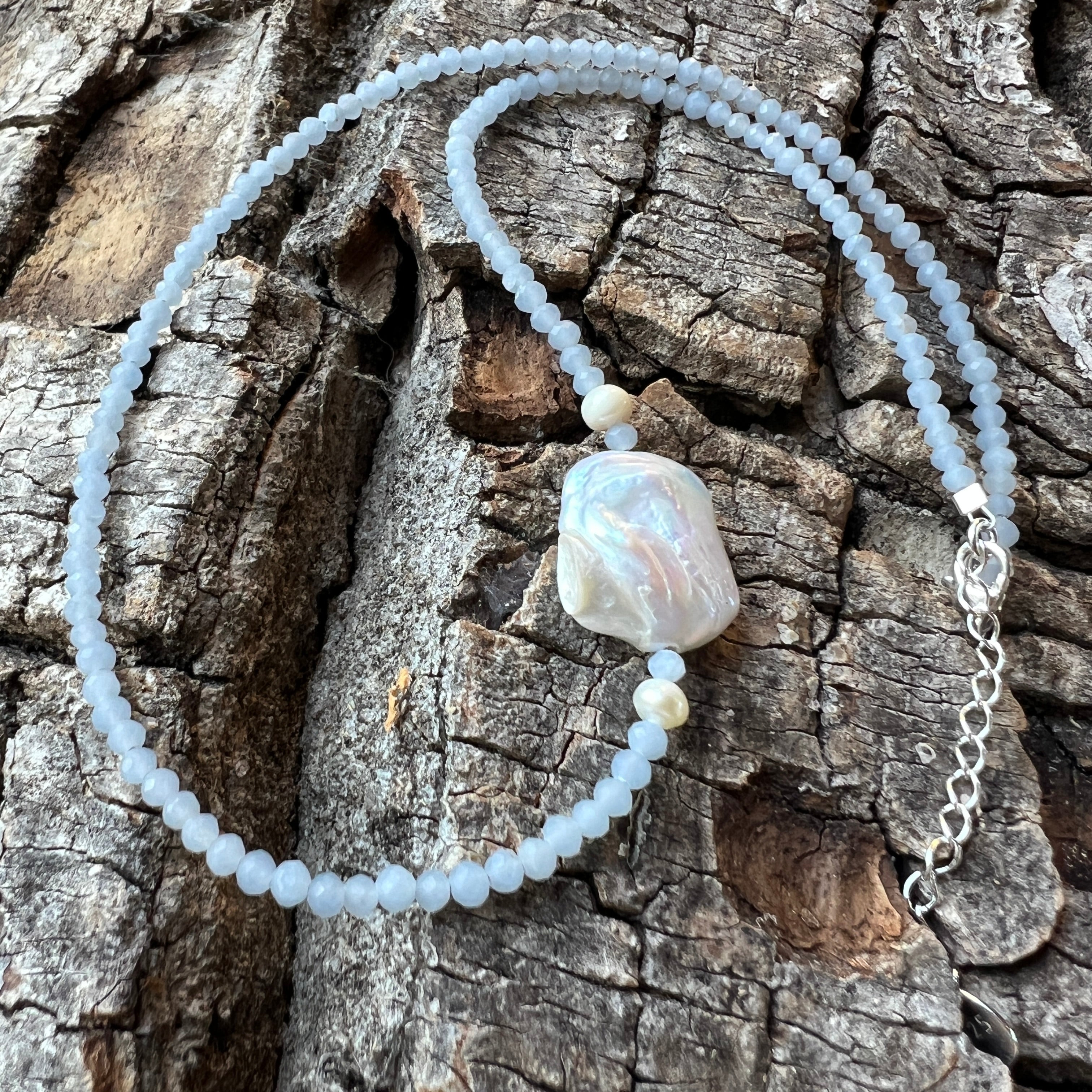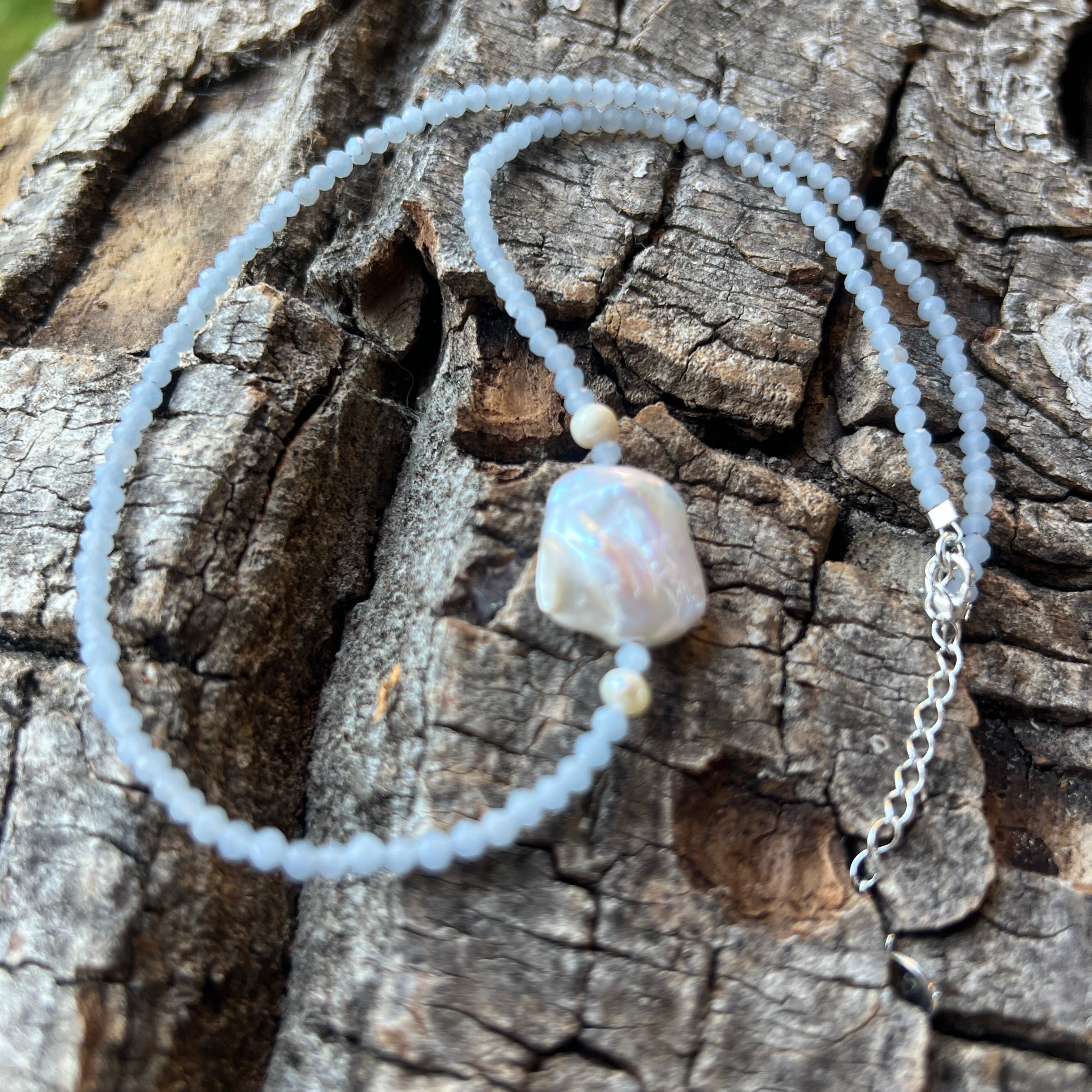 Ангелитът е известен като камъкът на ангелите – кристал на душевния мир, духовната връзка и невербалната комуникация с фините светове. Казва се, че носи нежна защита, доверие и отвореност към по-висши измерения на битието. Перлите усилват тази енергия с тяхната тихо излъчвана чистота, събуждайки дискретната красота и емоционалната мъдрост.