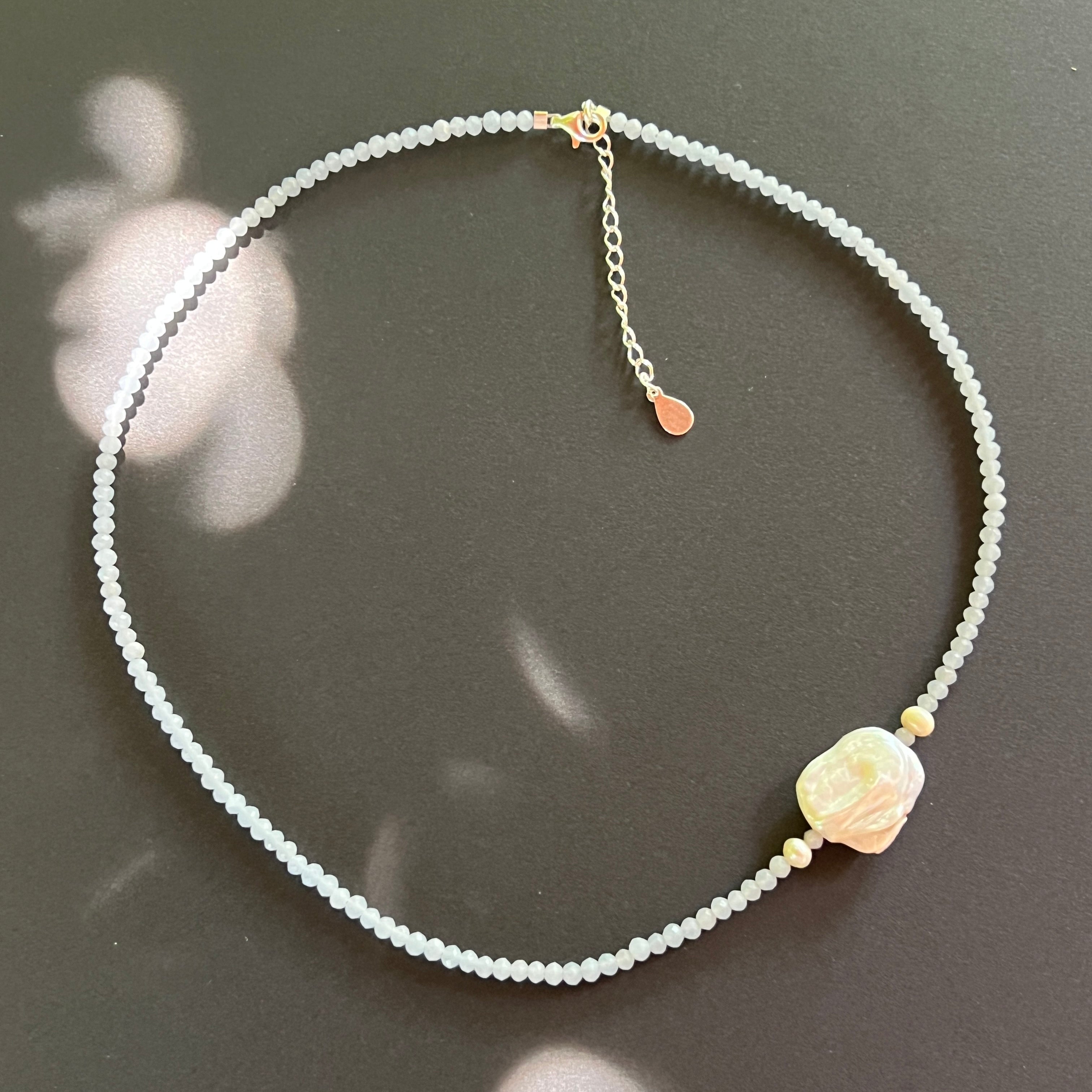 В долната част на колието, един фин детайл привлича погледа: естествено правоъгълно перлено мънисто около 1,5 см, придружено от две кръгли перли с размер 4 мм. Този органичен и асиметричен акцент придава на бижуто въздух на грация и женственост, сякаш лъч лунна светлина е спрял за миг на повърхността на спокойна вода.