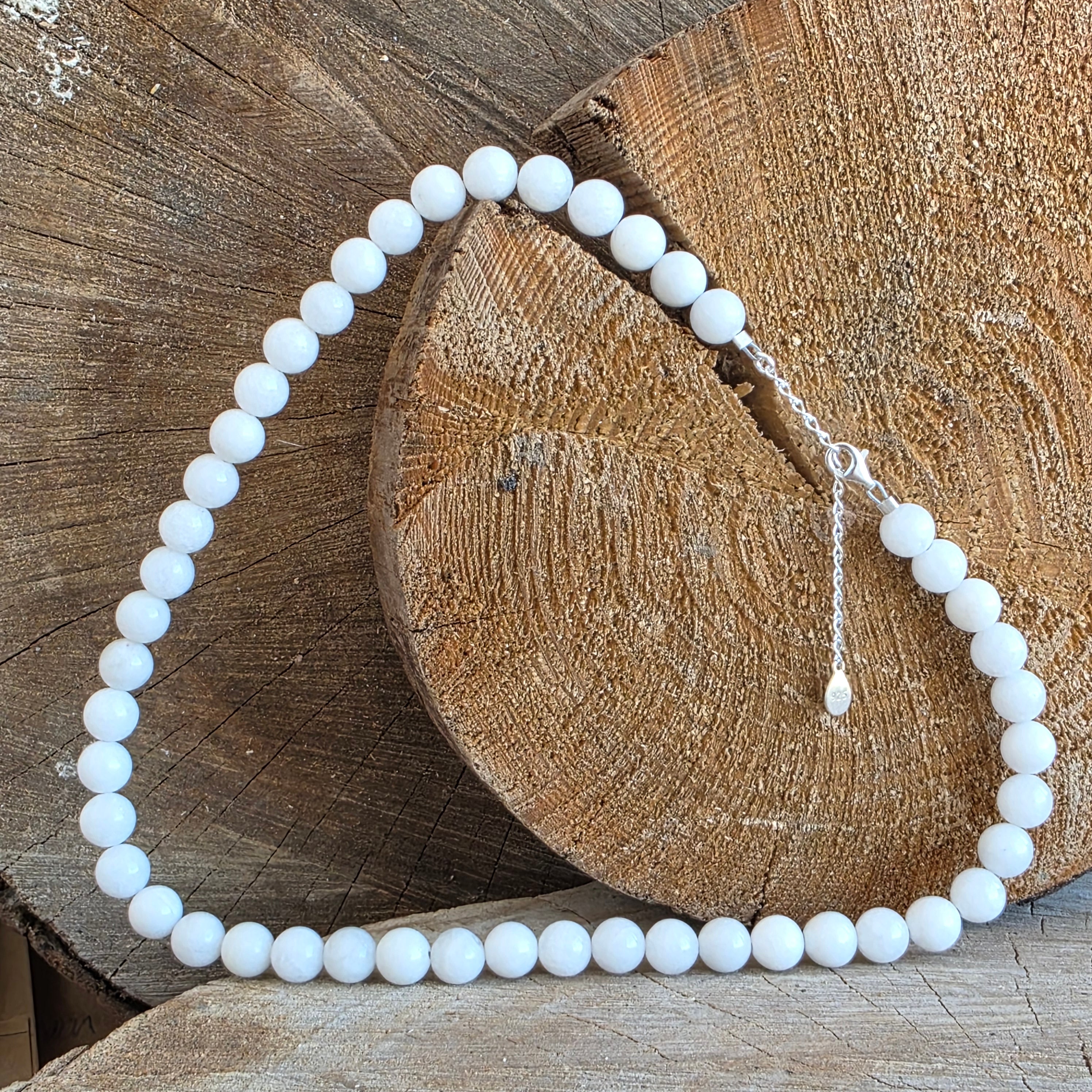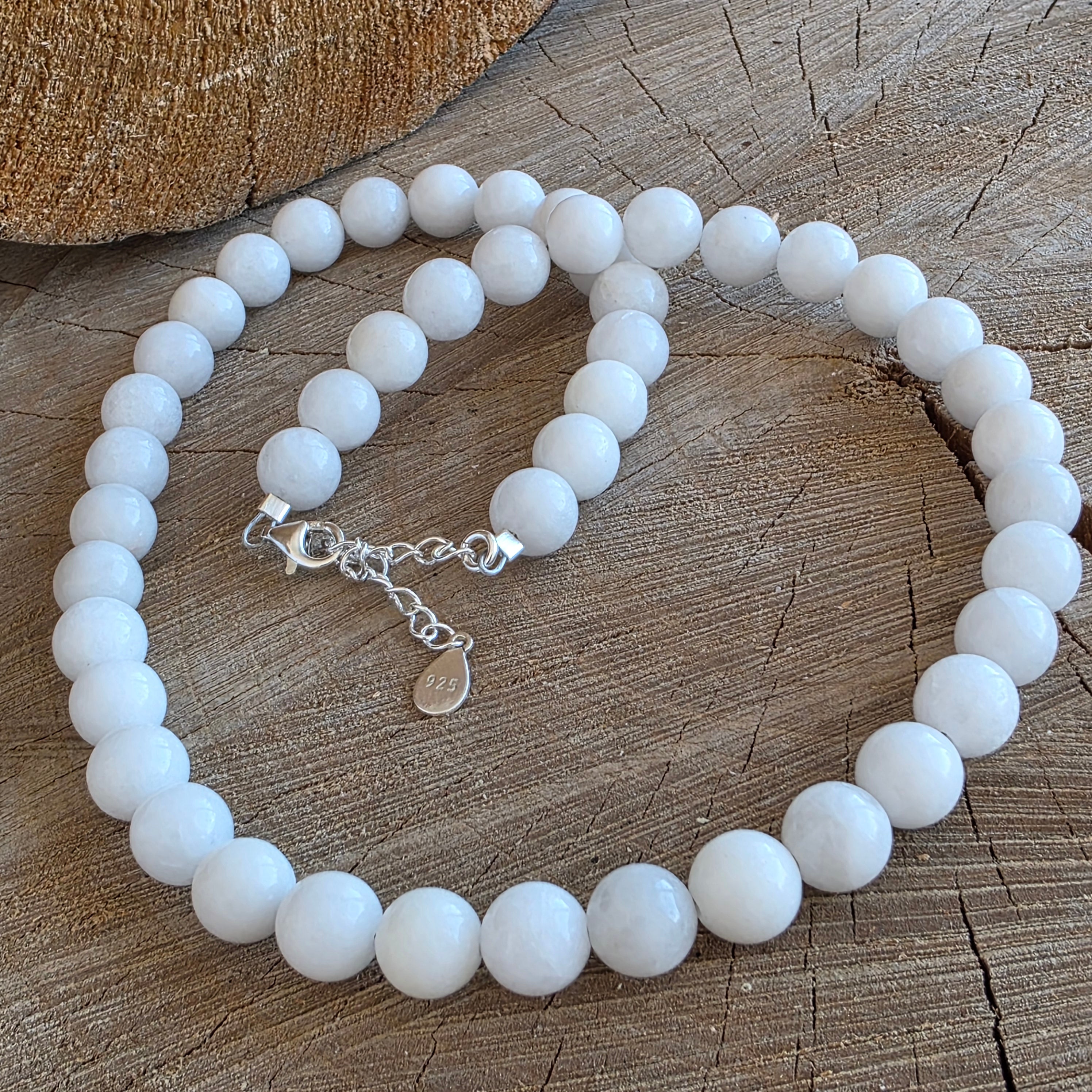 Колието излъчва спокойна и изискана присъствие, изработено от фасетирани мъниста бял нефрит 6 мм, които се поставят хармонично около шията, оформяйки балансирана и светла линия. Млечнобелият цвят, понякога леко прозрачен, придава на камъка чист и подреден вид, а фината фасетировка добавя дискретни отблясъци, които подчертават естествената текстура без да натоварват визуално бижуто. Дизайнът е чист и вечен, подходящ за ежедневно носене или за елегантни акценти.