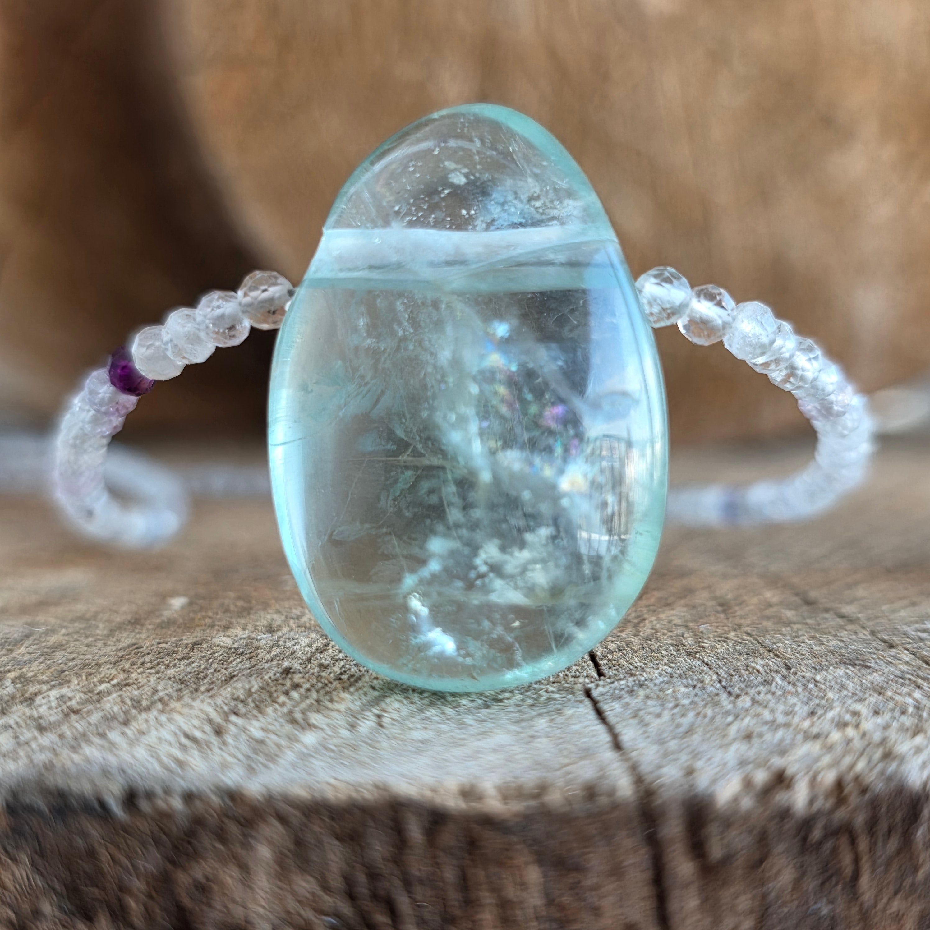 Материали: фасетиран дъгов флуорит 3 мм, сребро 925, паднал флуоритен медальон