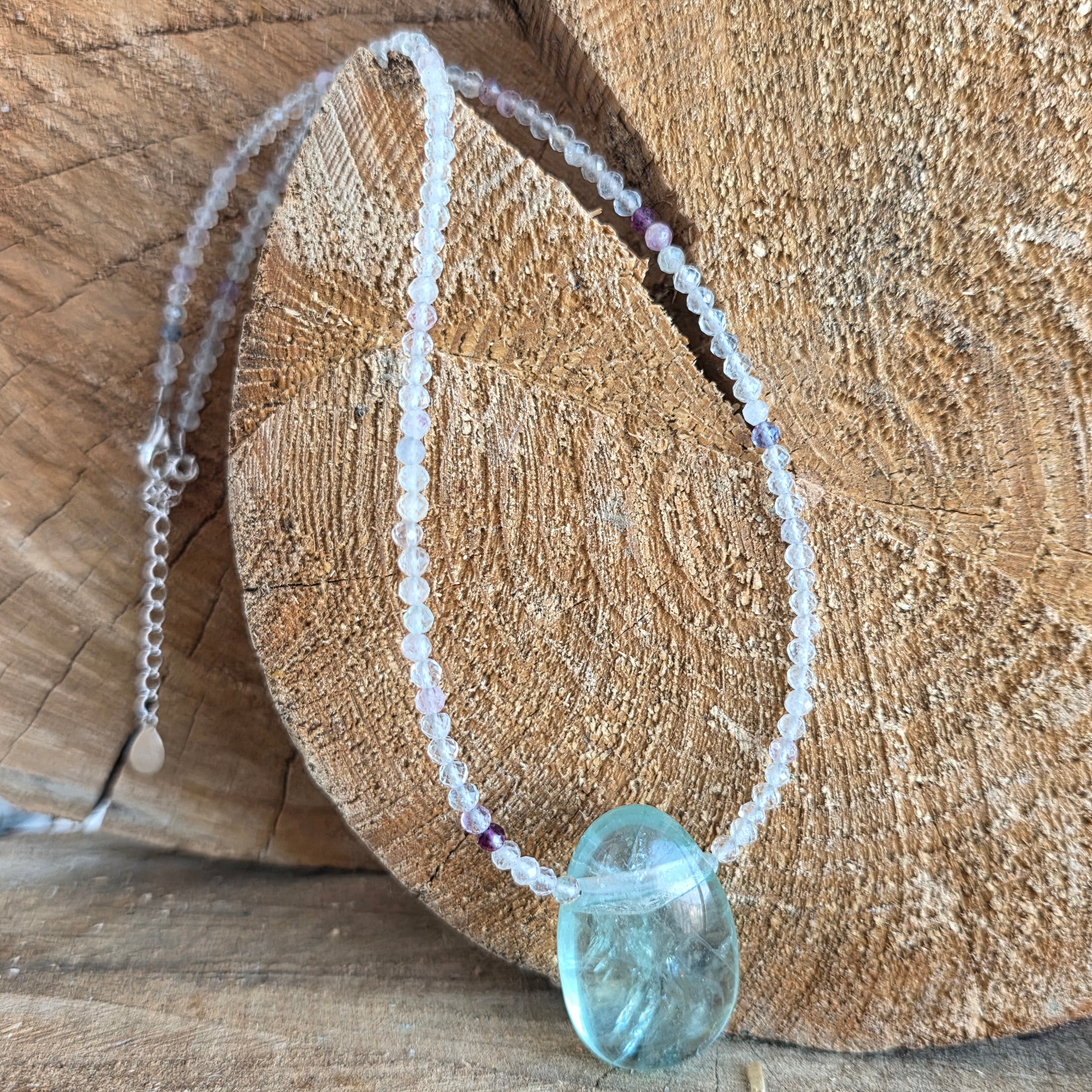 Деликатно и сияйно, това колие от дъгов флуорит е изработено от фасетирани 3 мм мъниста, внимателно шлифовани, за да подчертаят прозрачността и естествените цветови вариации на камъка. Нежните нюанси на зелено, лилаво и синьо се преплитат хармонично, придавайки на колието лек и изискан вид.