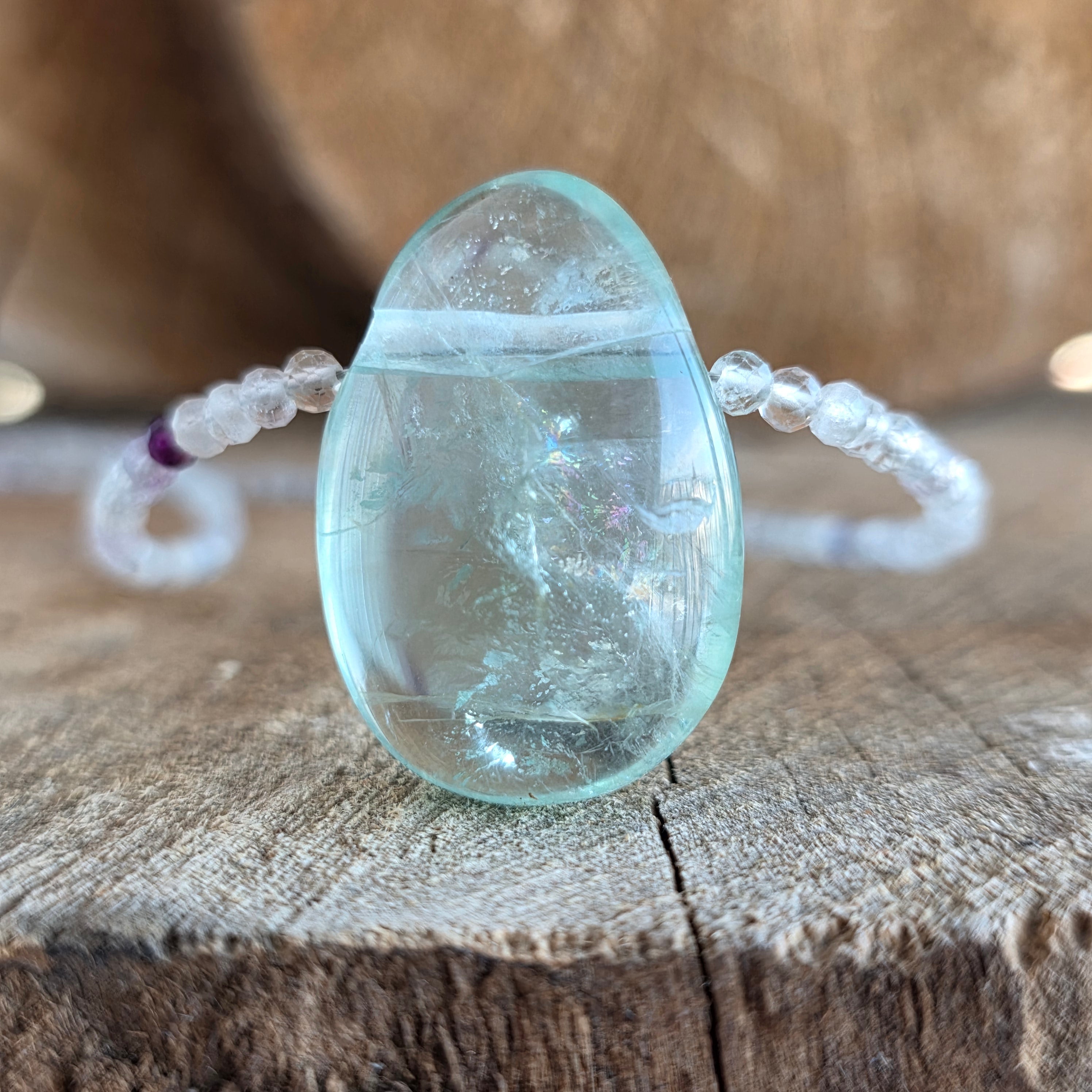 В традицията на кристалотерапията, флуоритът е свързан с умствената яснота, организирането на мислите и вътрешния баланс. Като се носи като бижу, той се възприема като деликатна подкрепа за концентрация и емоционална стабилност, без да засенчва естетическата красота на колието.