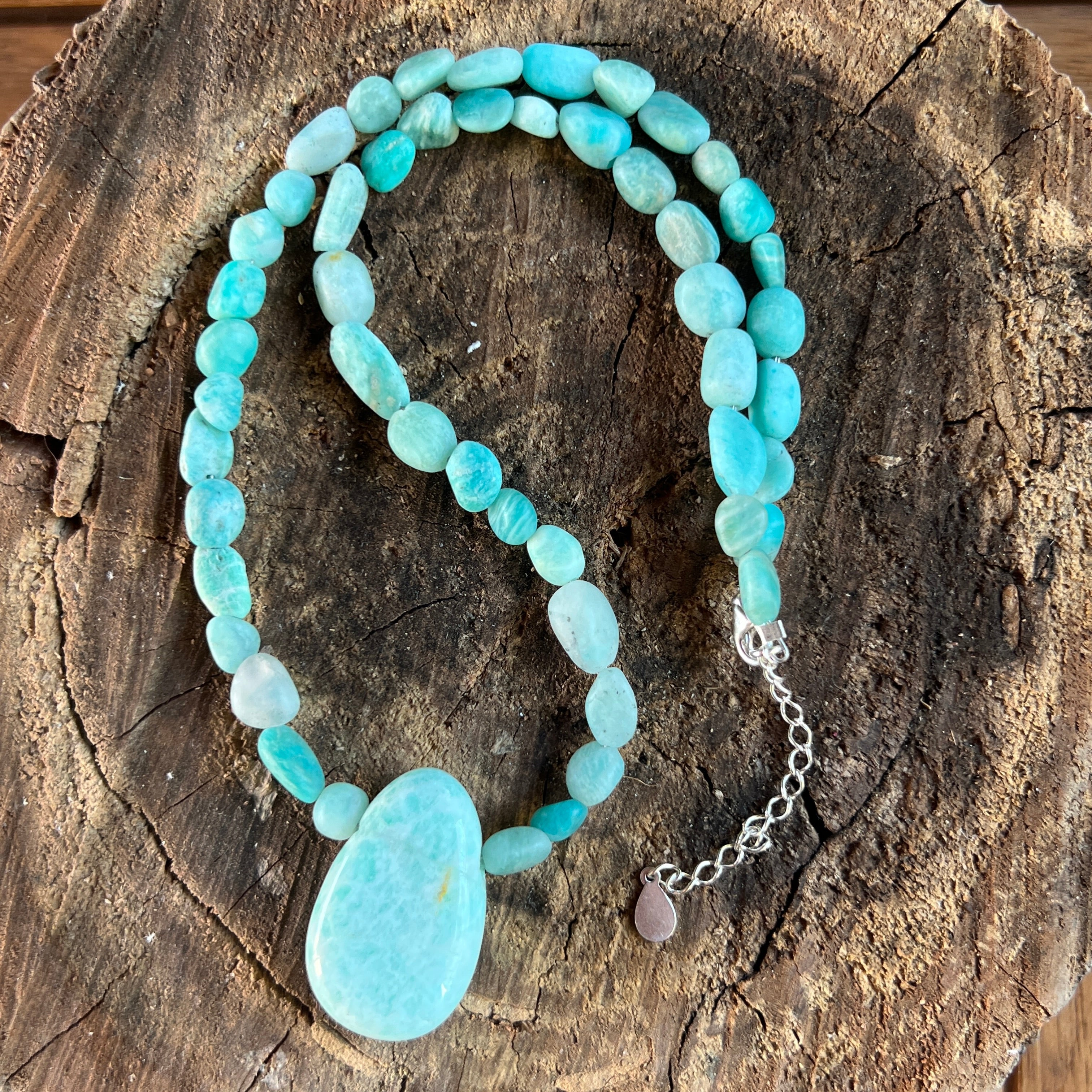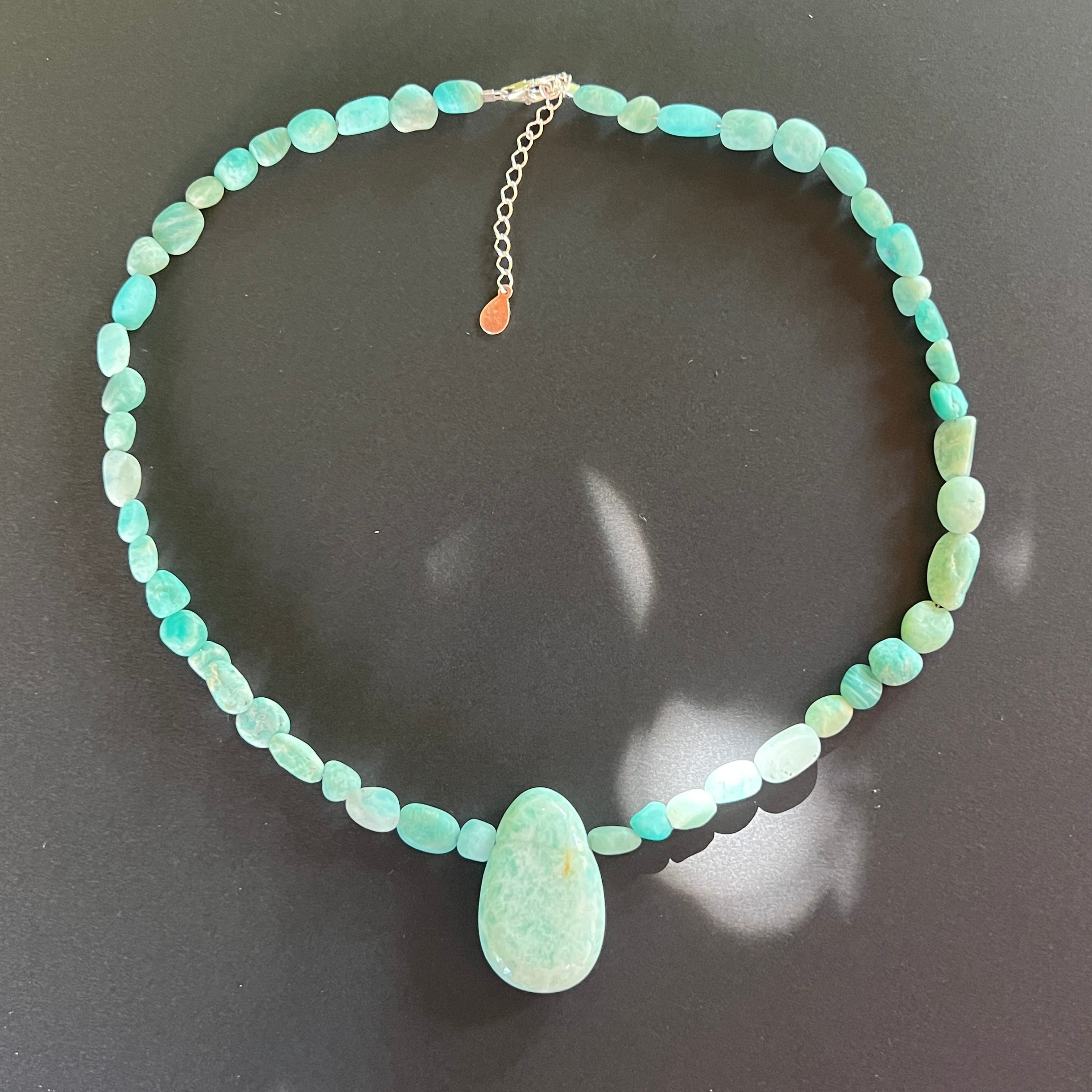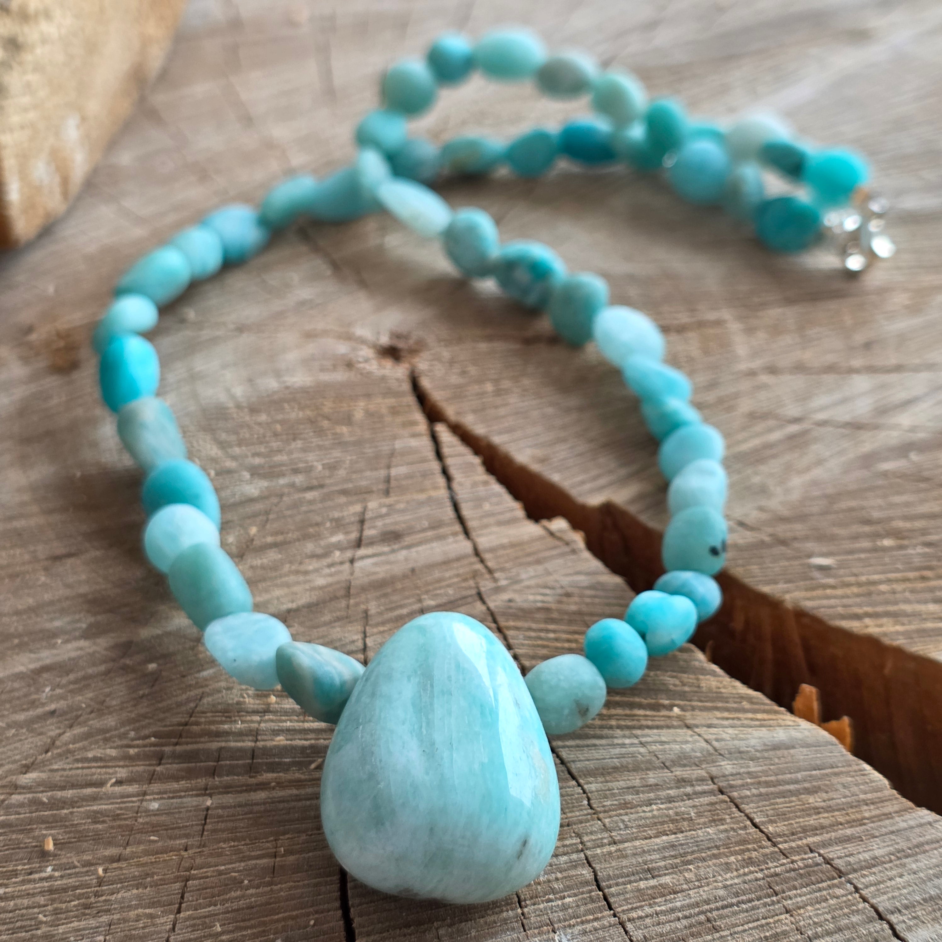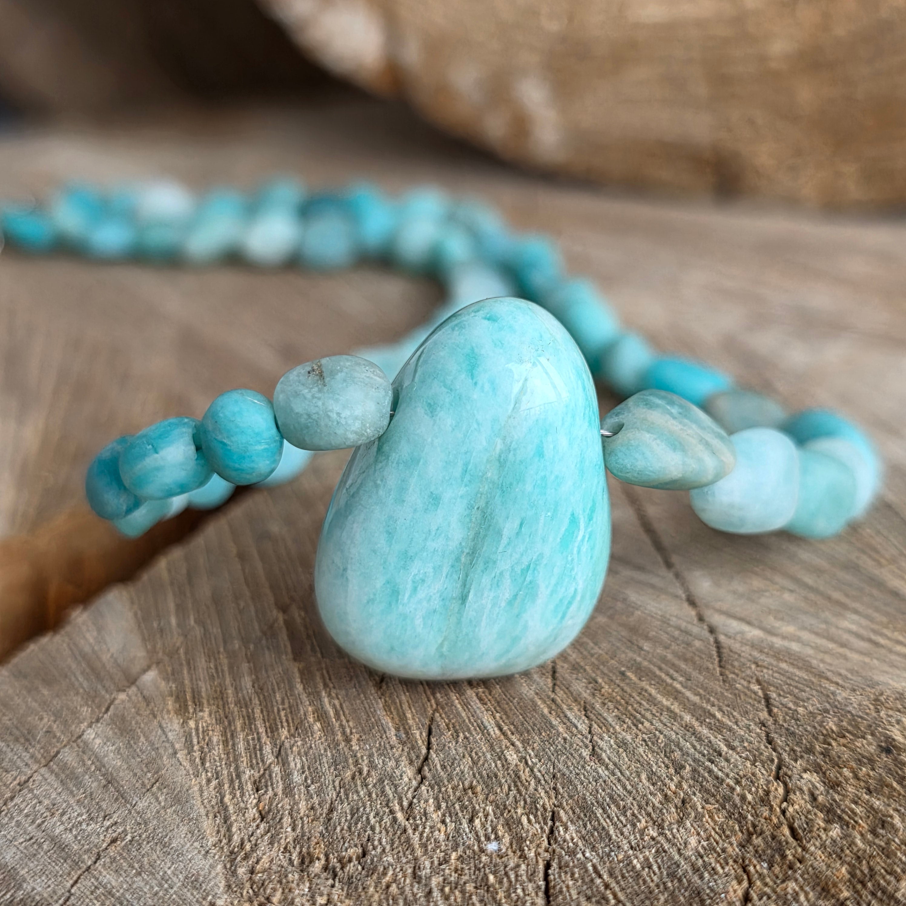 Колие с вибрацията на свещените реки и летното облачно небе – мощно, спокойно и наситено със смисъл. Мънистата от естествен амазонит, с диаметър между 8 и 10 мм, разкриват нюанси на сурово зелено-синьо, нарисувани от природата в несъвършени и автентични ритми.
