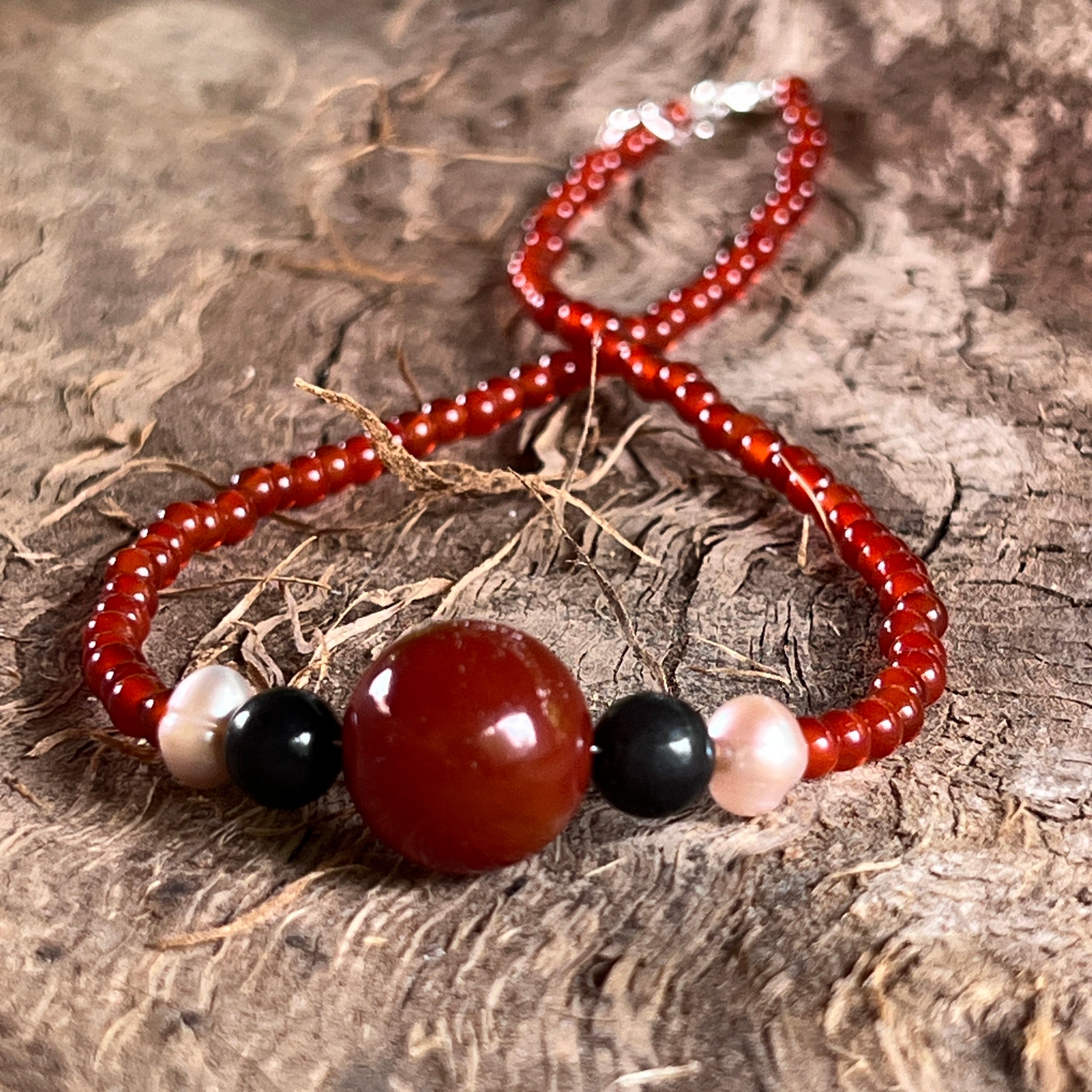 Всеки елемент е внимателно подбран, за да се създаде балансирано бижу: карнеолът енергизира и насърчава свободното изразяване, шунгитът защитава и стабилизира, а перлите придават спокойствие и деликатна женственост.