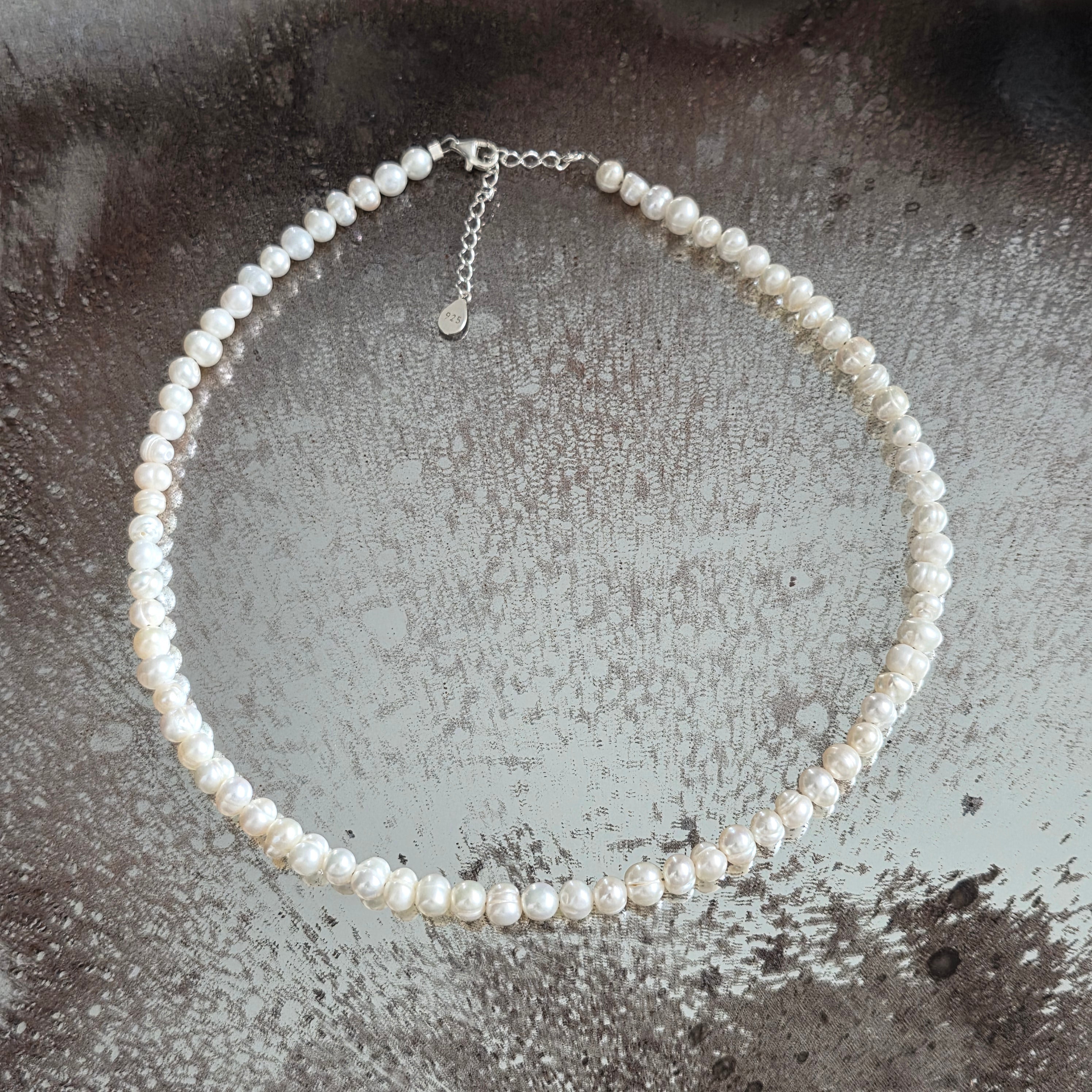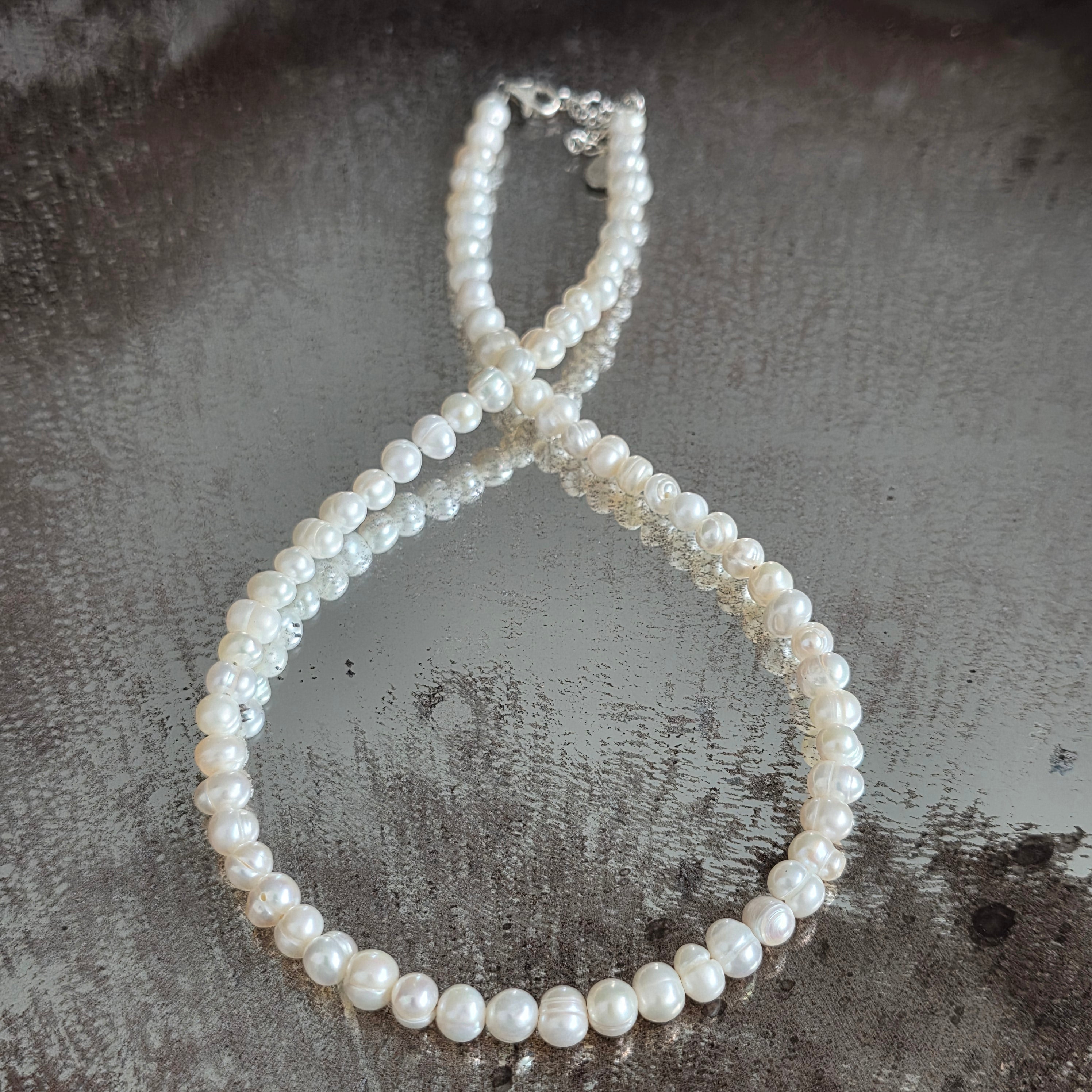 Материали: бели култивирани перли (сфера 6 мм), сребро 925, закопчалка тип лобстер от сребро