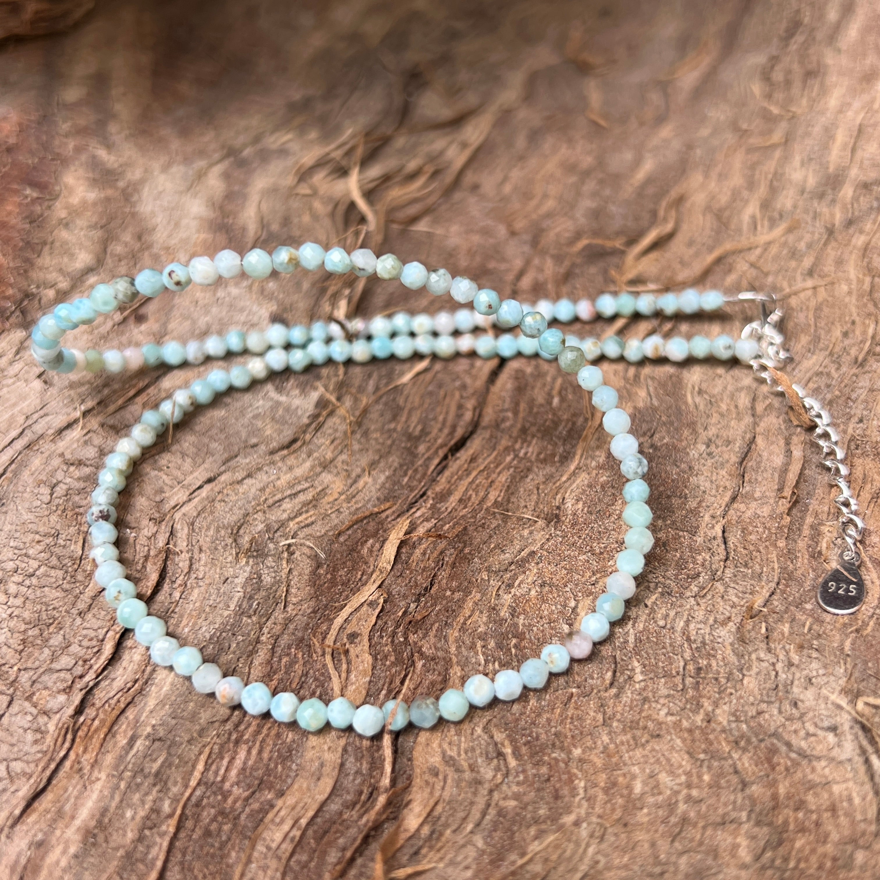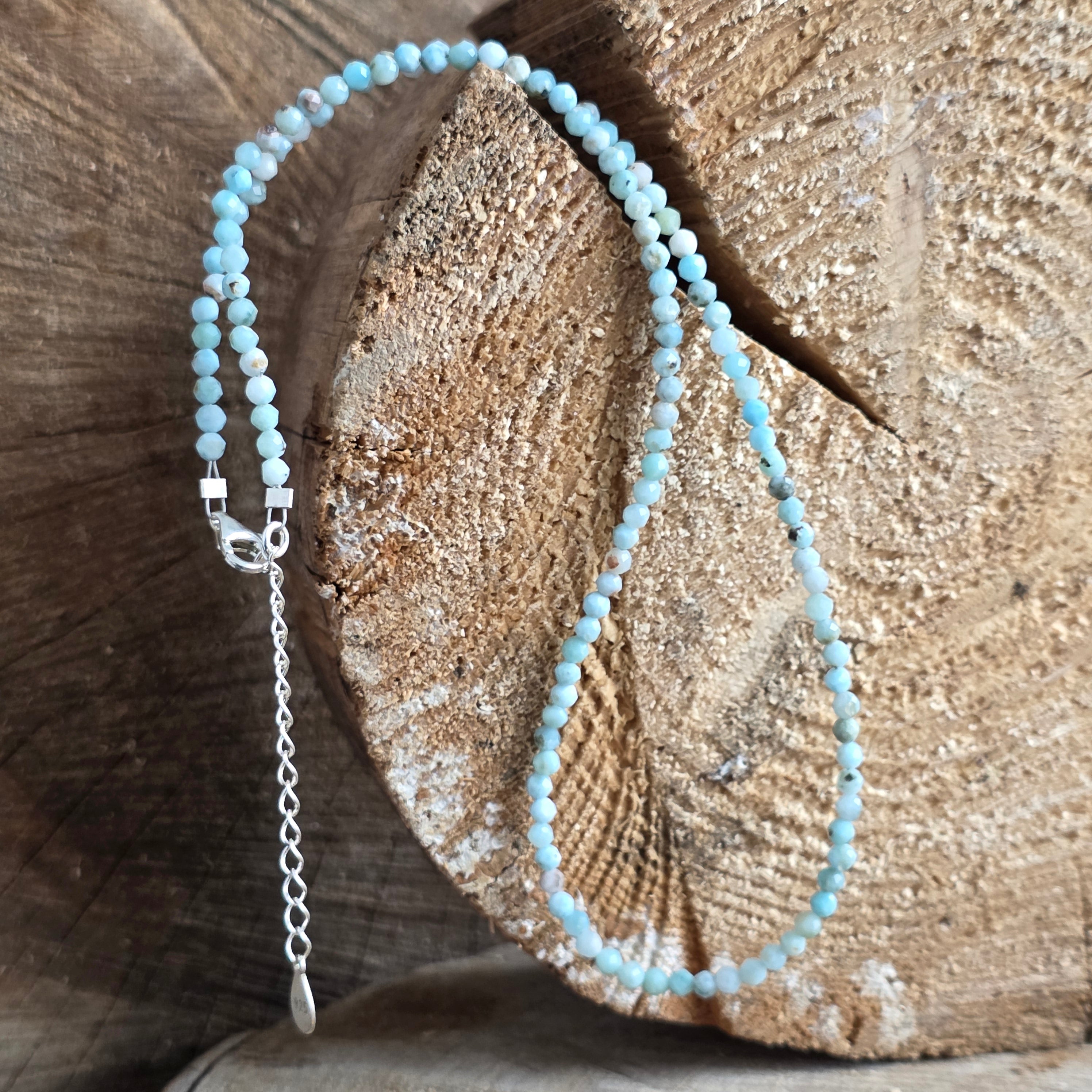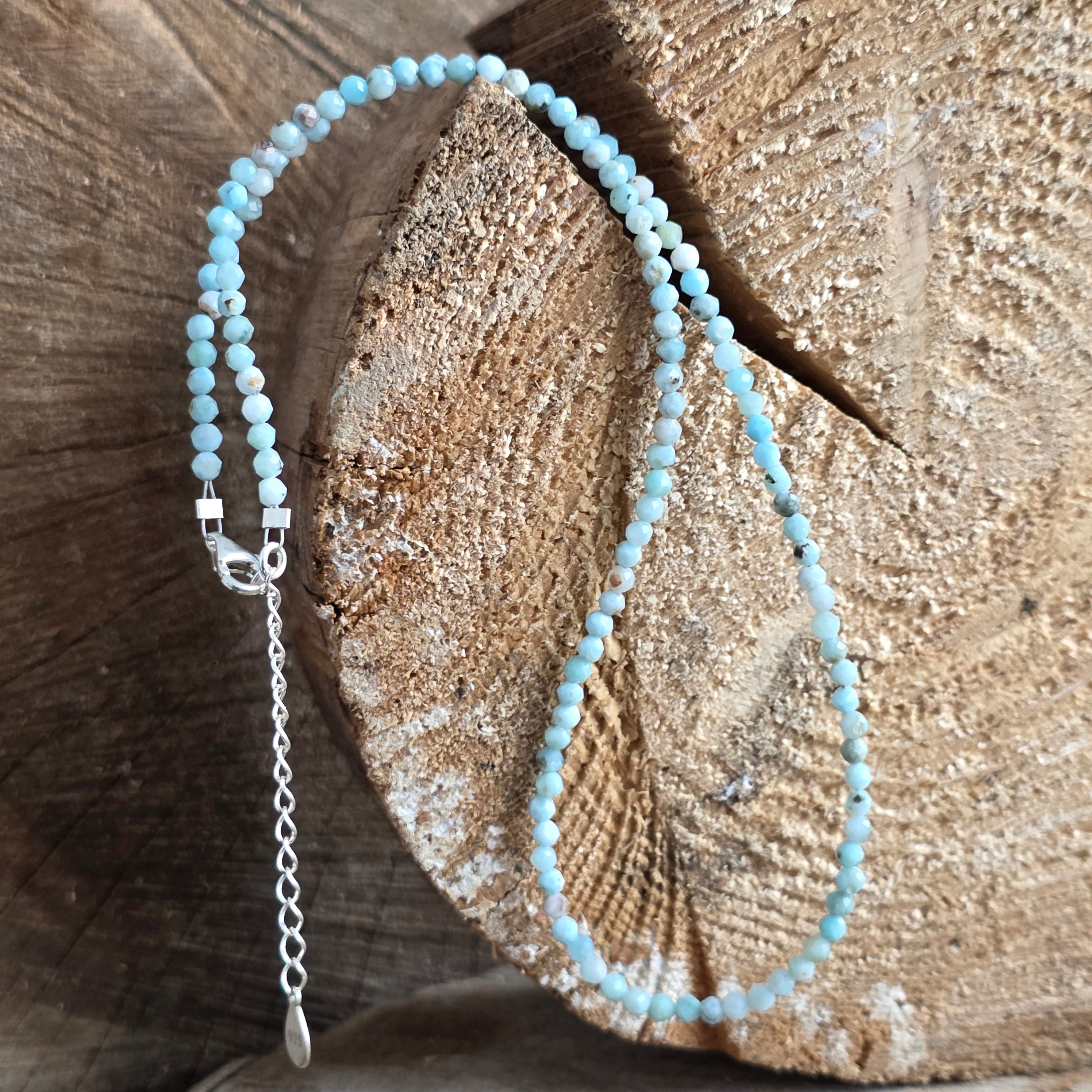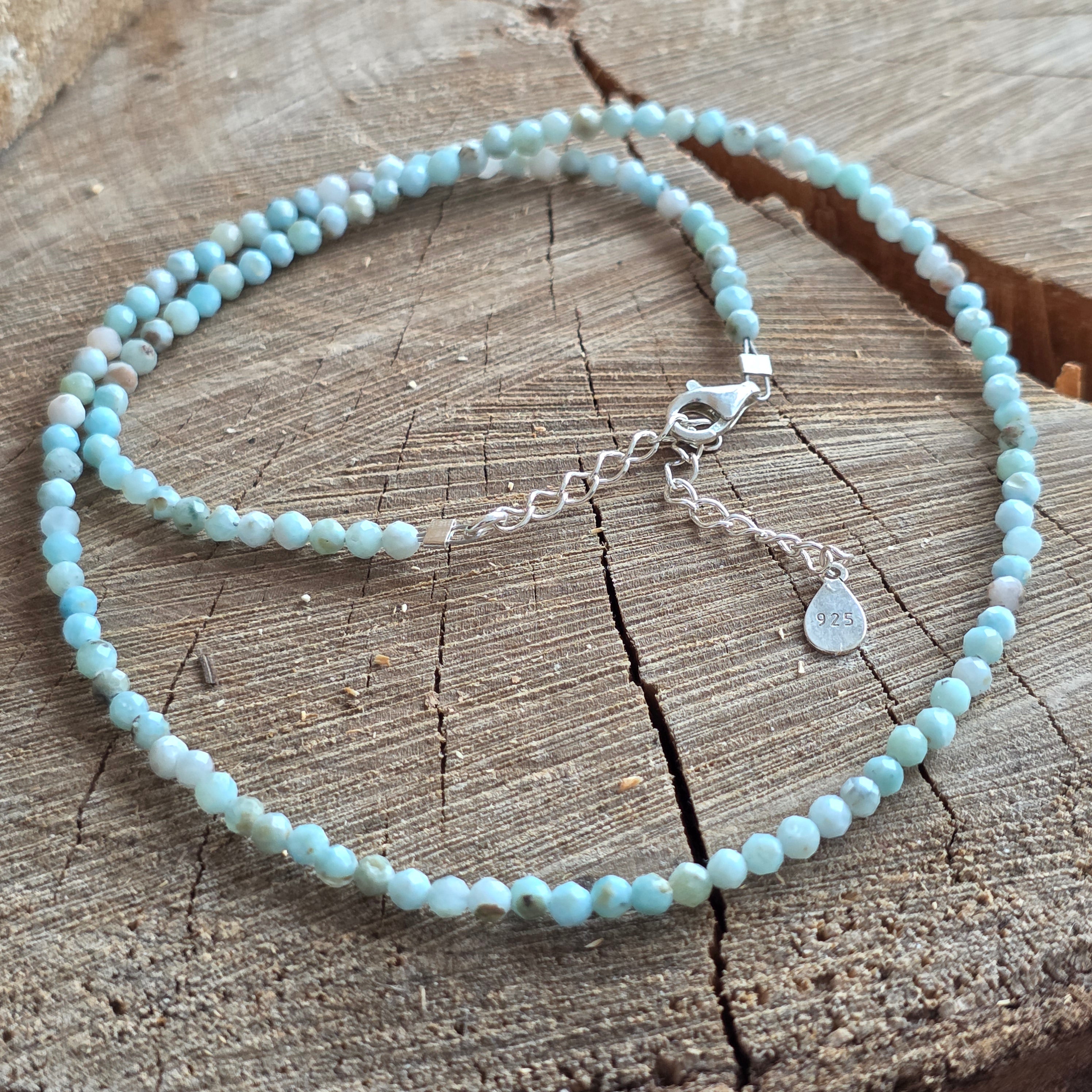 Колие като спомен от дълбините на океана – нежно, светло и мистериозно като тропически сън. Фасетирани мъниста от ларимар с размер 3 мм отразяват светлината в ефирни нюанси на небесно синьо и млечно бяло, като живопис на спокойни води.