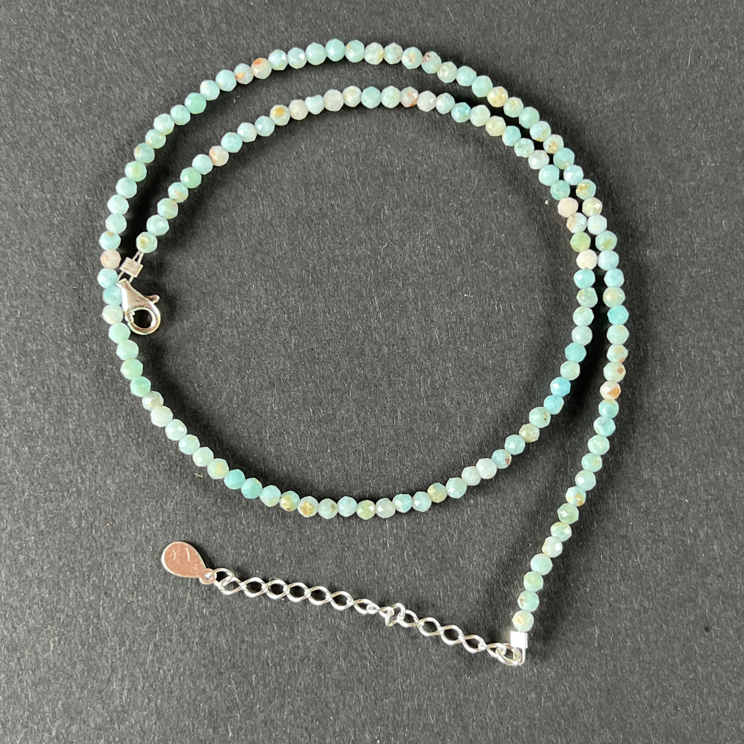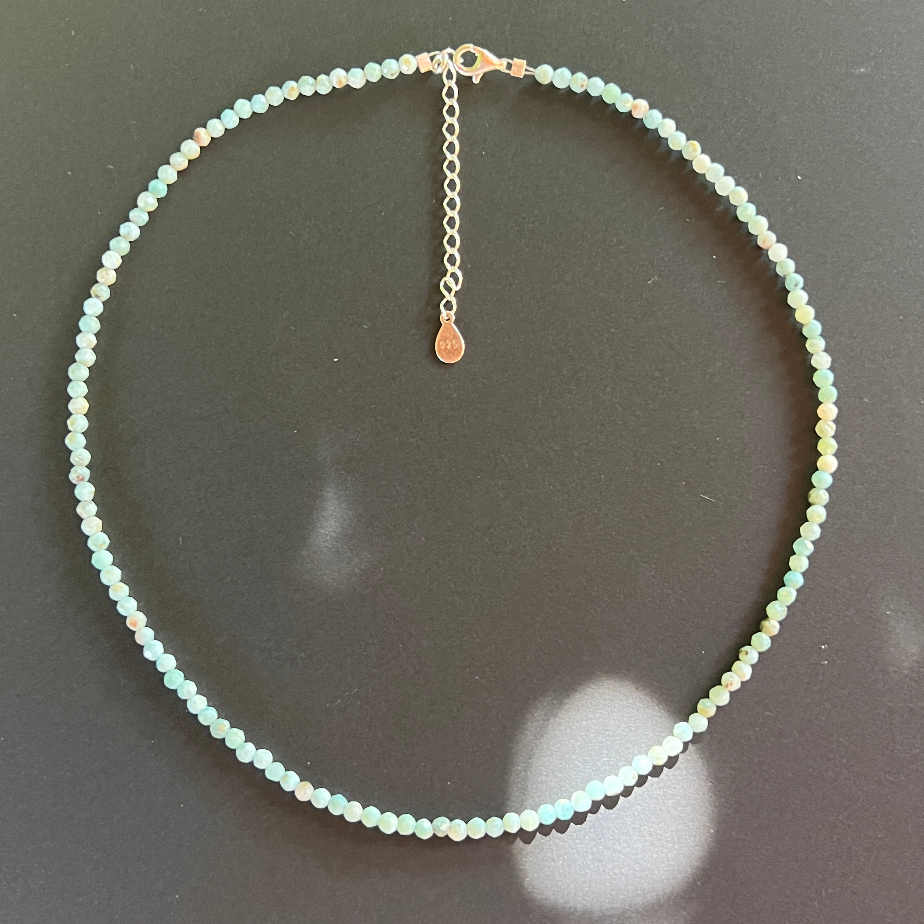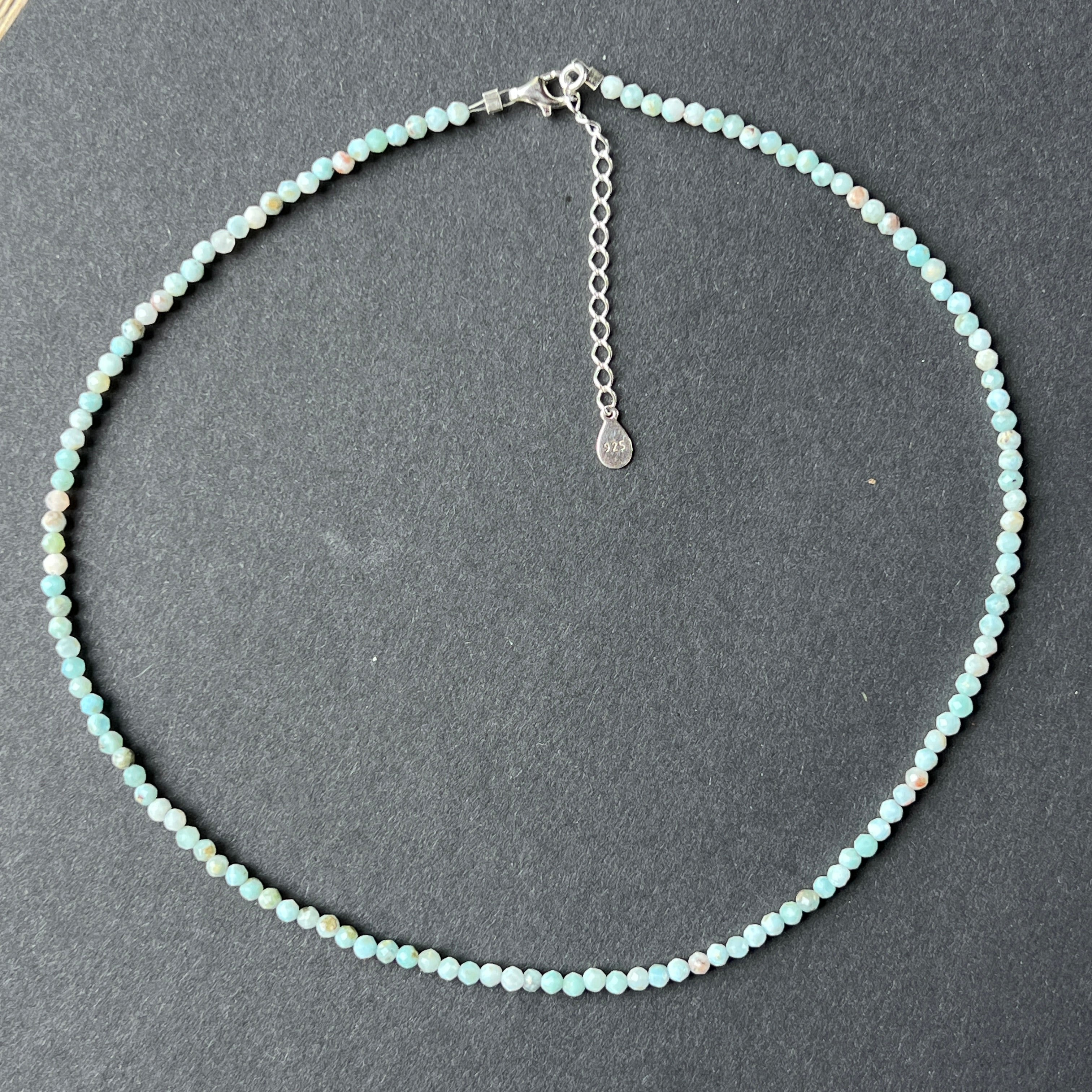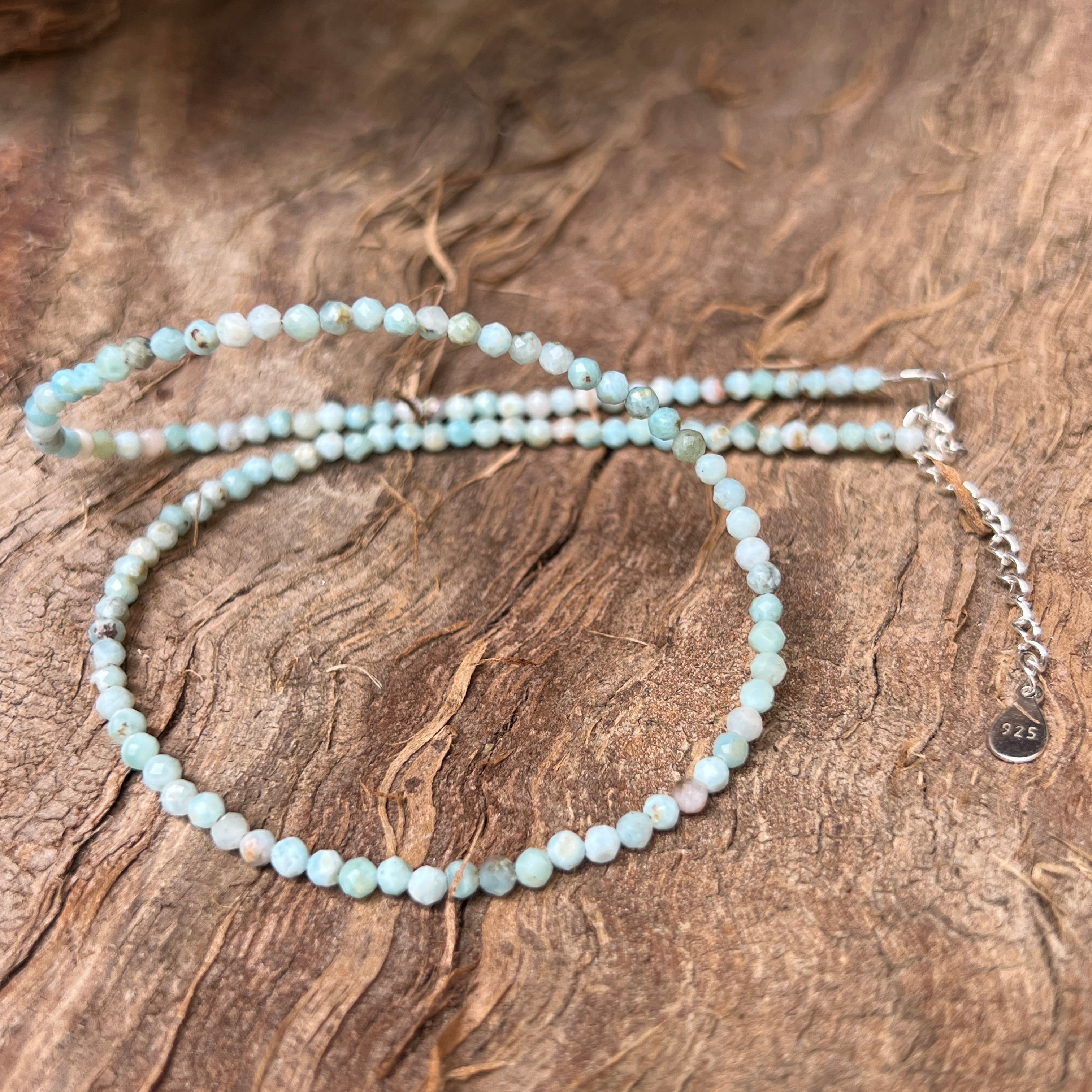 Колие като спомен от дълбините на океана – нежно, светло и мистериозно като тропически сън. Фасетирани мъниста от ларимар с размер 3 мм отразяват светлината в ефирни нюанси на небесно синьо и млечно бяло, като живопис на спокойни води.