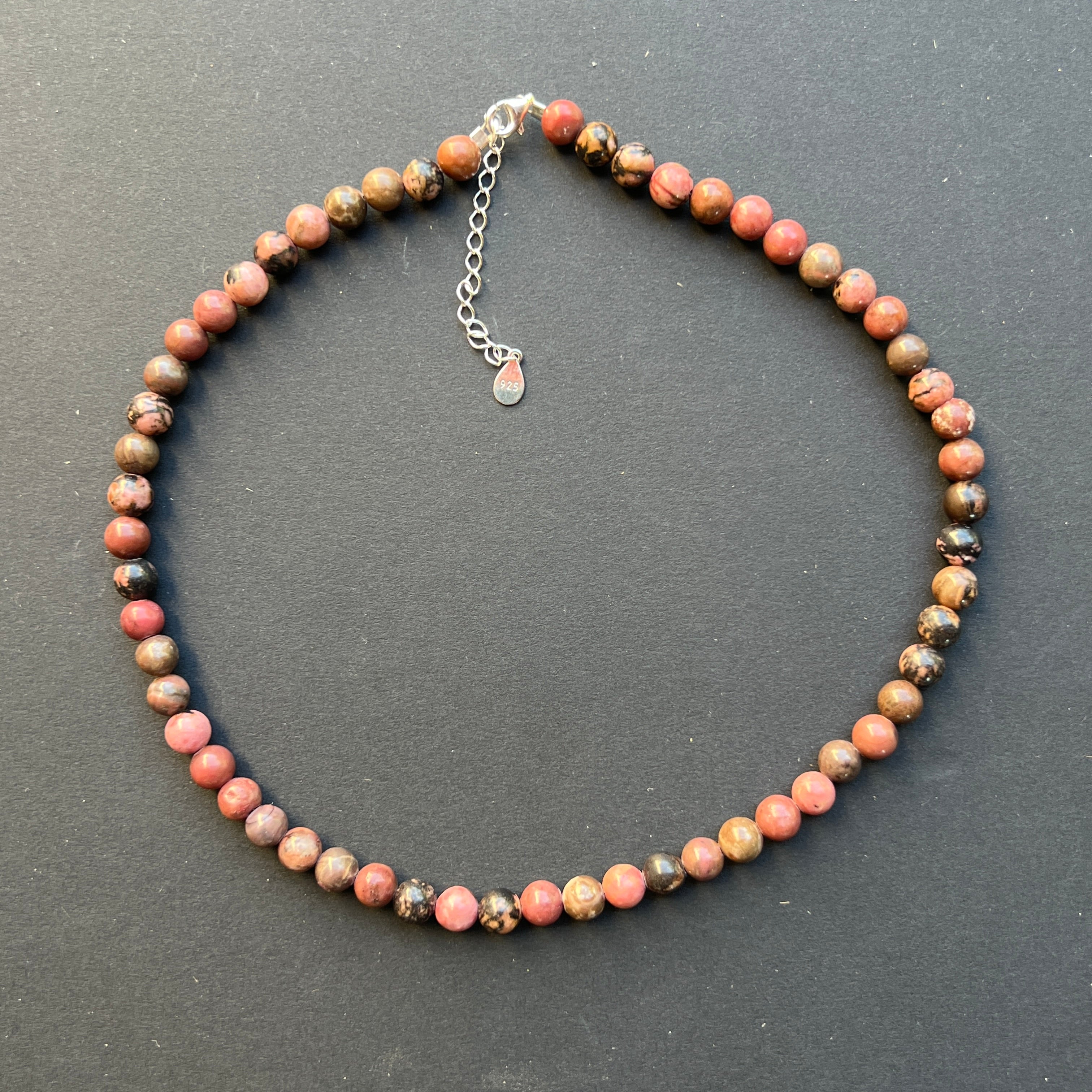 Колие, което носи със себе си сърцето на корена – там, където крехкостта се среща със силата, а болката се преобразява в нежност. Изработено от естествен родонит с топчета от 6 мм, колието обгръща шията с топло и дълбоко присъствие, като мълчаливо обещание за утеха.