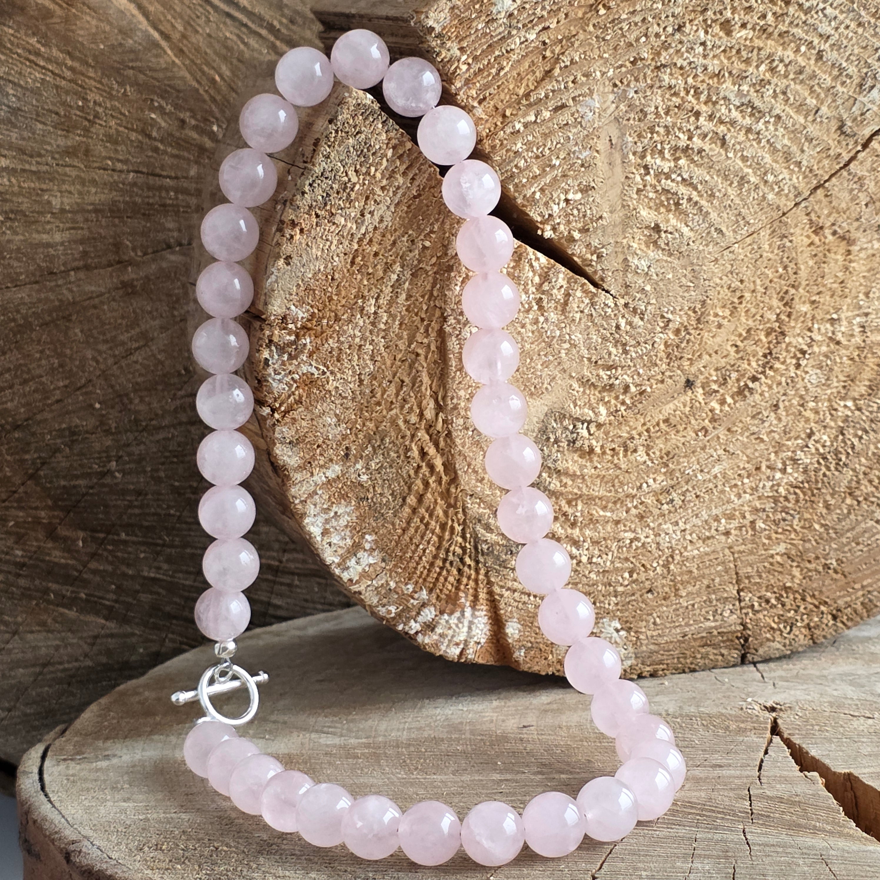 Материали: естествен полиран розов кварц (сфери 10 мм), закопчаване от сребро
