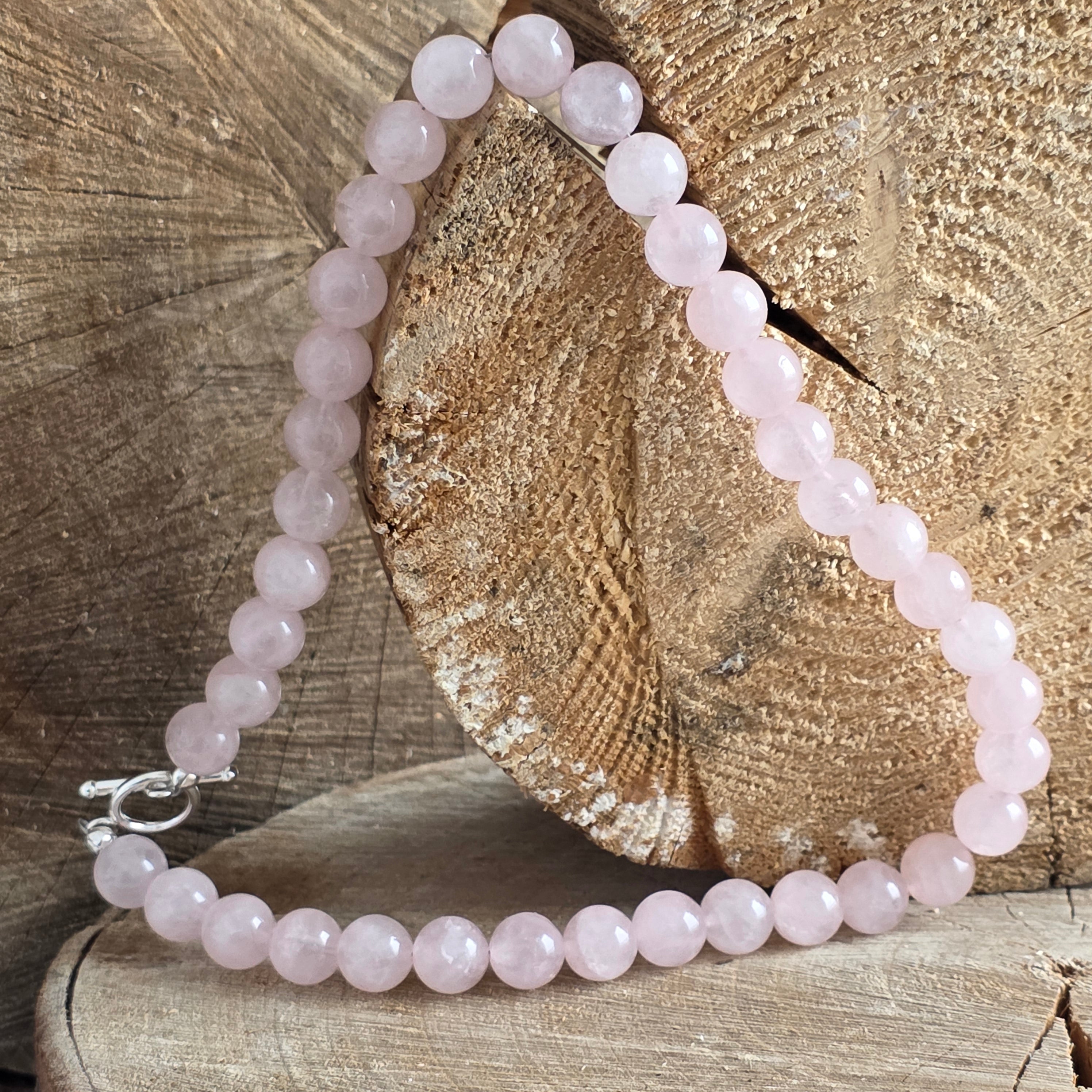 Изработено изцяло от сфери от естествен розов кварц, колието носи в светлината същността на мекотата и безусловната любов. Всяка сфера от 10 мм, внимателно подбрана и излъскана, съхранява в себе си топъл мир, като сърце, което бие в хармония с вселената.