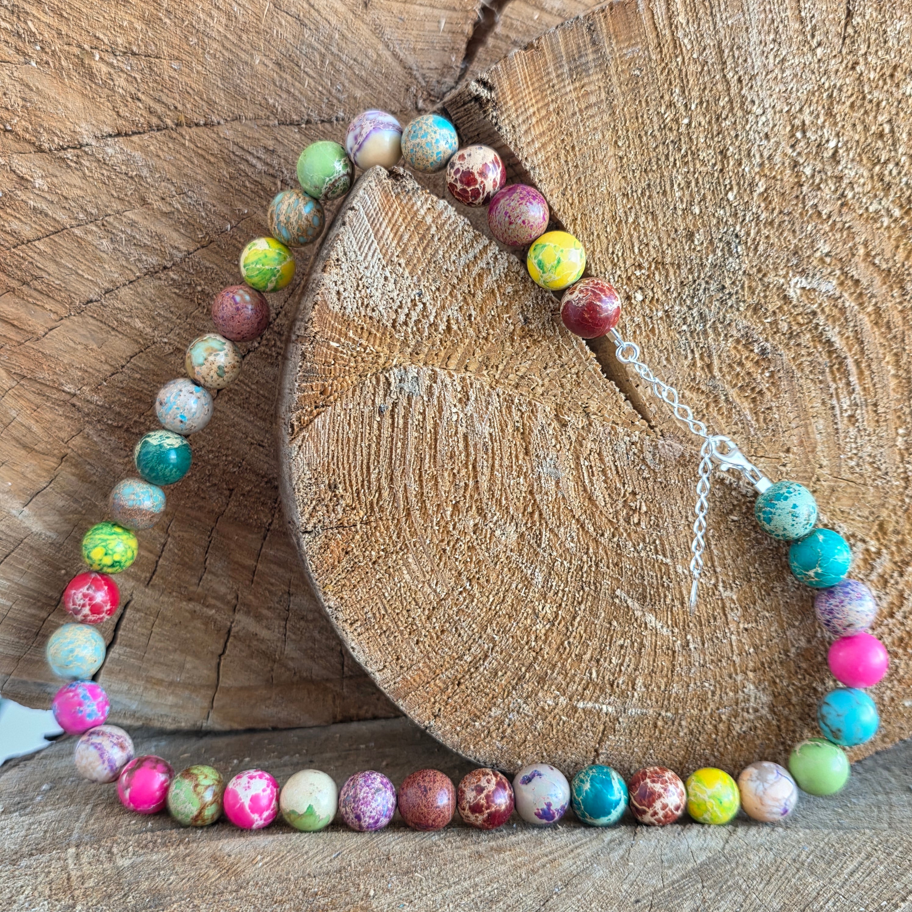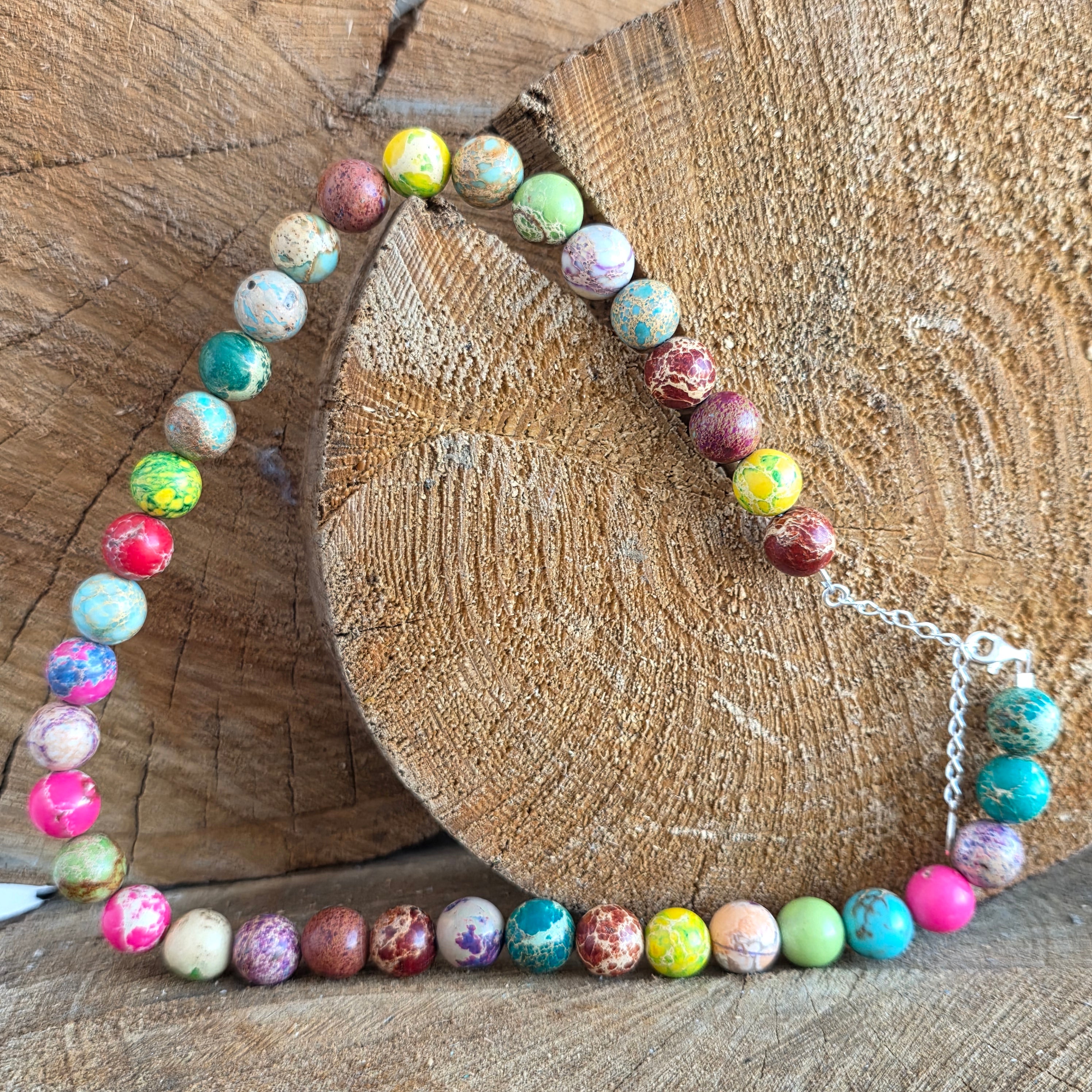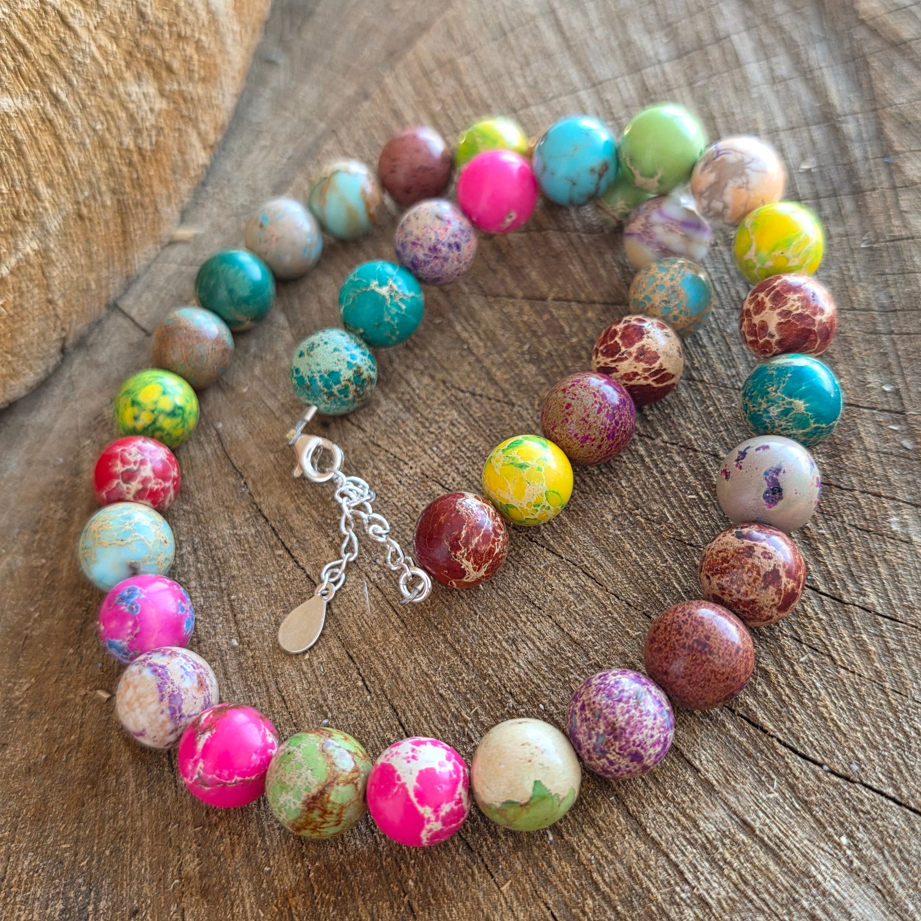 Това колие от роялит съчетава разнообразни и хармонични нюанси, подредени под формата на шлифовани топчета, всяко със своята цветова индивидуалност. Роялитът, с мраморното си излъчване и естествената игра на цветове – от тюркоазено и зелено до топли тонове на кафяво, кремаво или рижаво – създава изразителен бижу аксесоар с артистичен и леко кралски вид, както подсказва и името му.