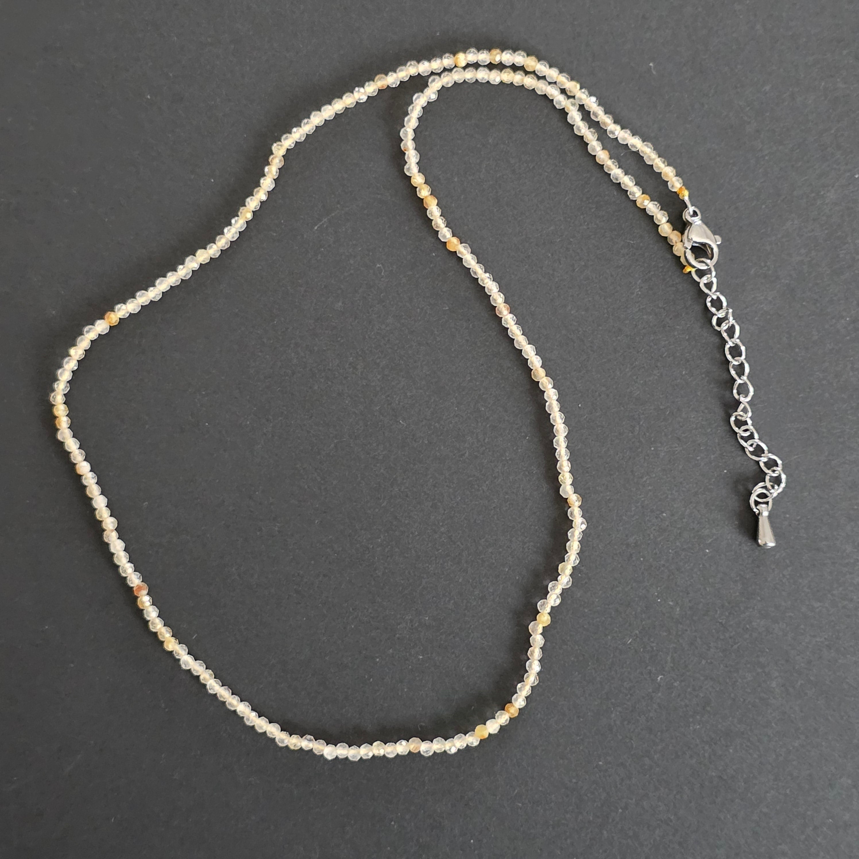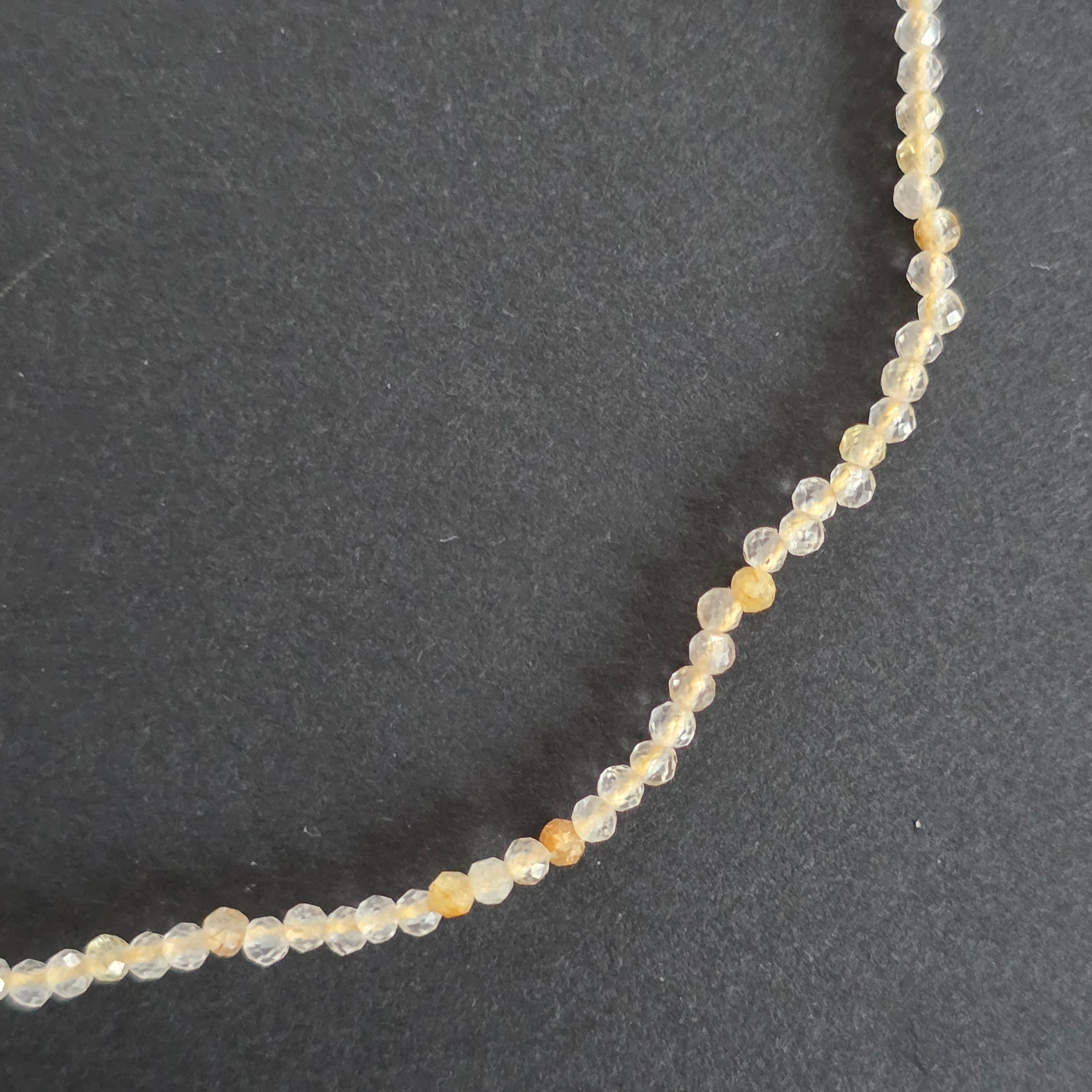 Деликатно и слънчево колие, ценено за топлия си блясък и меката светлина, която отразява. Пастелните жълти нюанси, полупрозрачни и леко иризиращи, придават на колието чист, светъл, почти ефирен вид. Всяка фасетирана сферичка създава дискретна игра на отблясъци, превръщайки бижуто в елегантен аксесоар, идеален за ценителите на фини и естествени бижута.