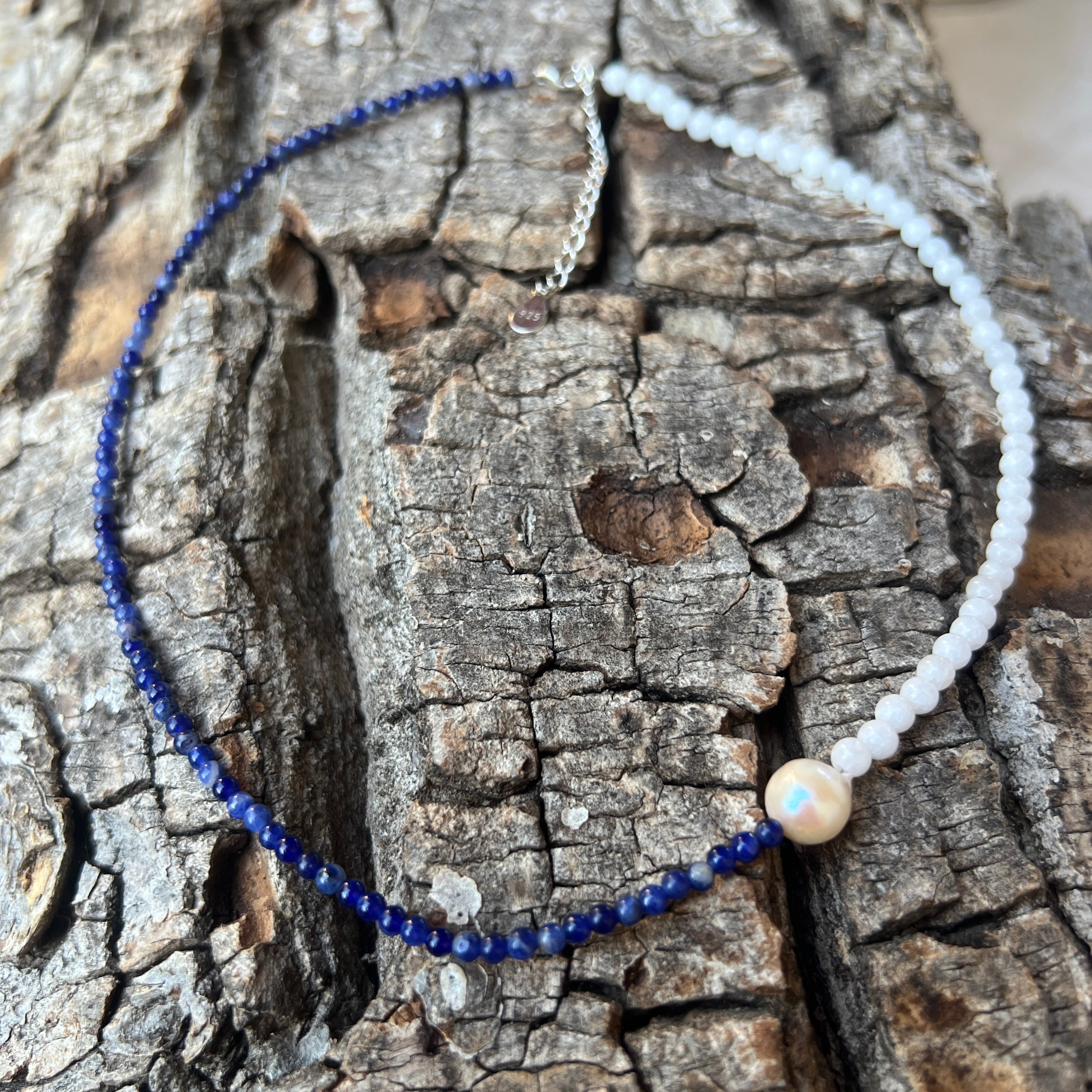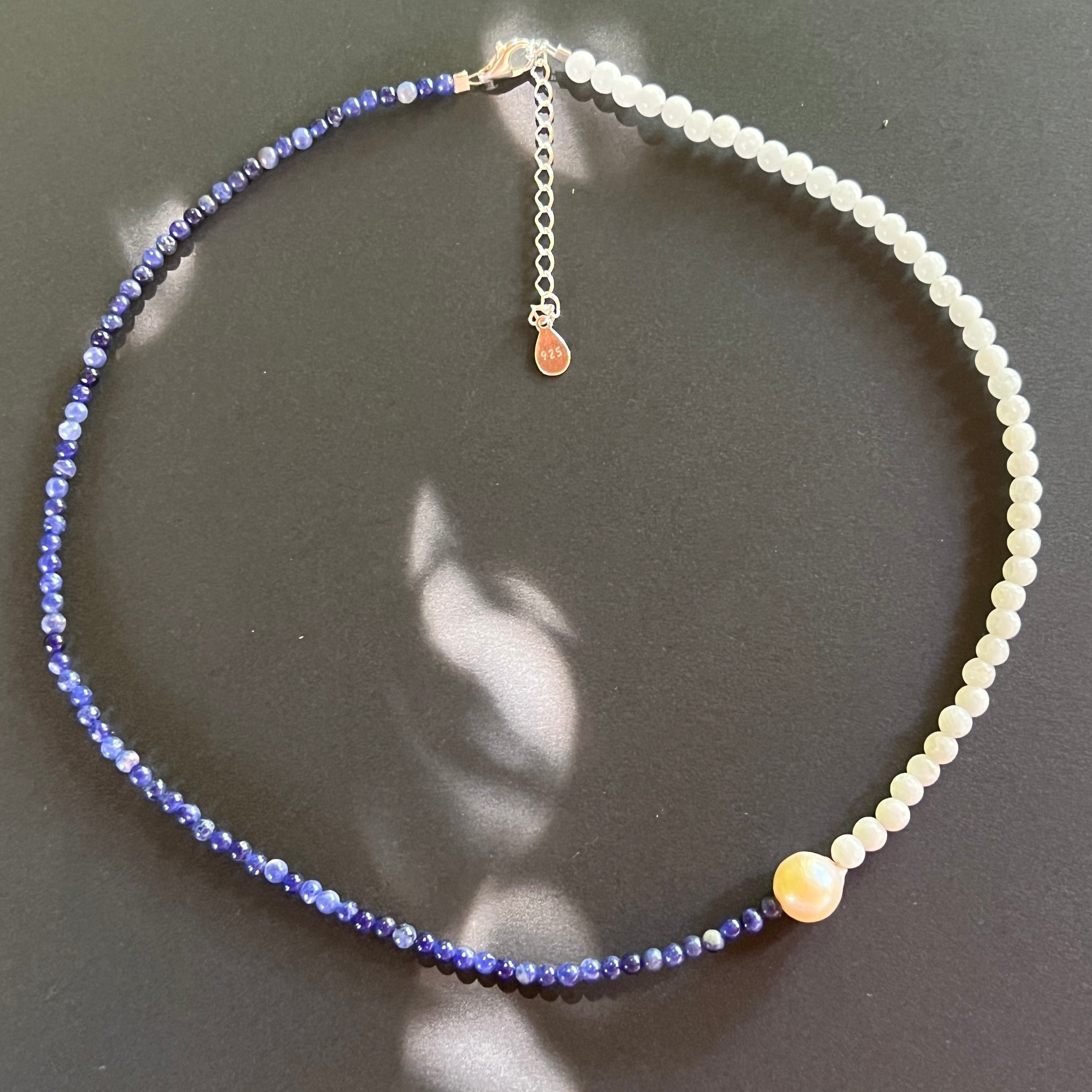 60% от колието се състои от 3 мм кръгли содалитни сфери, с нюанси на тъмно синьо, в които сякаш се носят малки фрагменти от нощно небе и бял мрамор. Малки, но интензивни, тези камъни създават нишка от ясни мисли и тиха интроспекция.