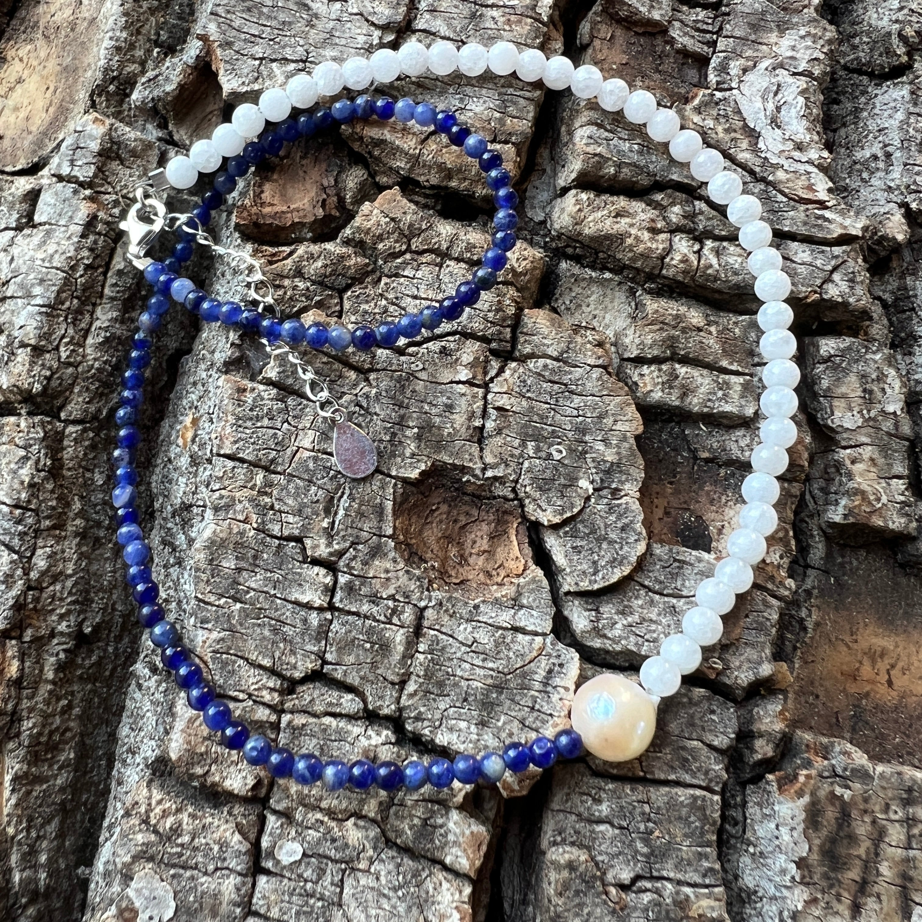 Содалит се счита за камък на ясния ум, на автентичната комуникация и на интроспекцията. Бял жад предлага лек защита и вътрешен мир, насърчавайки мъдростта, която идва от тишината. А перлата добавя нотка на несъвършена чистота, обединявайки всичко в една нишка смисъл.
