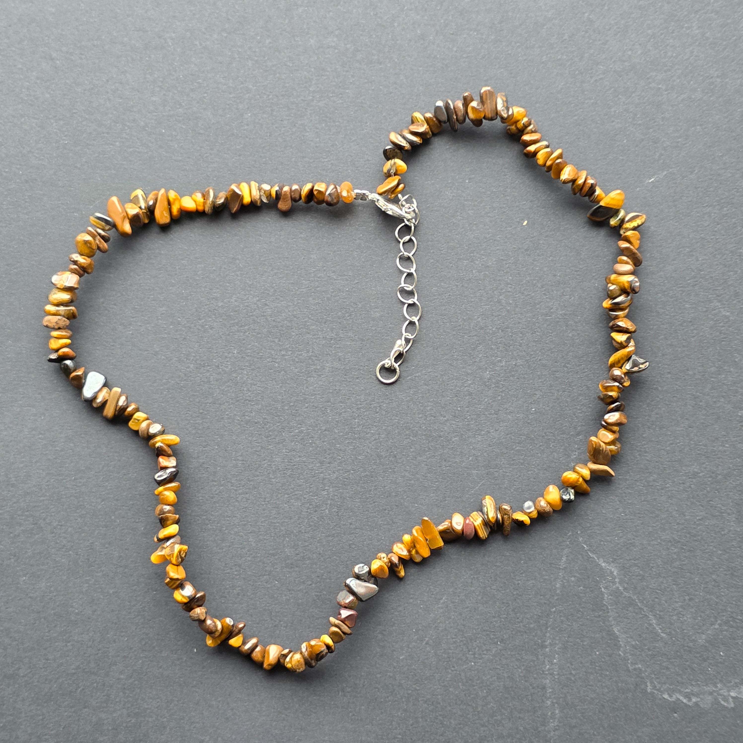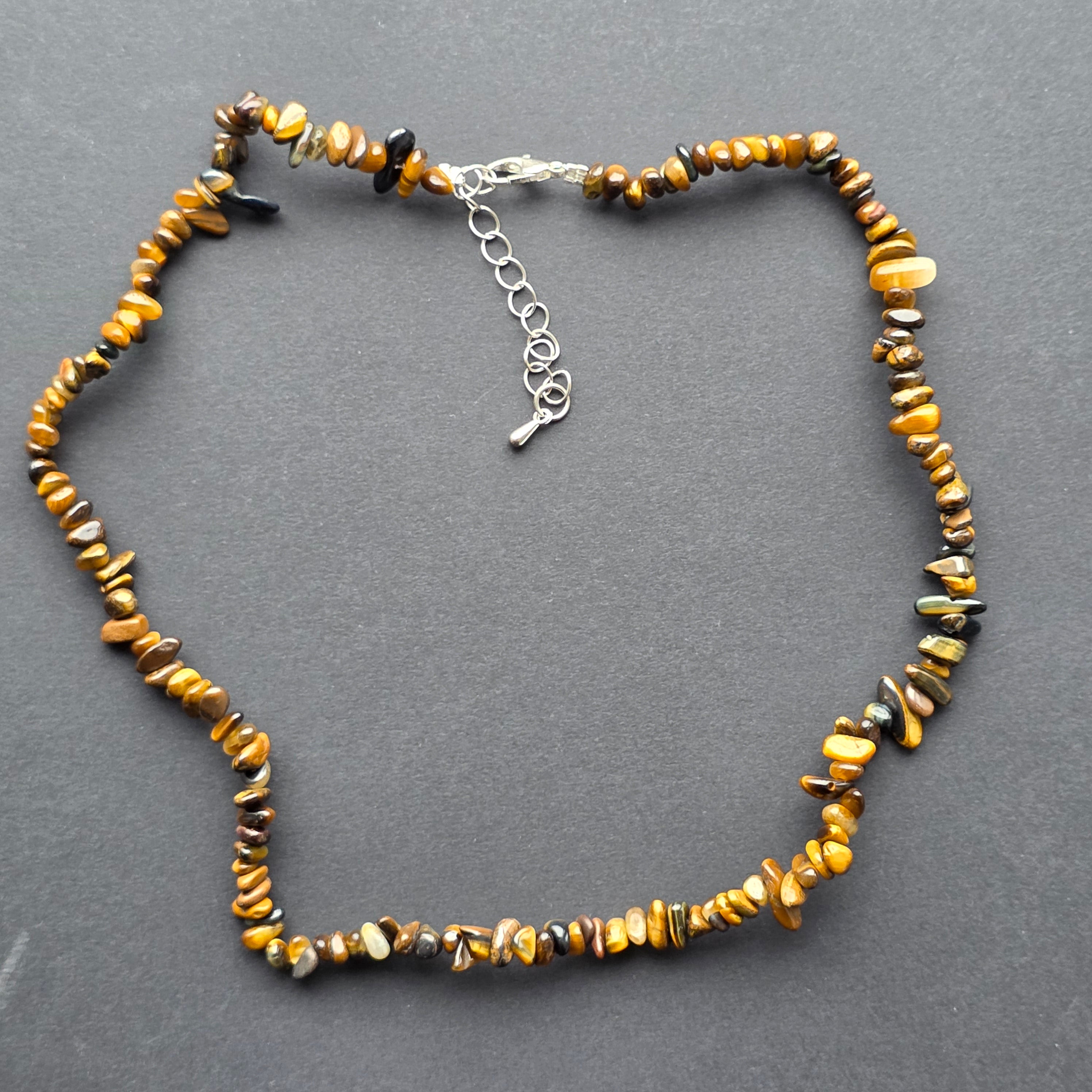 Колие, изпълнено с визуална сила, създадено от чипове естествено тигрово око – един от най-обичаните кристали благодарение на оптичния ефект „котешко око“ и топлите си златисто-кафяви тонове. Всяко парче камък улавя светлината по различен начин, създавайки живо, динамично усещане с отражения, които се движат със собственика.