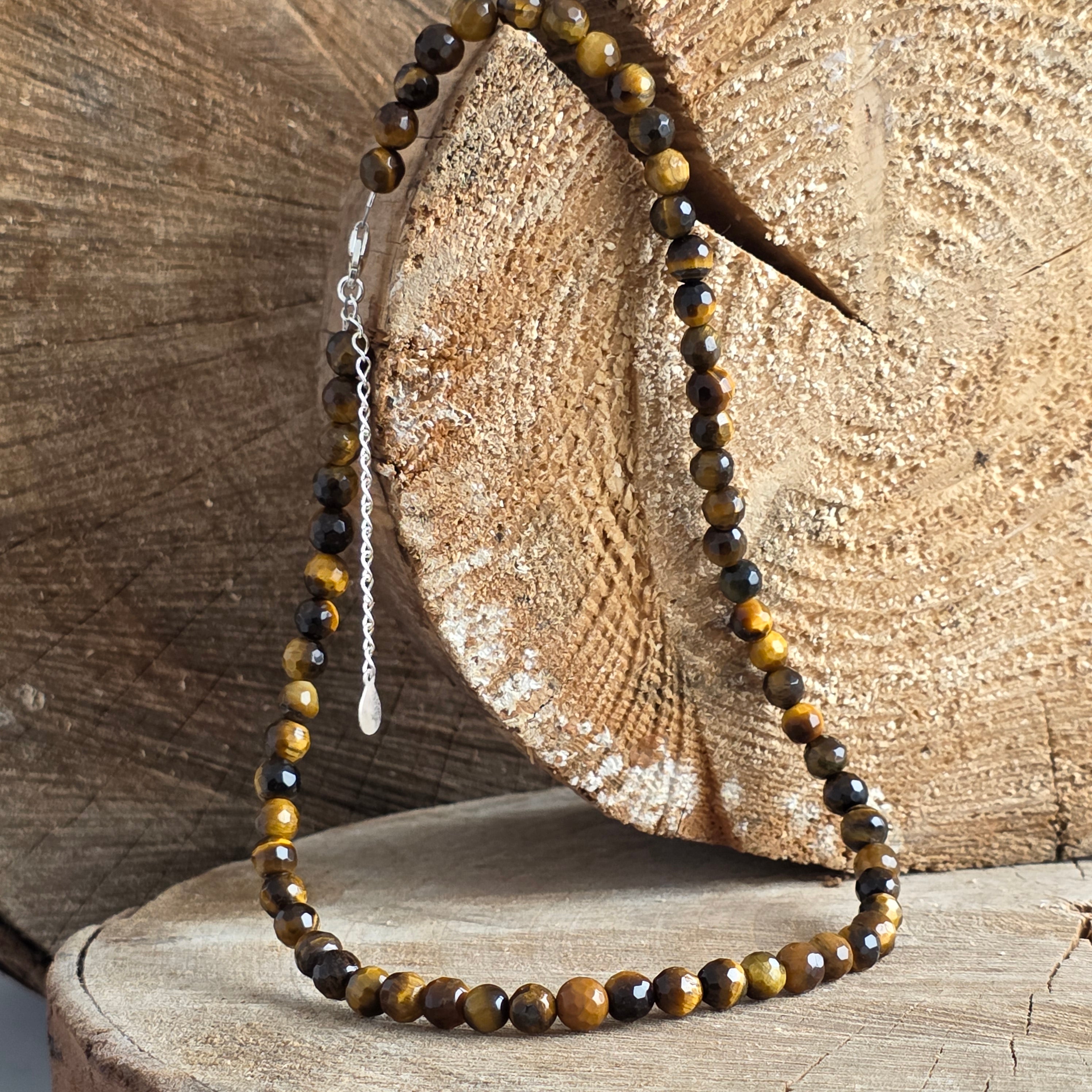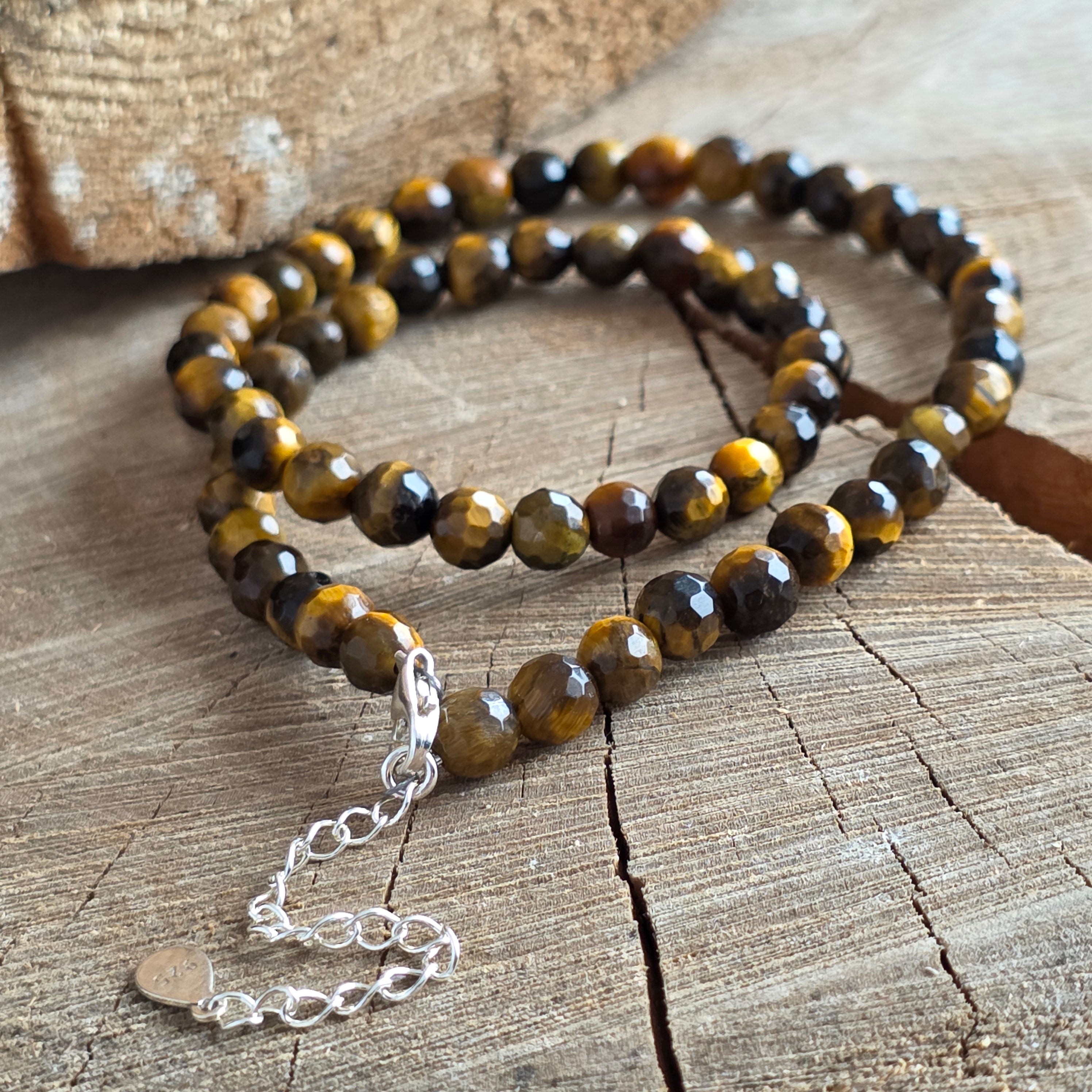 Бижу, което излъчва нюанси на злато и медни отблясъци – като слънчеви лъчи, преминаващи през гъстите листа на свещена гора. Това колие от фасетирано тигрово око, с мъниста от 6 мм, разкрива деликатен блясък, като обещание, прошепнато от самата земя.