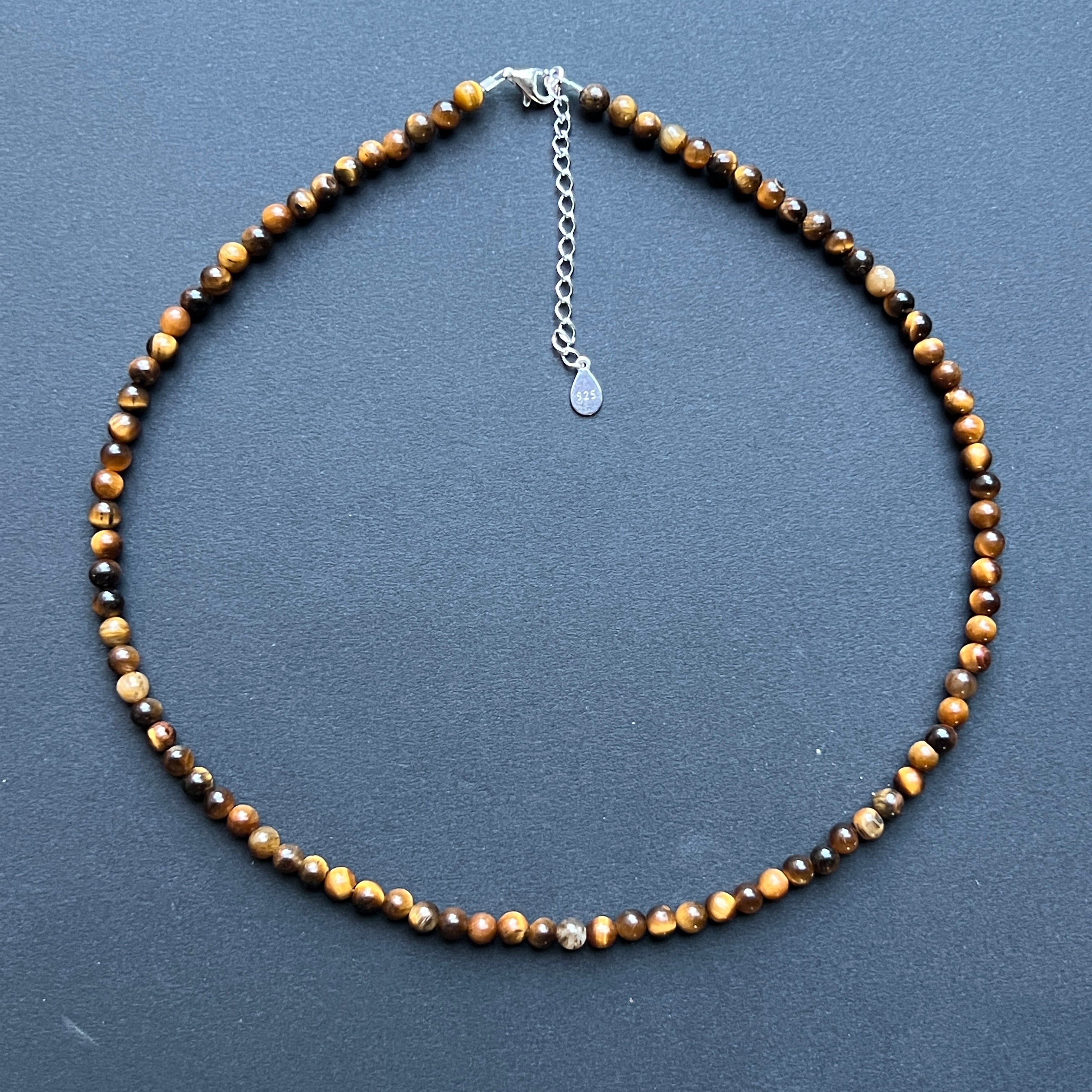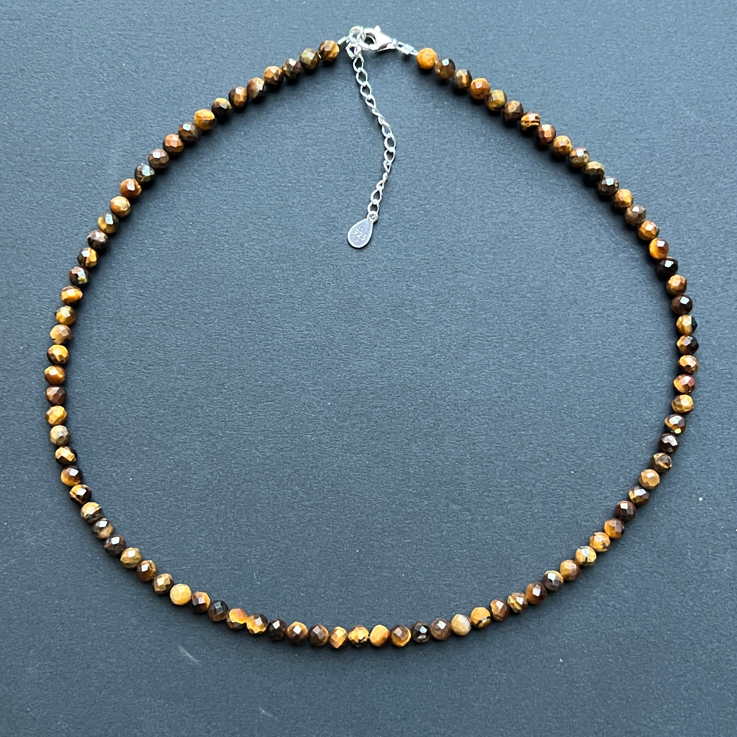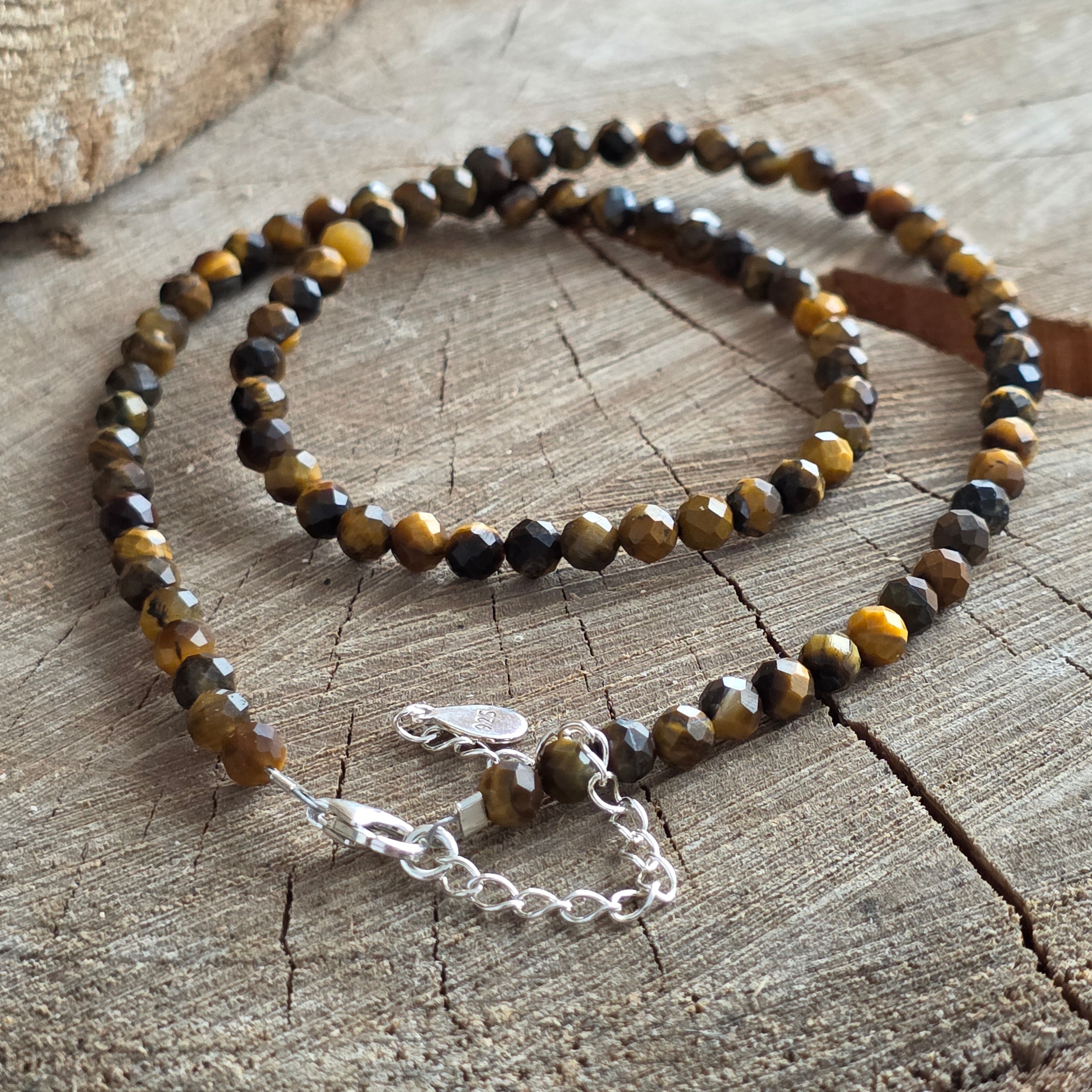 Бижу, което излъчва нюанси на злато и мед – като лъчи, преминаващи през гъстите листа на свещена гора. Това колие от фасетирано тигрово око с мъниста от 4 мм разкрива деликатен блясък, подобно на обещание, произнесено шепне от самата земя.