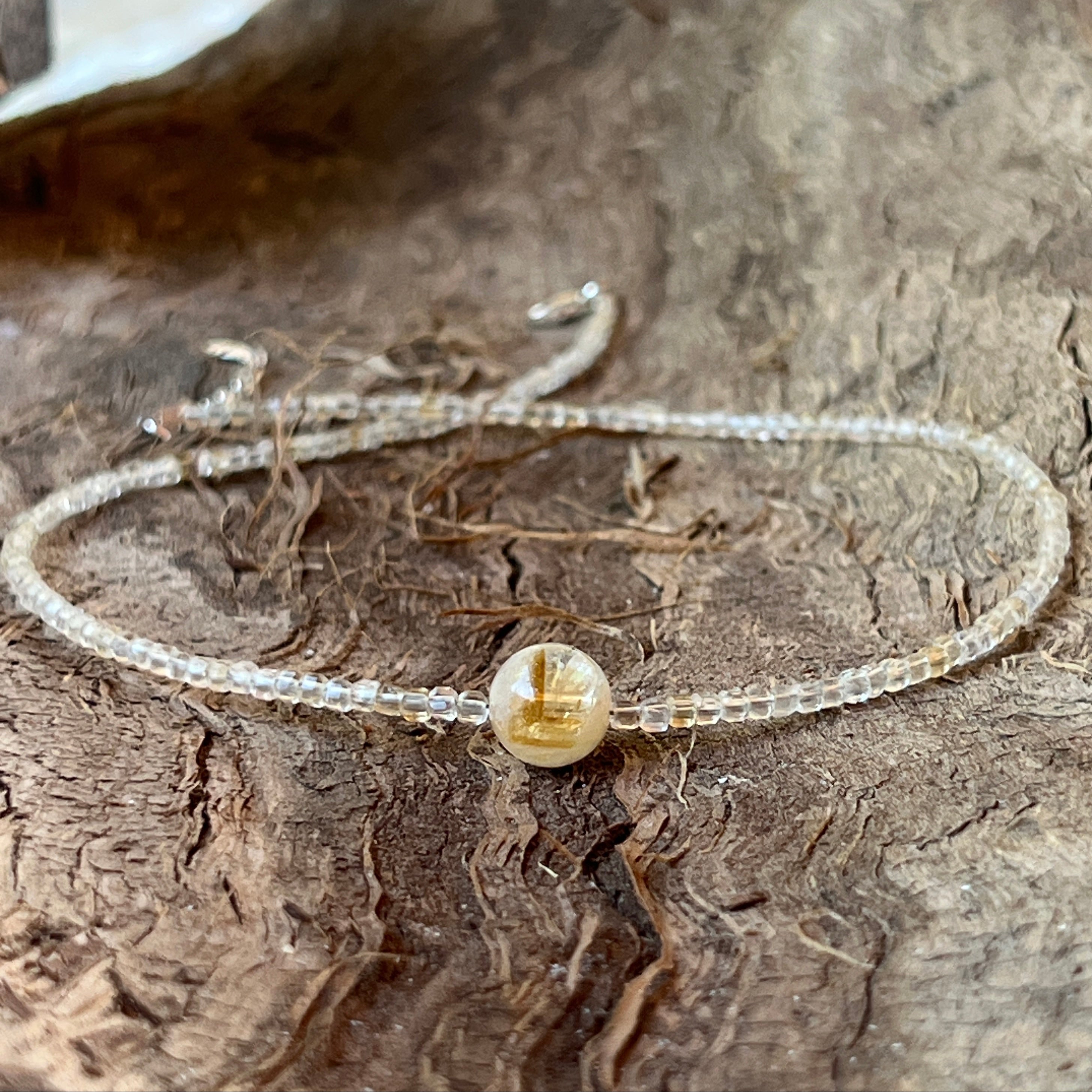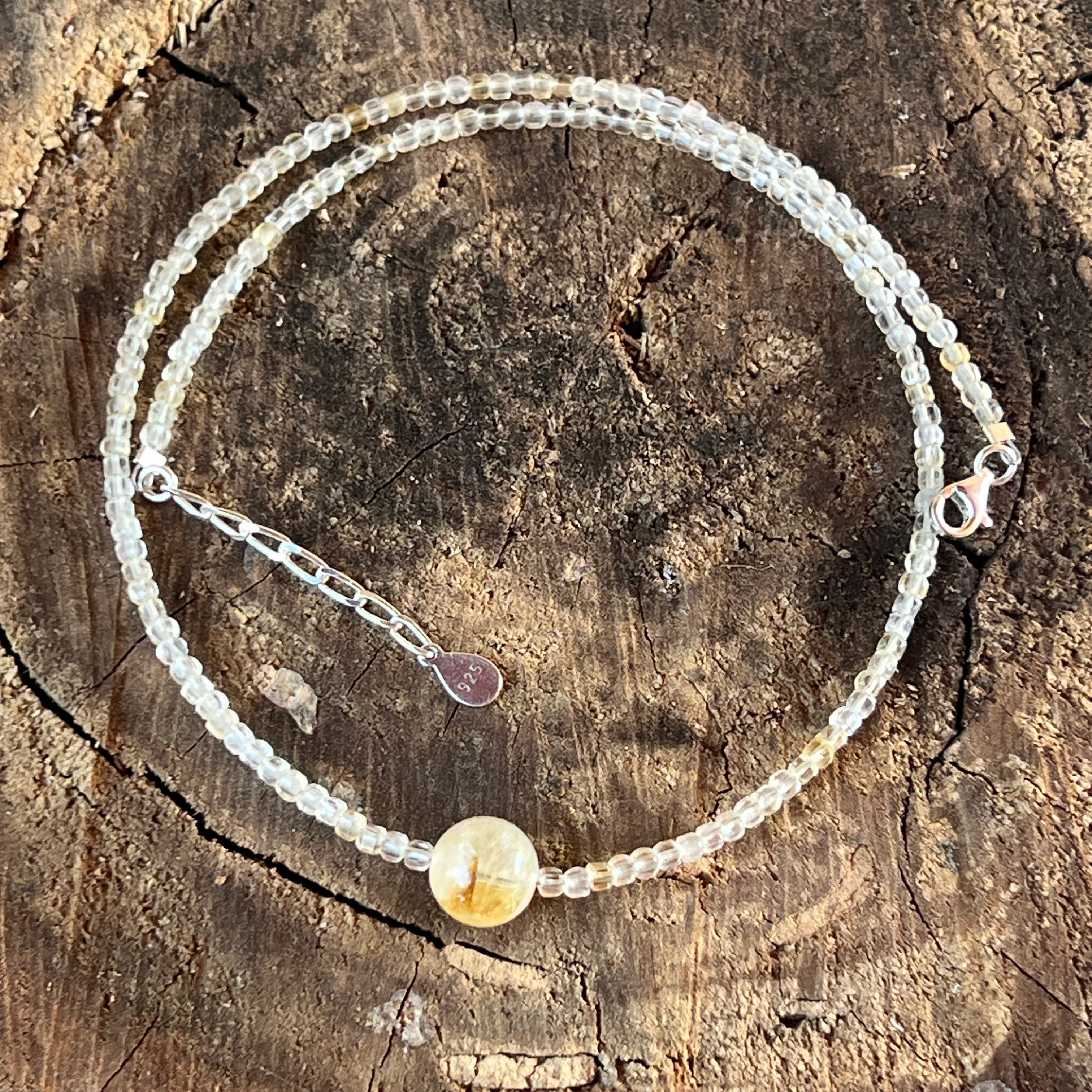 Слънчево колие, деликатно и пълно с топла светлина. Изработено от фасетиран цитрин 3 мм, всяка мъниста улавя светлината като слънчев лъч, отразявайки оптимизъм и жизненост. В центъра на бижуто има цитриново топче 10 мм, кръгло и сияйно, като вътрешно слънце, което излъчва спокойствие и мека сила.