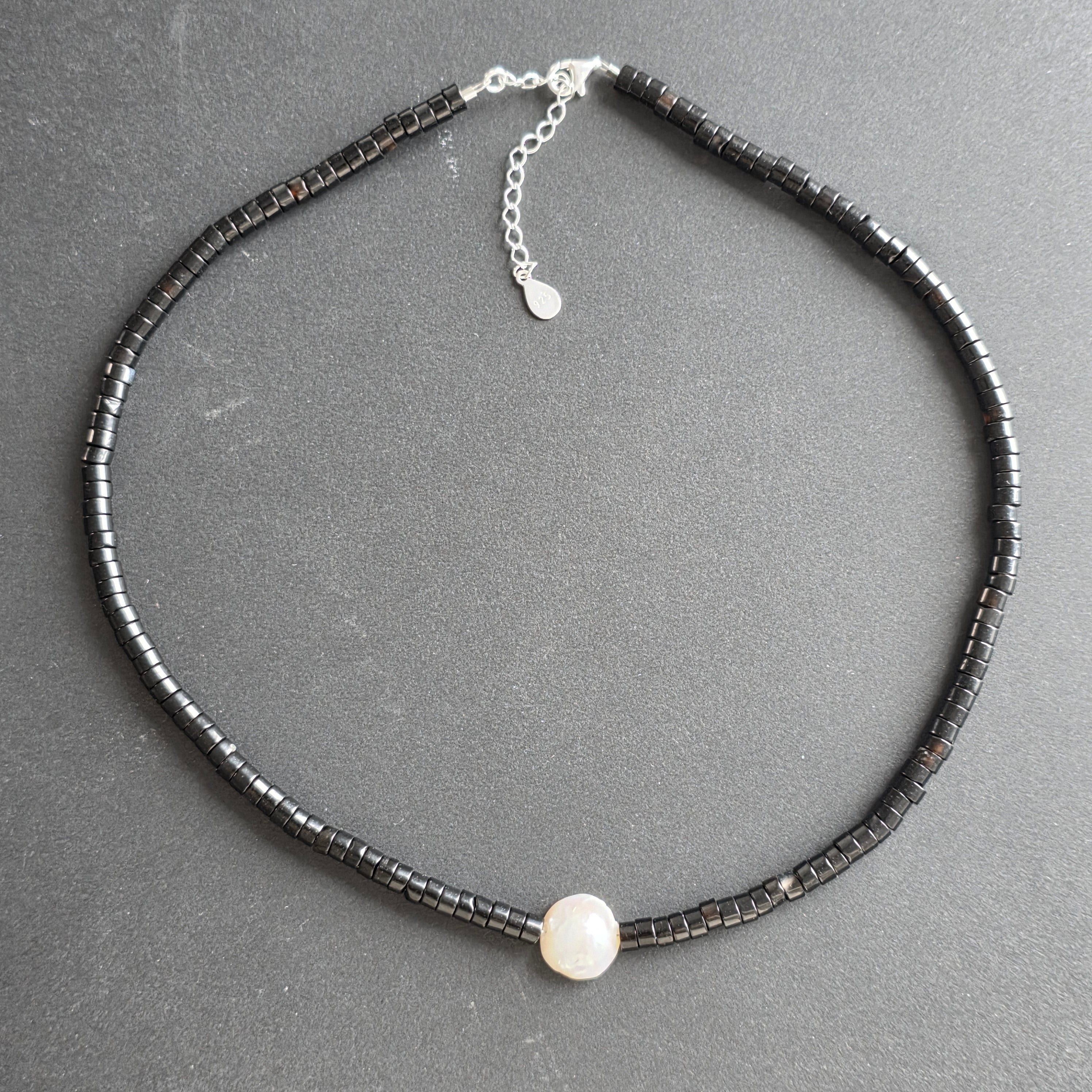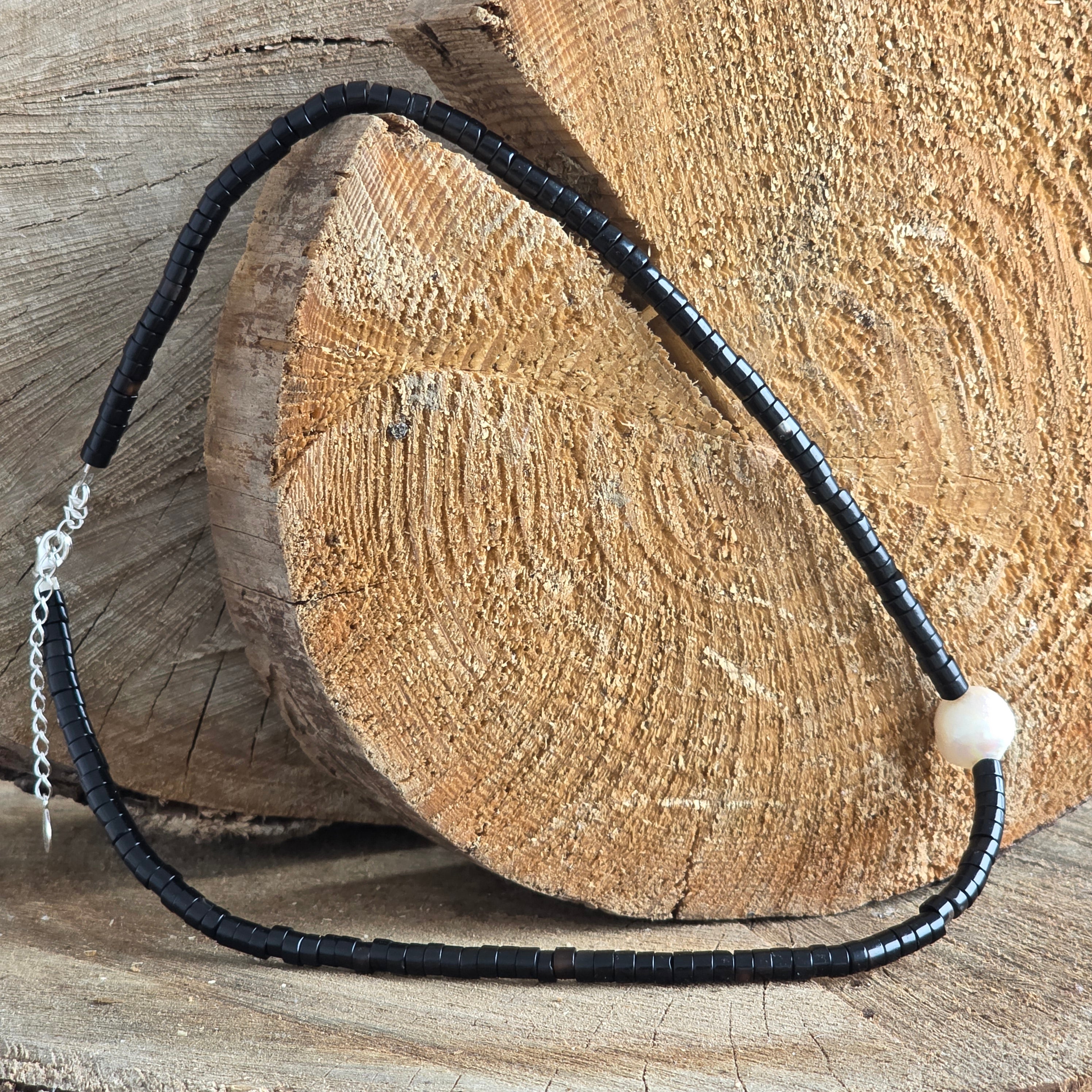 Колие като ясна нощ, в която пълната луна блести над тишината на земята. Гладките мъниста от черен оникс с диаметър 6 мм очертават линия на сила и мистерия, защитен кръг, който абсорбира шума на света и оставя място за присъствието.