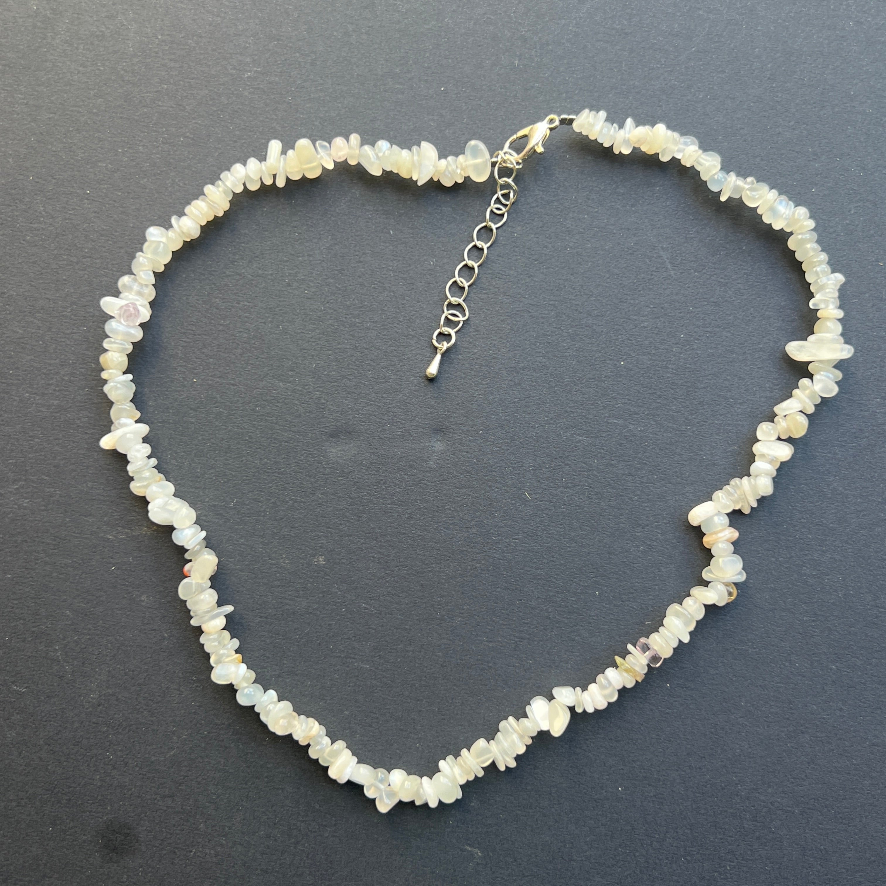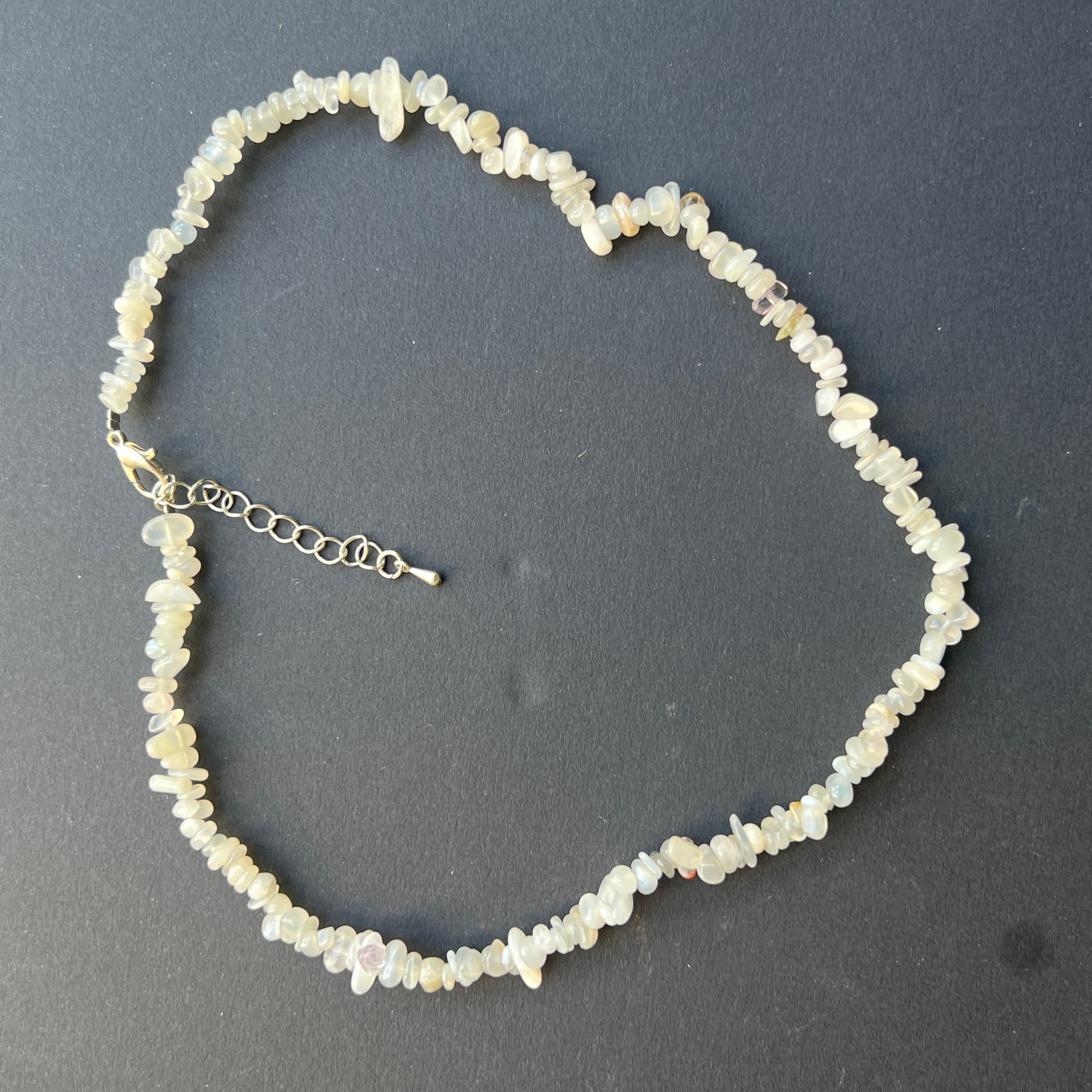 Добави малко магия и елегантност на своите облекла с това колие, изработено от естествени чипсове лунен камък, нанизани на деликатна верига от 40 см, с метално удължение от 5 см за перфектно прилягане.
