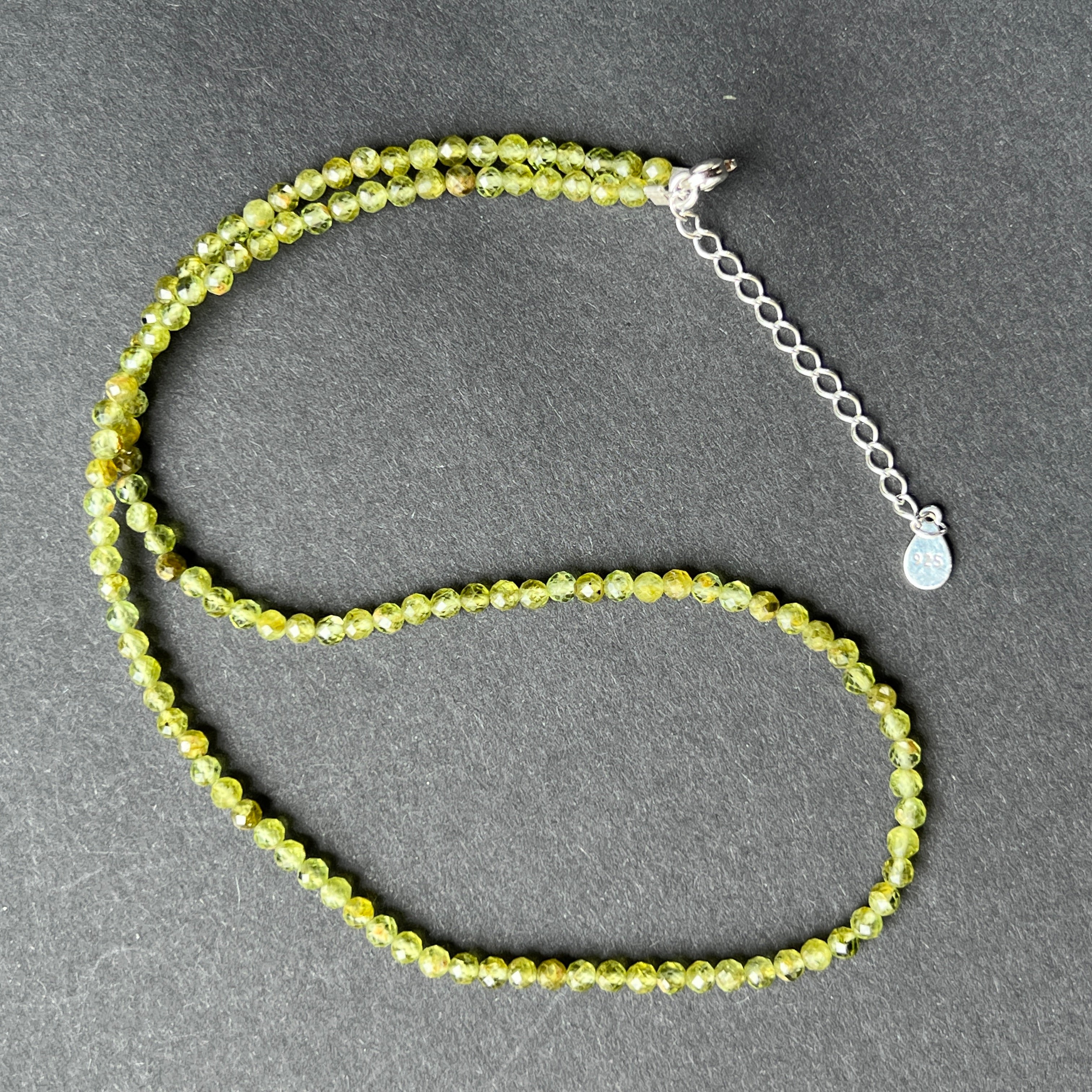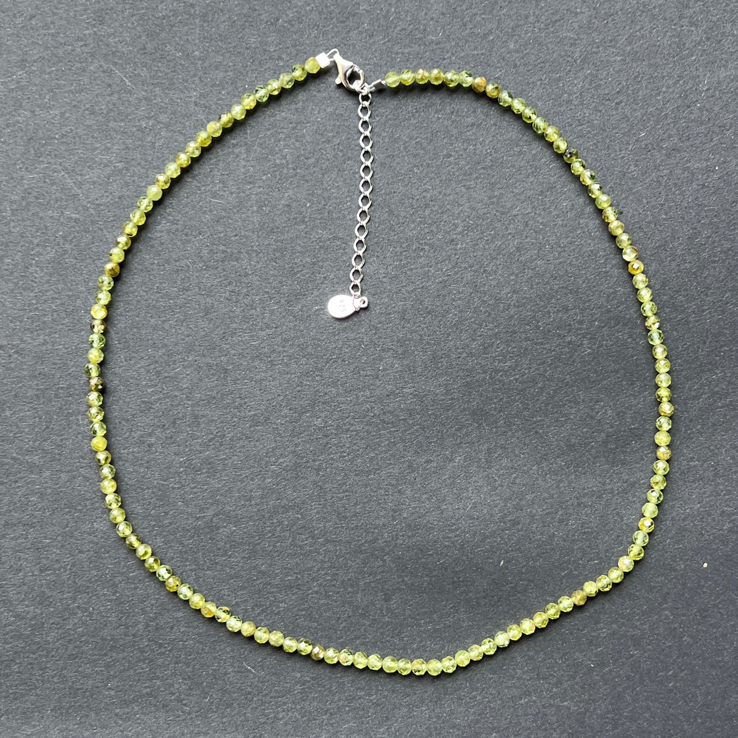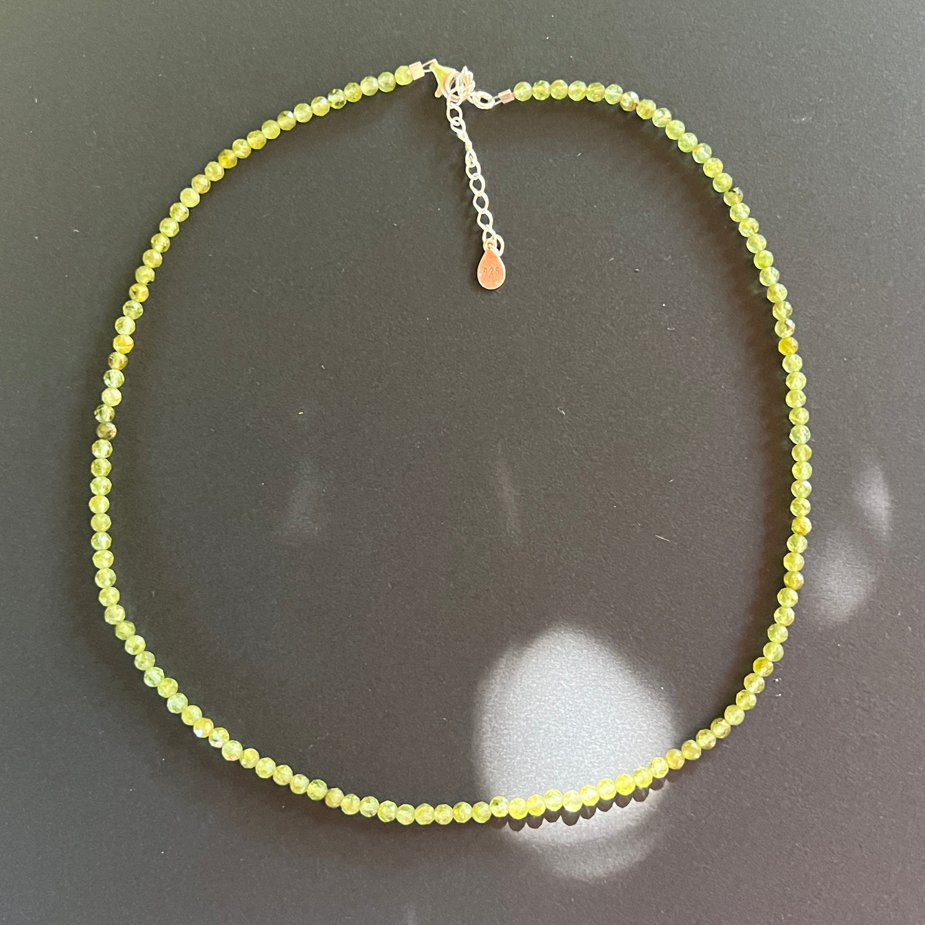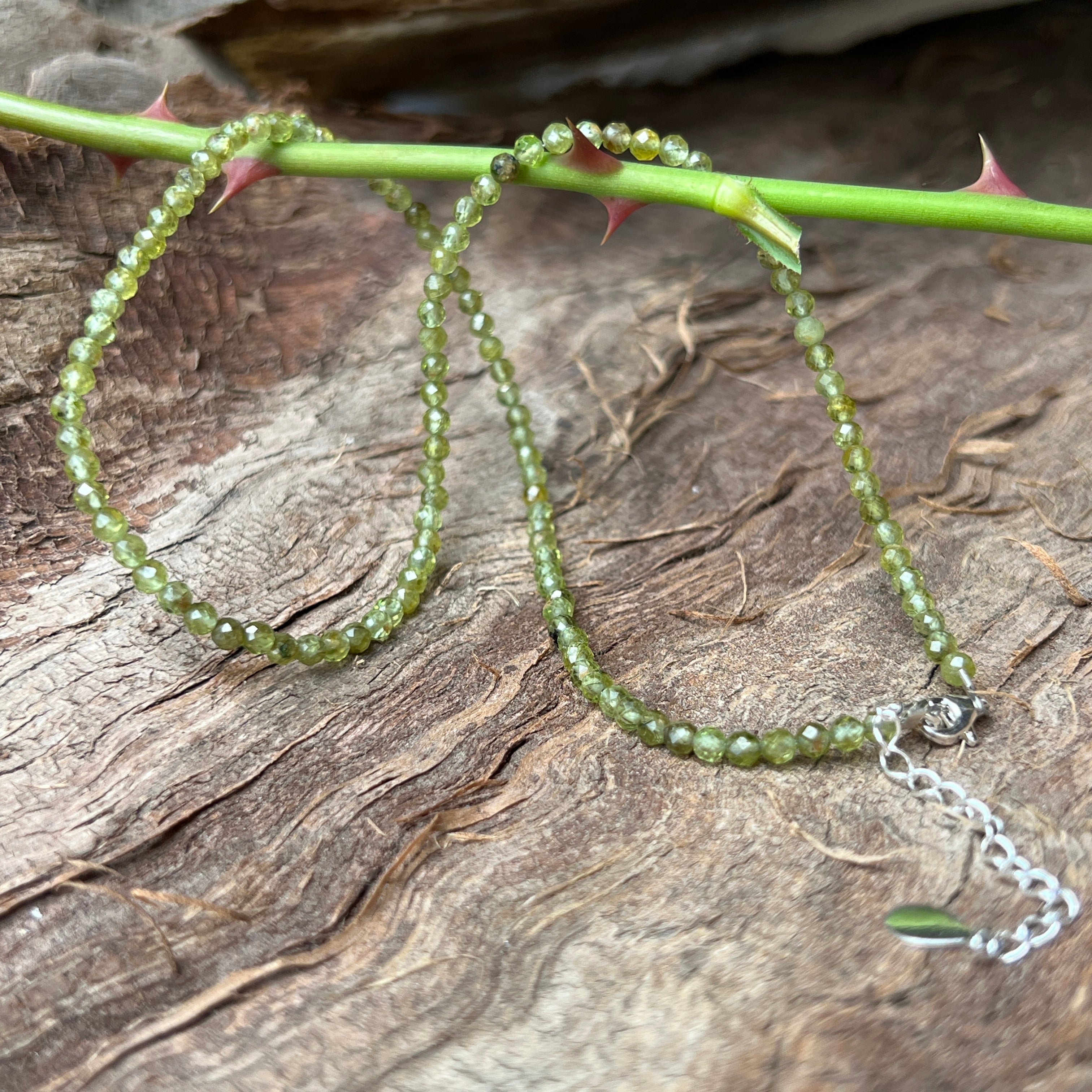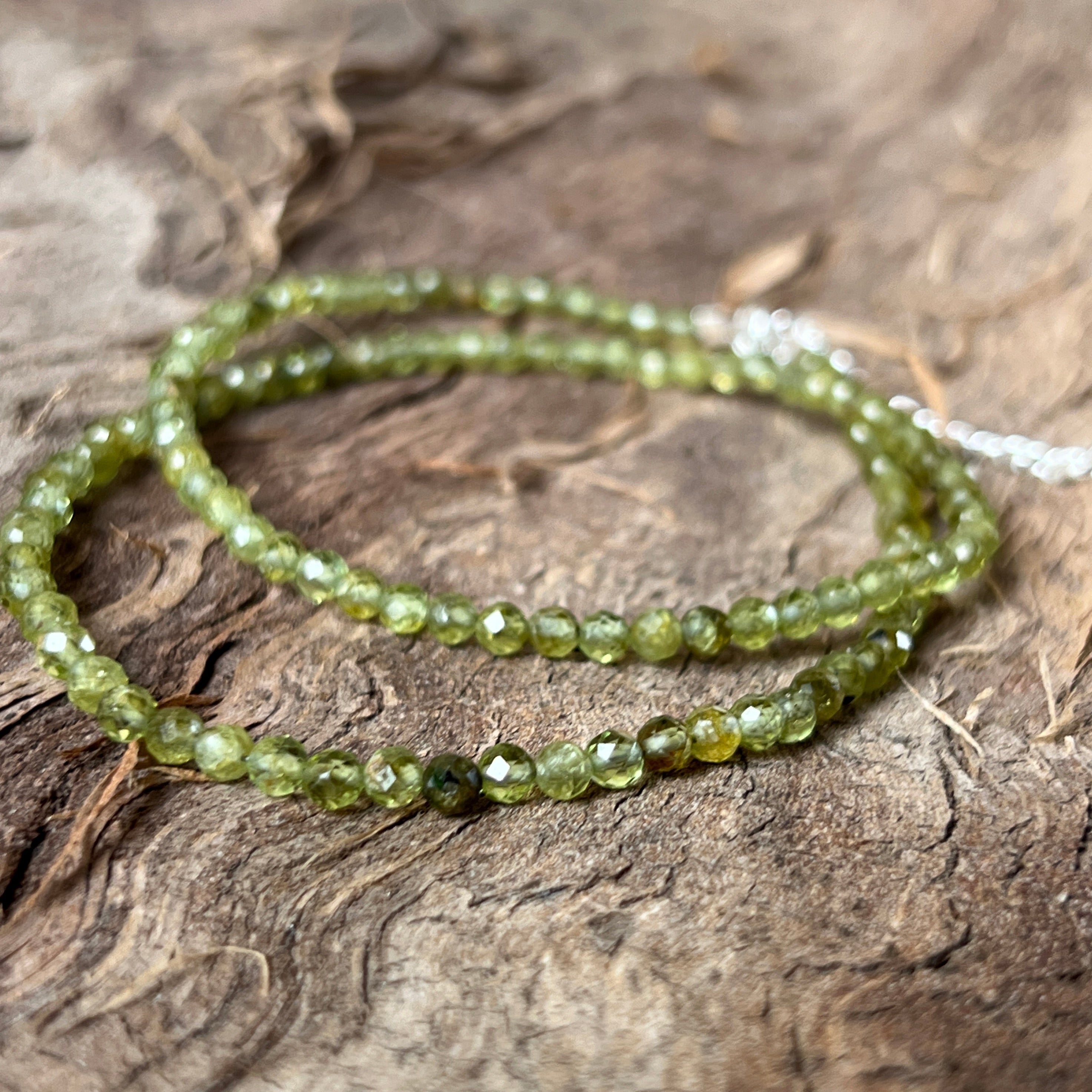 Колие като слънчев лъч, проникващ през листата – живо, свежо и изпълнено с живот. Фасетираните мъниста перидот с диаметър 3 мм блестят в нюанси на свежо зелено, носейки енергията на новото начало, на искрената радост и на сърце, което се прерожда всеки ден.