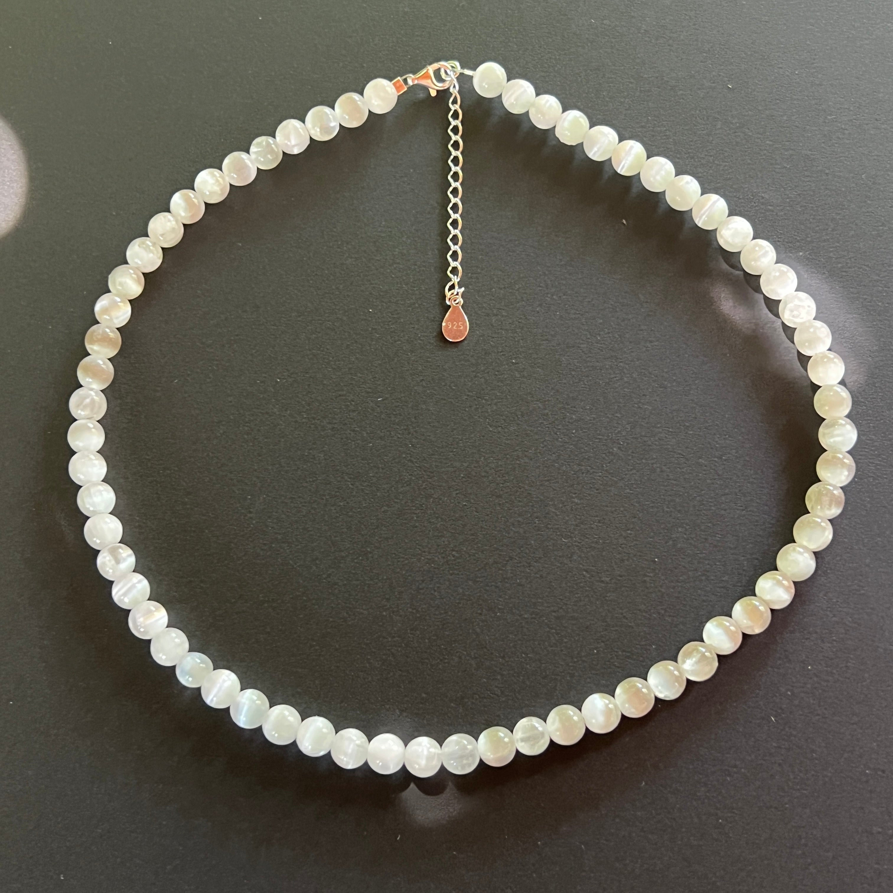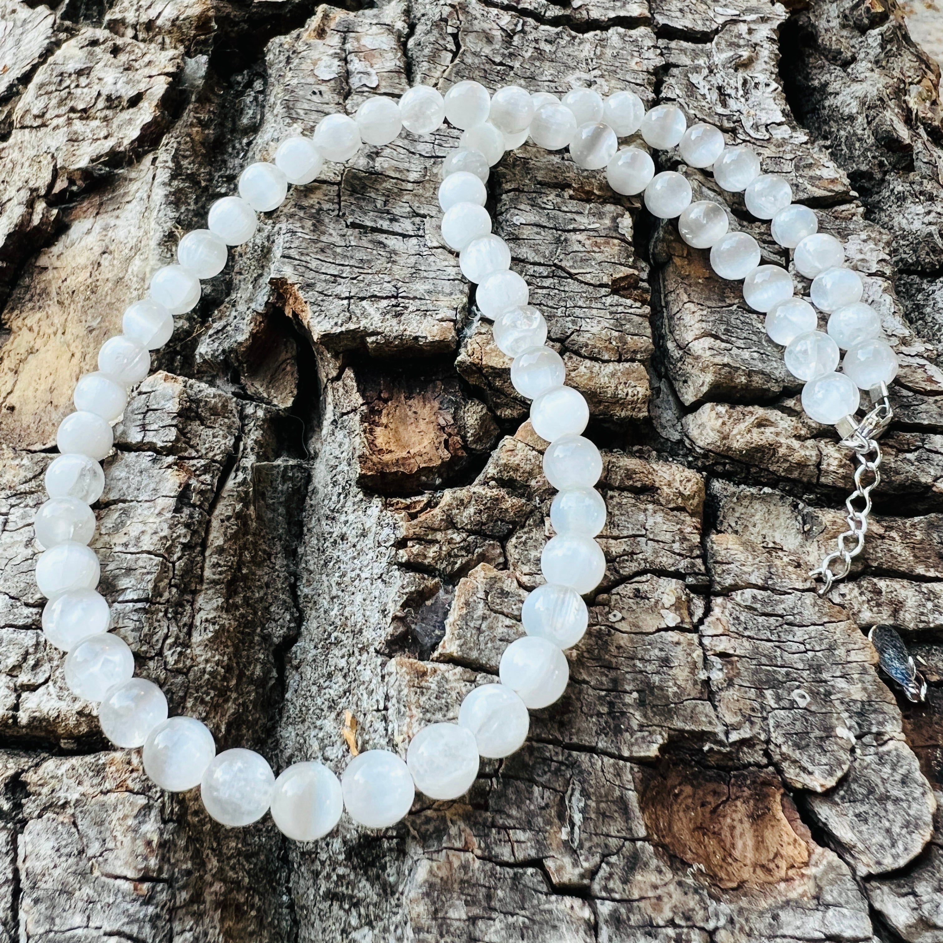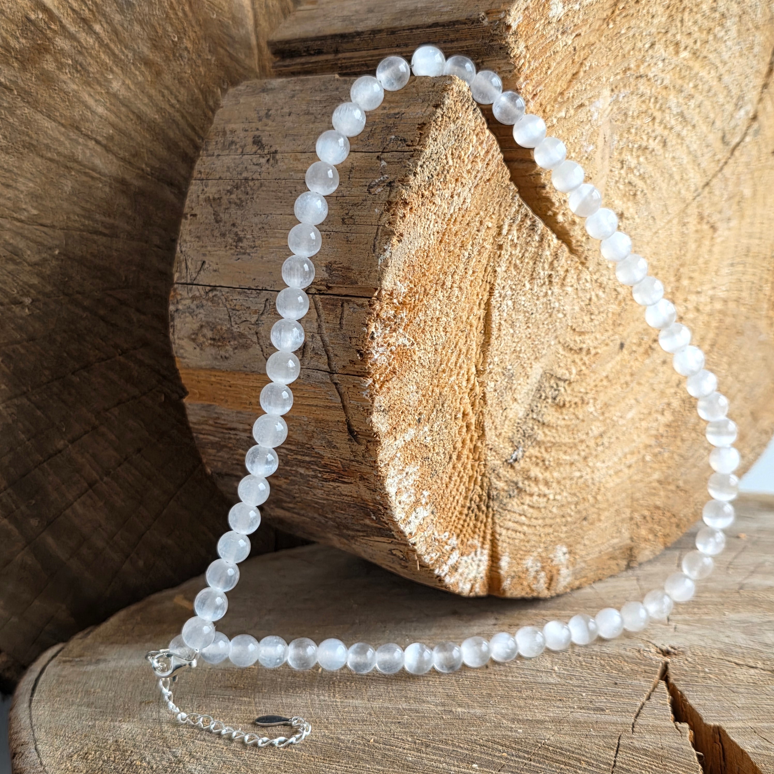 Колие като лъч, спуснал се в материята – съставено от перфектно сферични топчета от естествен селенит, 6 мм, всяко носещо в себе си чистотата на бяла и тиха сутрин. Кадифената и полупрозрачна повърхност отразява светлината с почти нереална нежност, сякаш излъчва спокойствие.