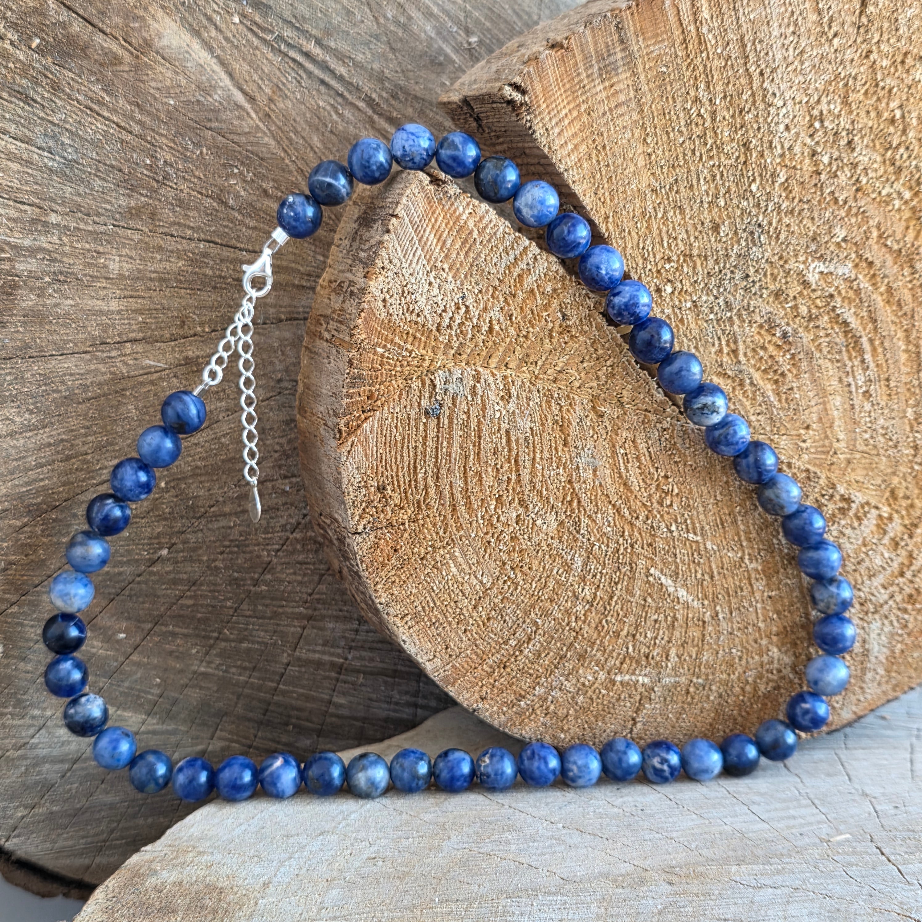 Светло и хармонично колие, изработено от топчета синя перла с диаметър 6 мм, които се подреждат хармонично около врата, създавайки плавна и добре пропорционирана линия. Перлените сини нюанси с фини иризации и перлени отблясъци създават деликатна игра на светлина, придавайки на бижуто свежест и елегантност. Сферичната форма подчертава визуалната непрекъснатост и акцентира върху естествената, копринена текстура на перлата.