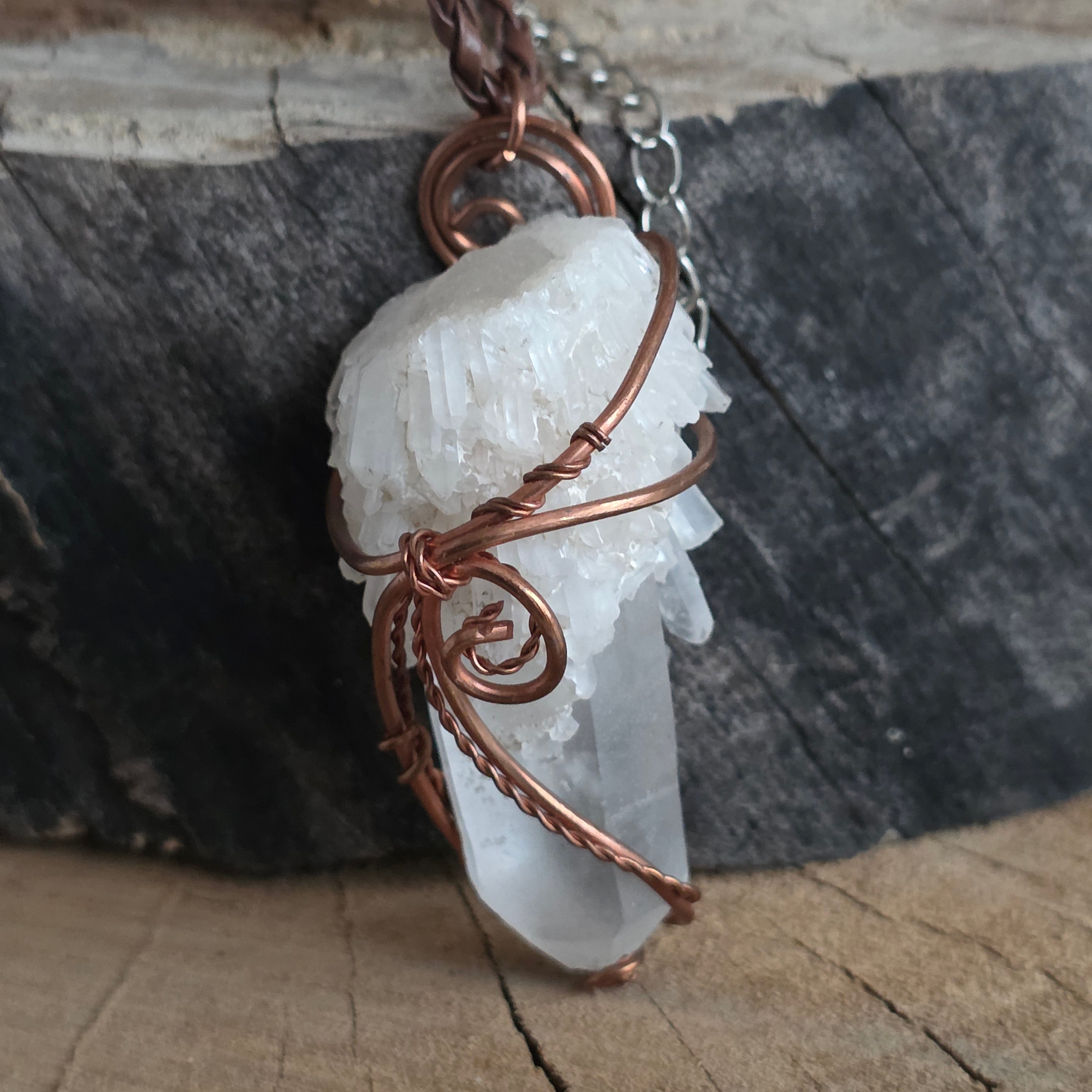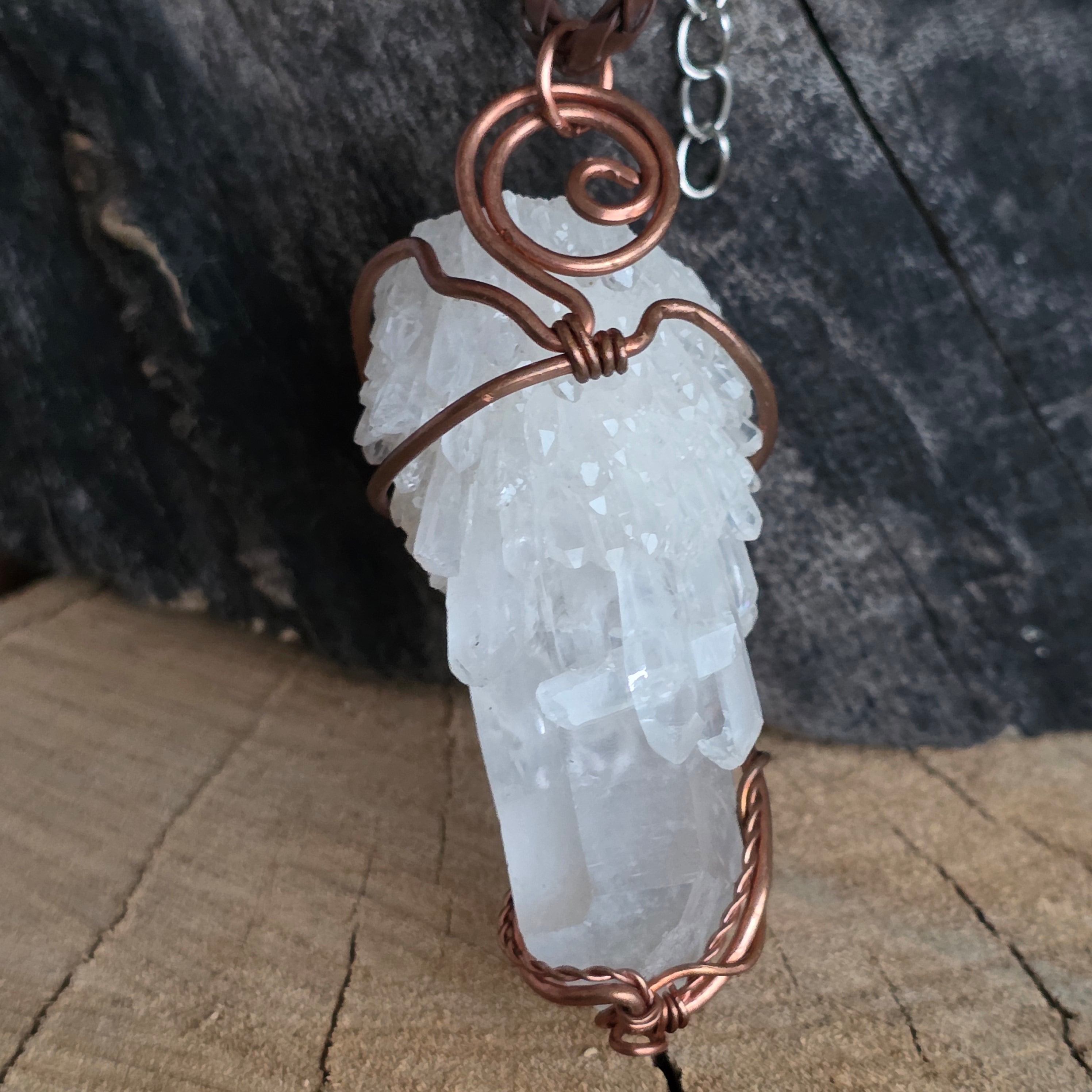 Колие с висулка клъстър безцветен кварц, мед/артистична тел m6