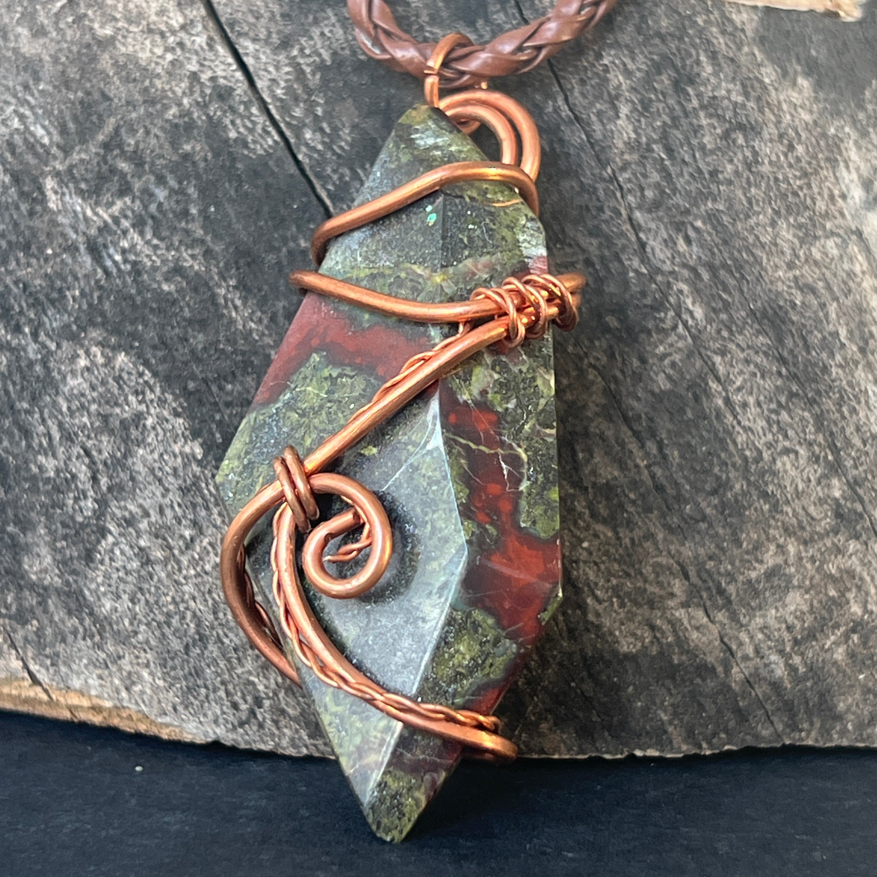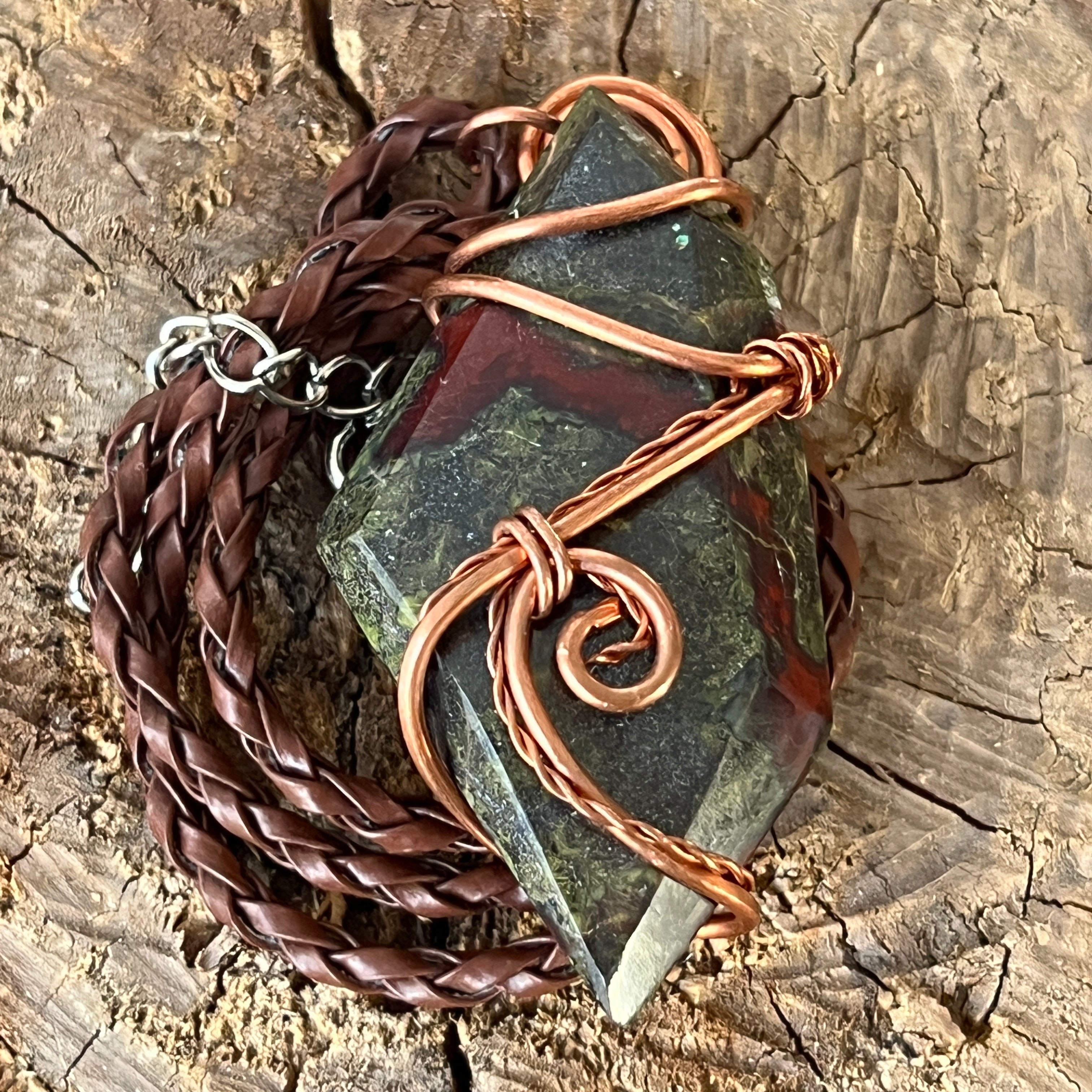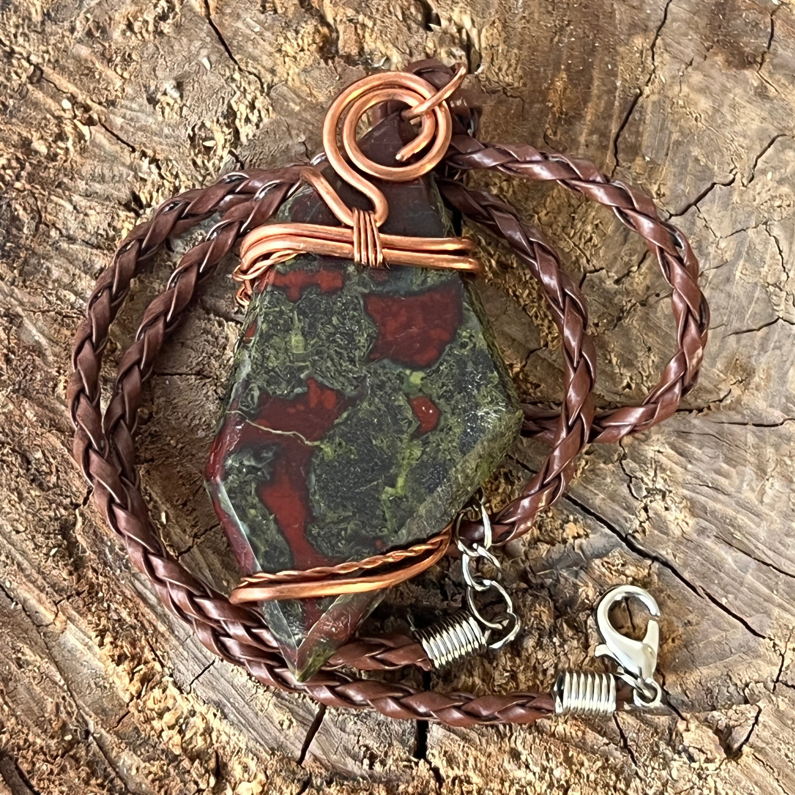 Това уникално колие съчетава силата и дивата красота на Африка чрез впечатляваща висулка от Кръвта на дракона, рядък и завладяващ камък от Южна Африка. Полираният камък, закрепен в ръчно усукана артистична медна рамка, разкрива силни контрасти между земни зелени и наситено червени нюанси, като легенда, изсечена в минерала.