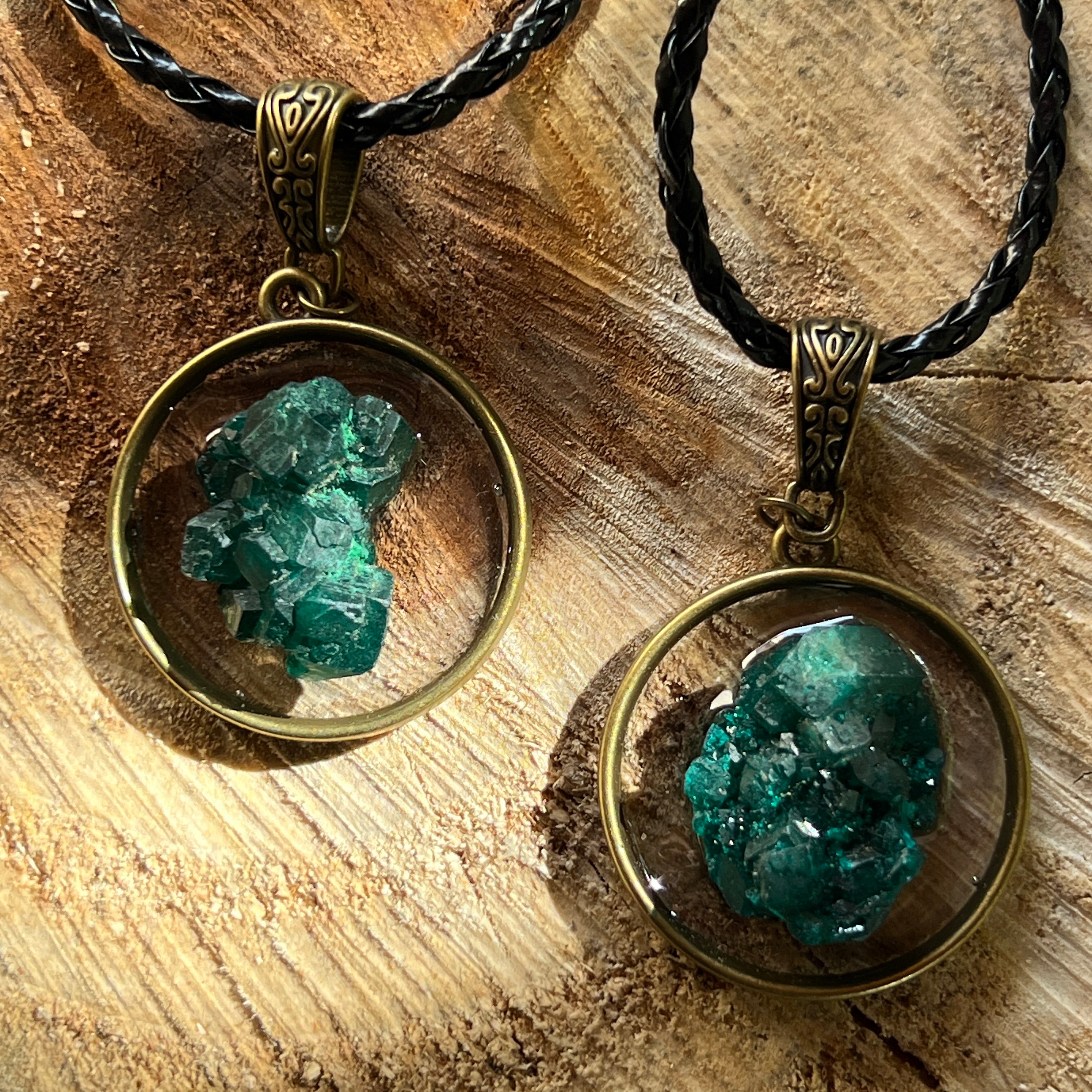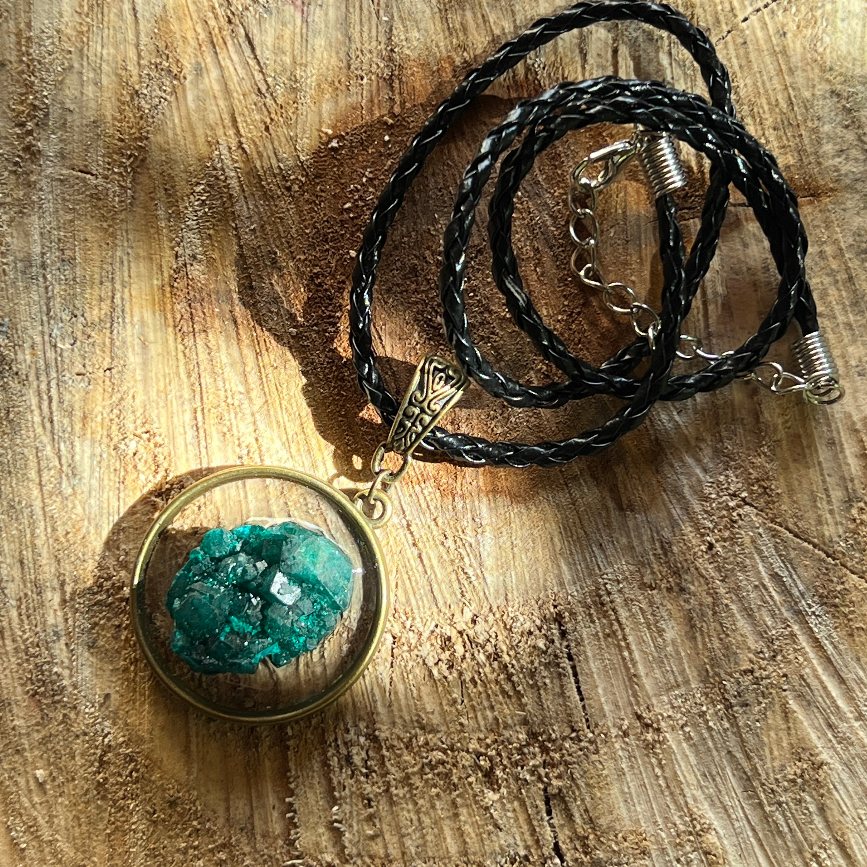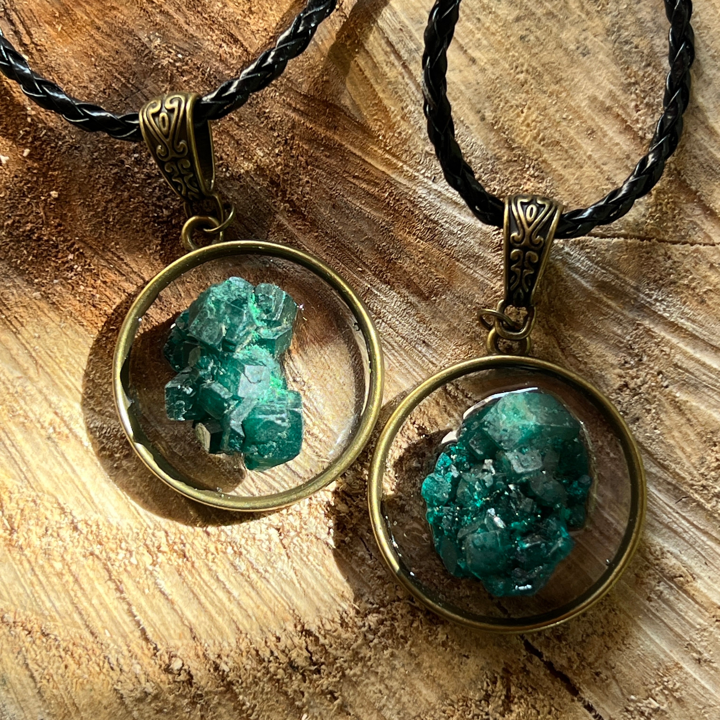 Тази уникална висулка е създадена около едно необработено парче диоптаз, рядък и впечатляващ камък с наситени нюанси на смарагдово зелено. Неговата естествена енергия остава непокътната, позволявайки на кристала да разкрие своята автентична красота, точно такъв, какъвто е образуван в недрата на Земята.