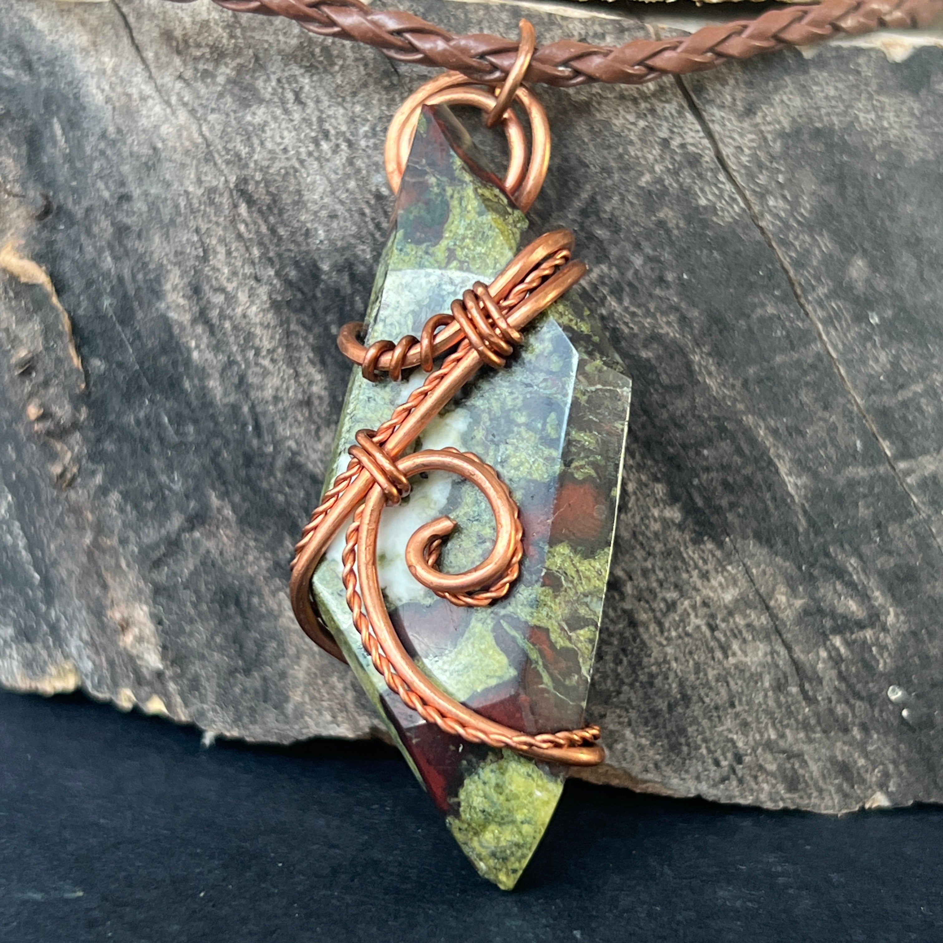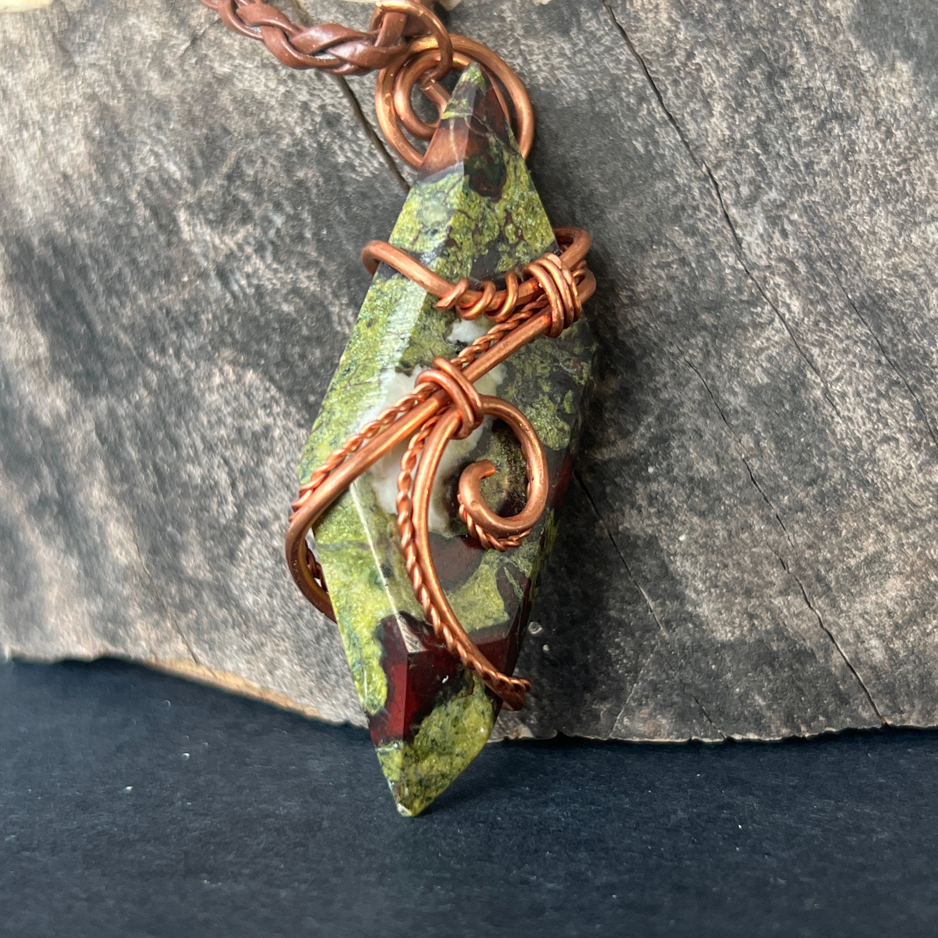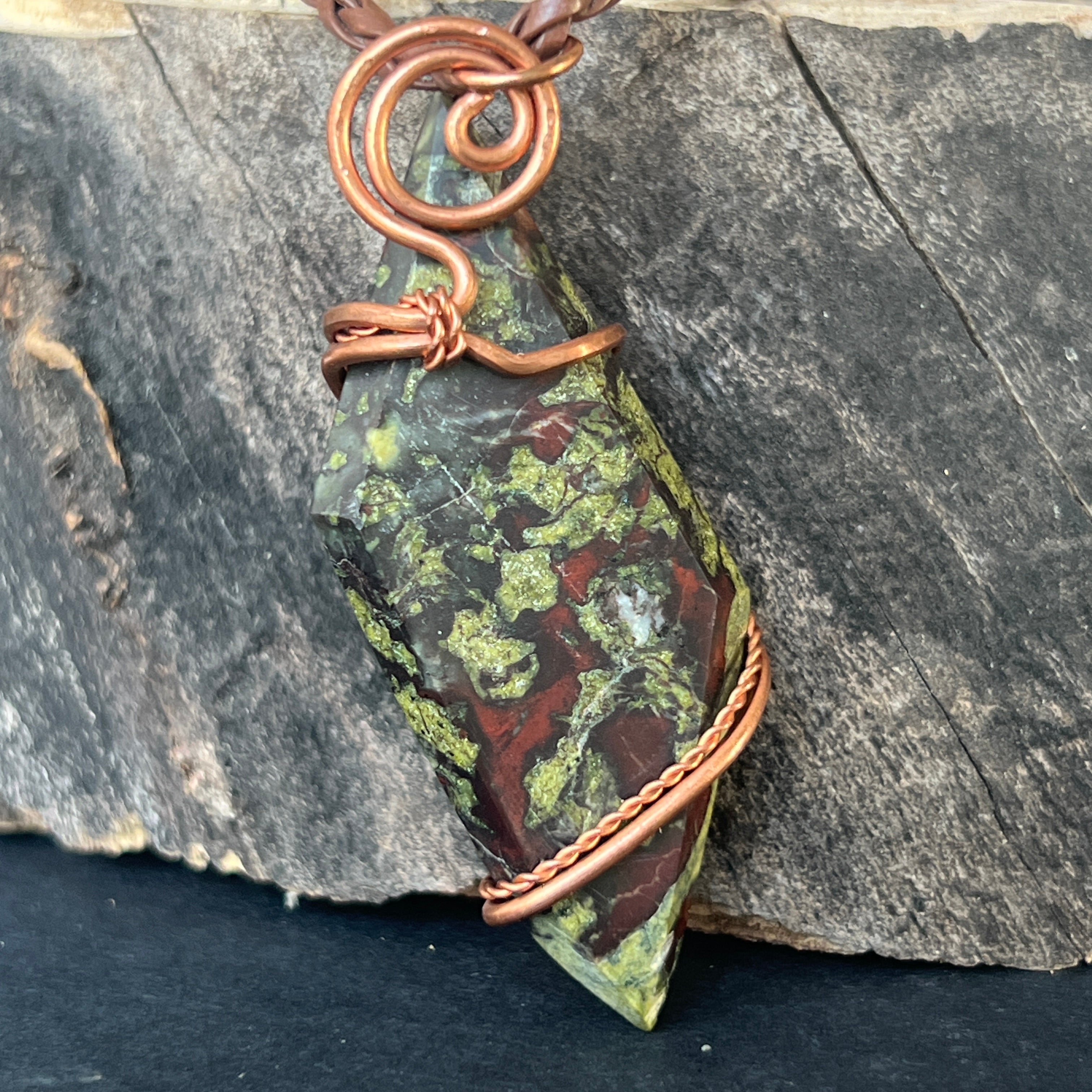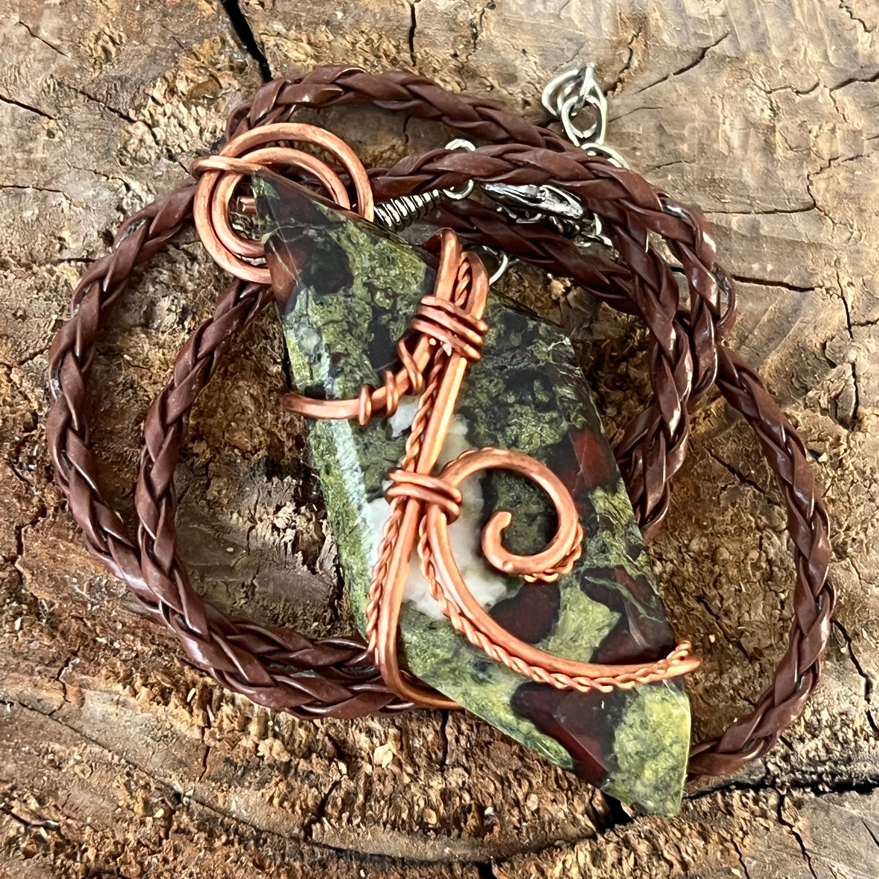 Това уникално колие съчетава сила и сурова красота на Африка чрез зрелищна висулка от Драконова кръв, рядък и завладяващ камък от Южна Африка. Полираният камък, закрепен с ръчно усукана художествена медна тел, разкрива силни контрасти от земни зелени и наситено червени нюанси, като легенда, изваяна в минерала.