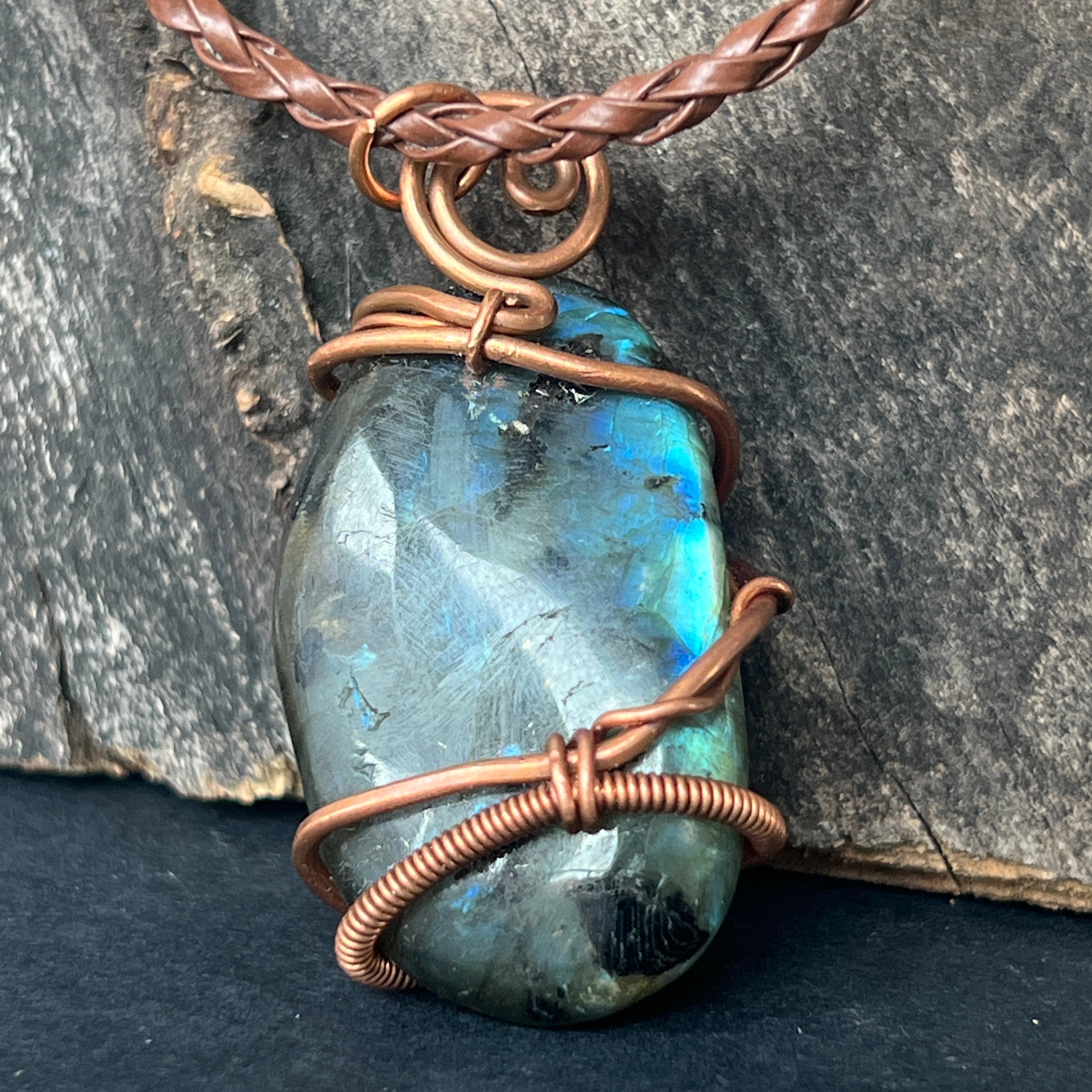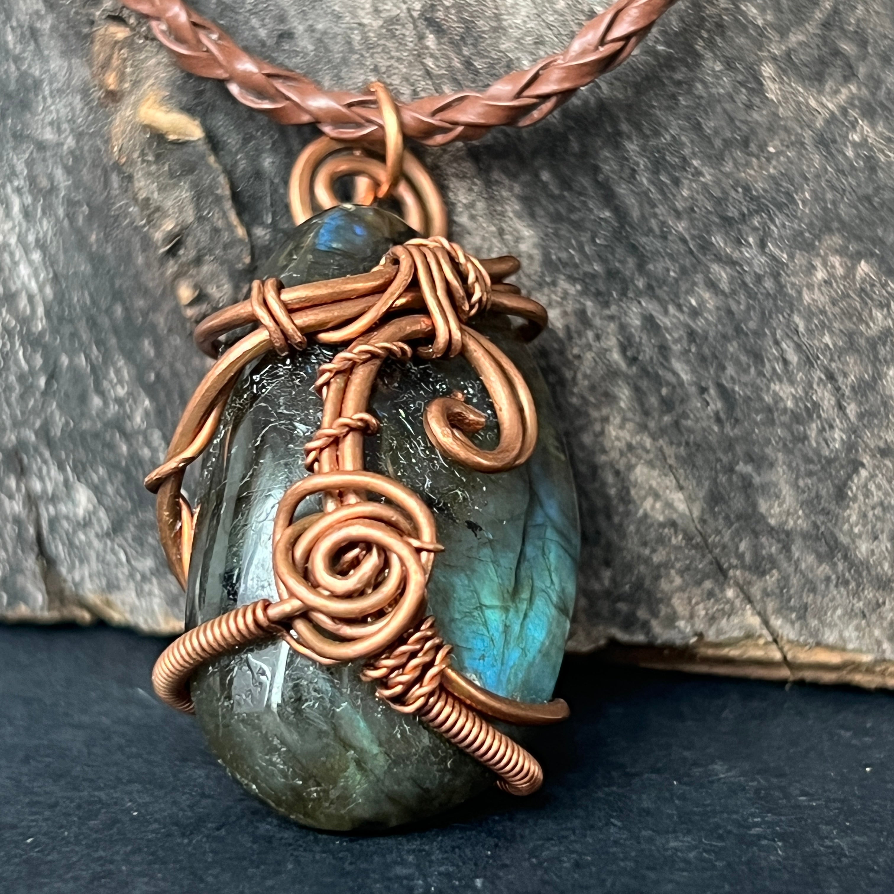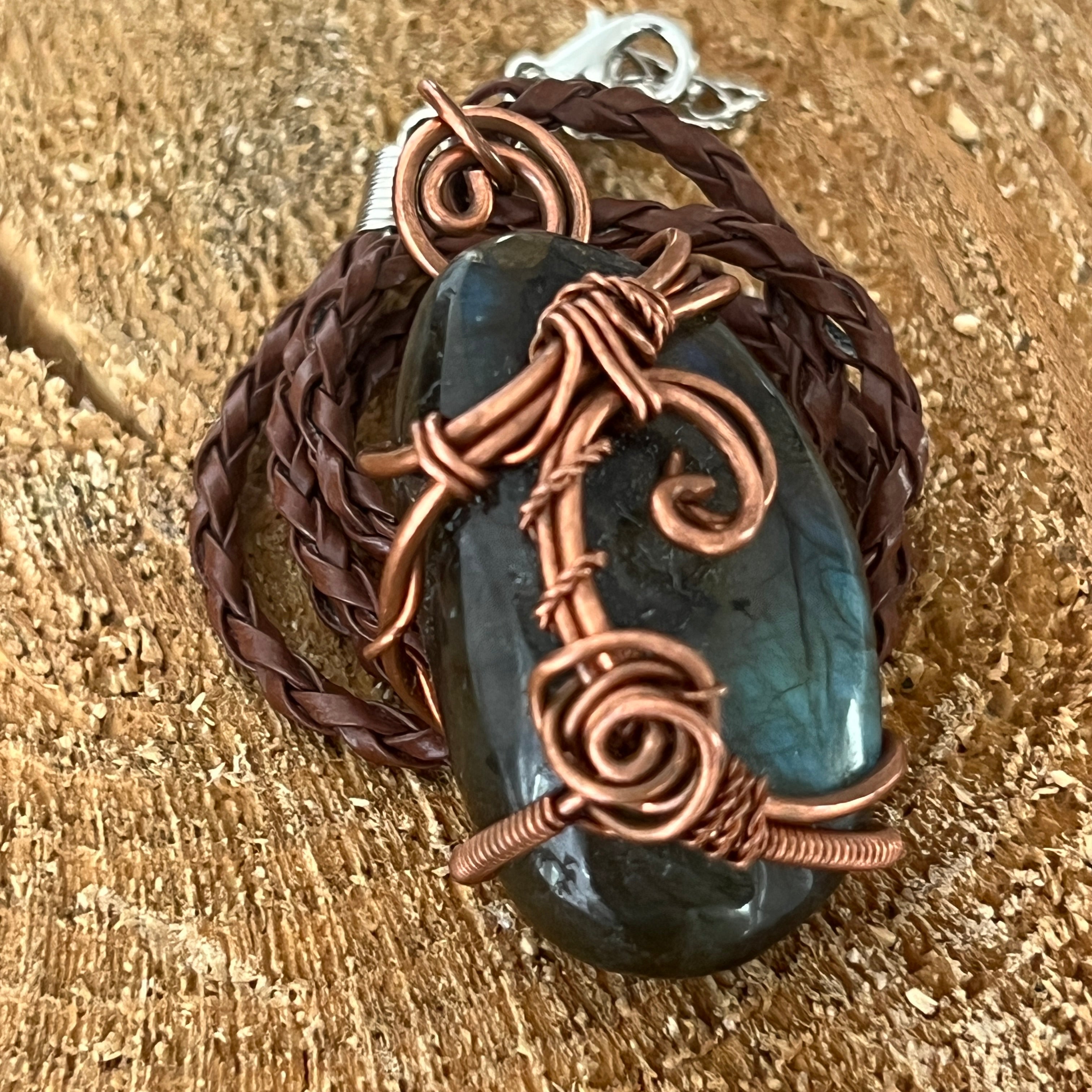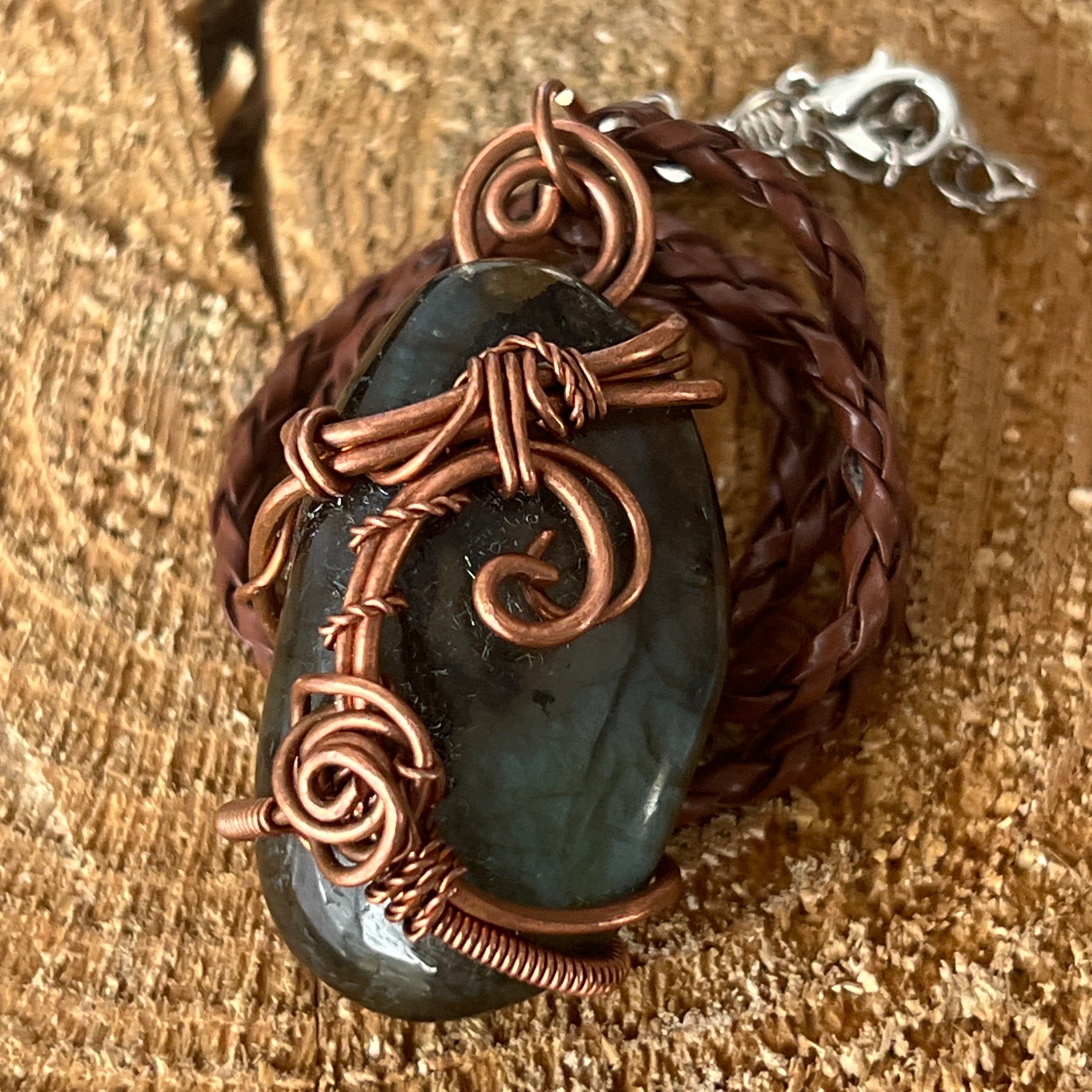 Това уникално колие оживява магията на Африка чрез висулка от естествен лабрадорит, добит от Мадагаскар. Камъкът, внимателно шлифован и закрепен в артистична ръчно усукана медна основа, улавя светлината с сини и зелени отблясъци, напомняйки за танца на северните сияния.