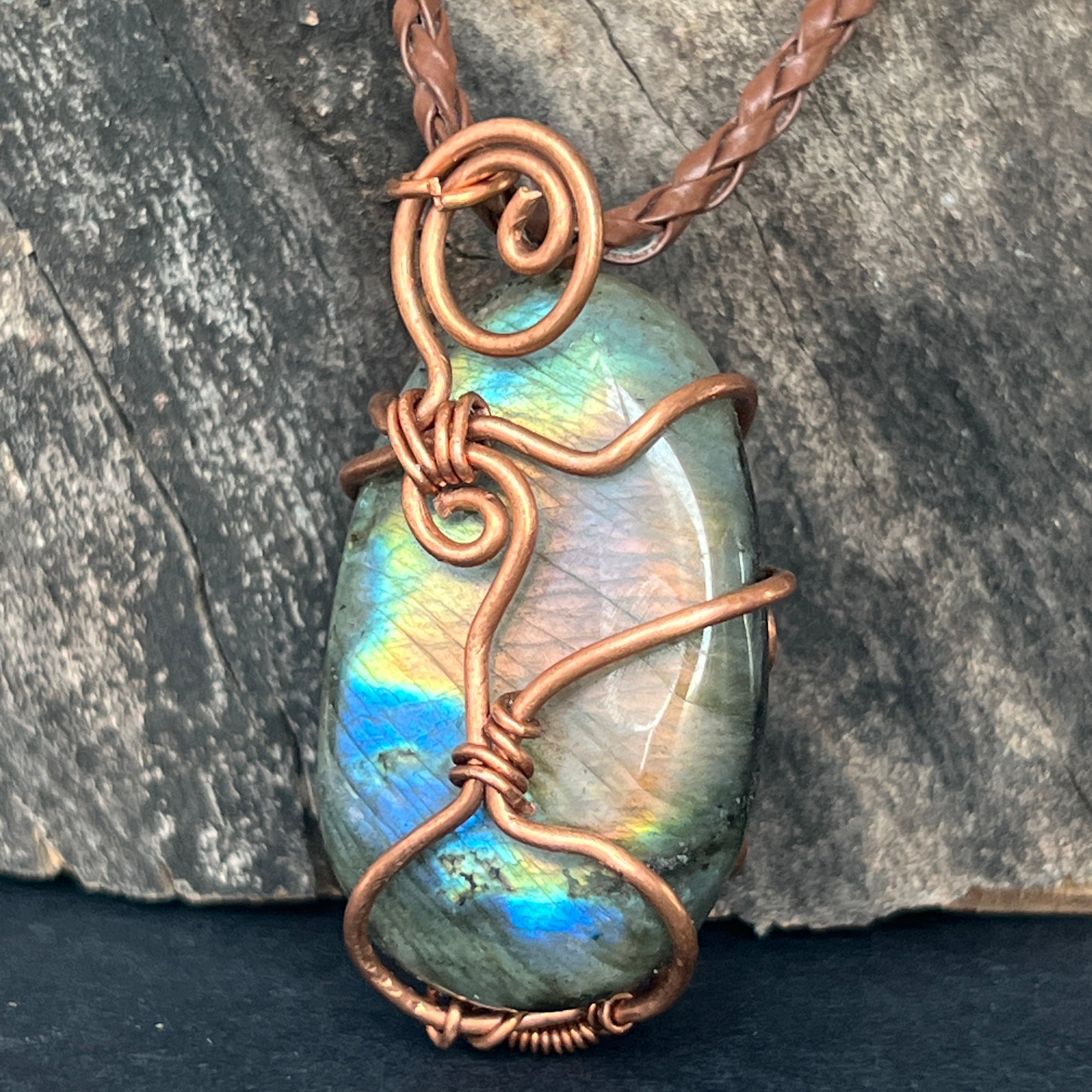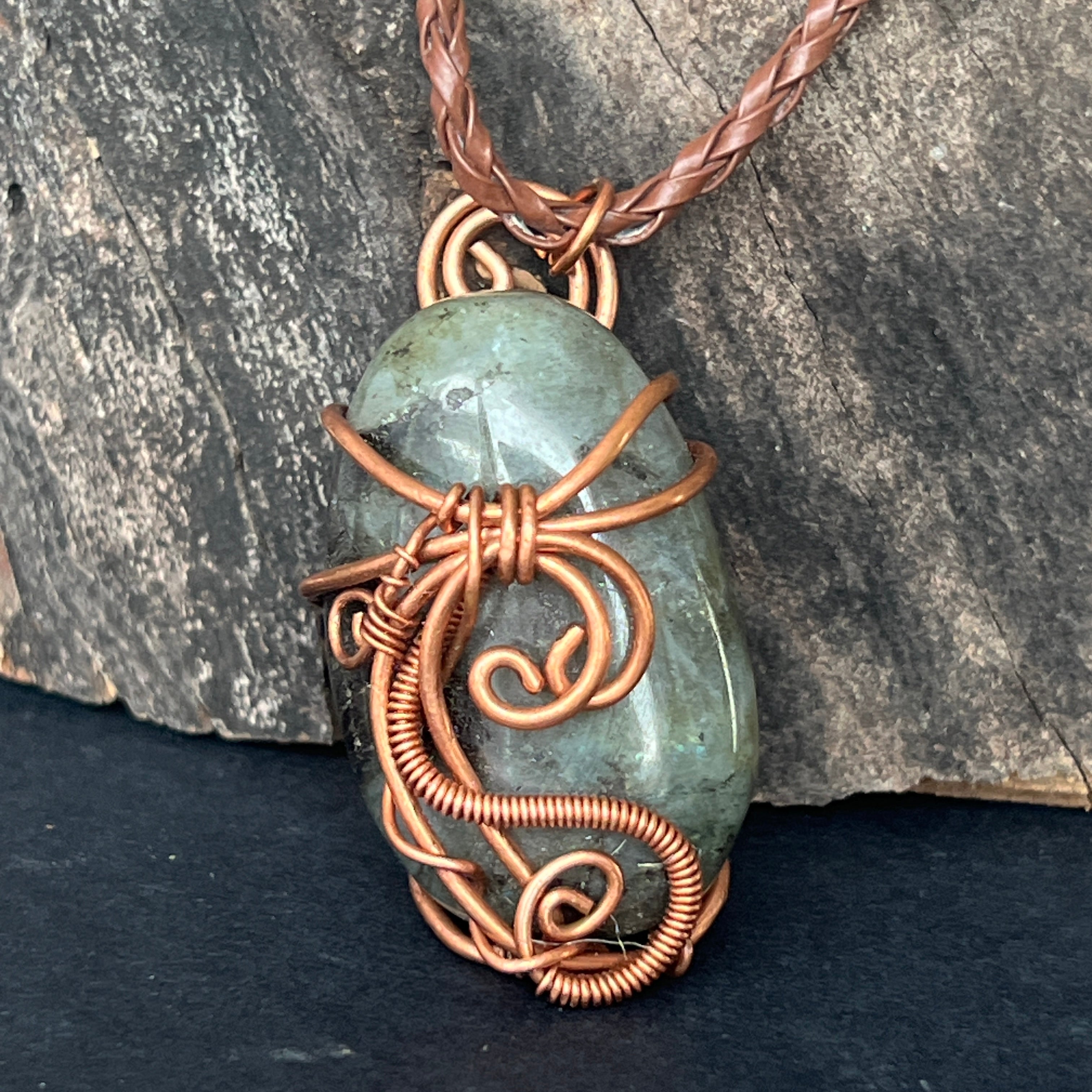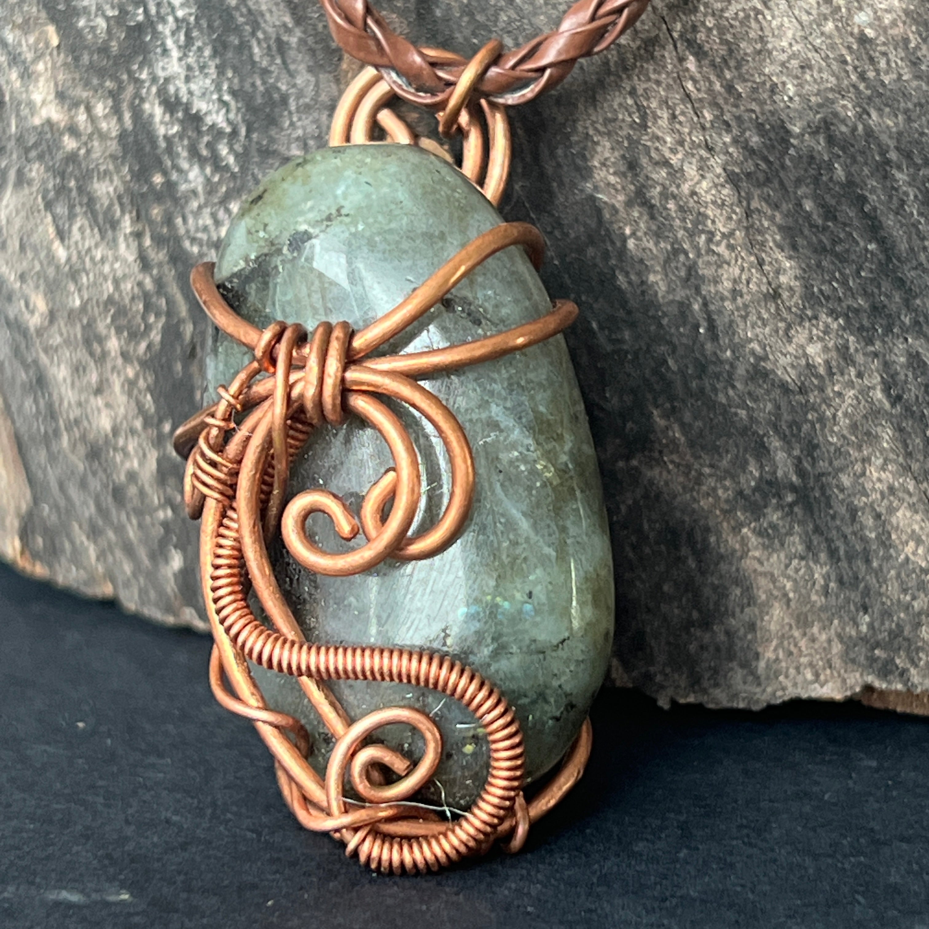 Колие с висулка от лабрадорит в мед/артистична тел, модел 2