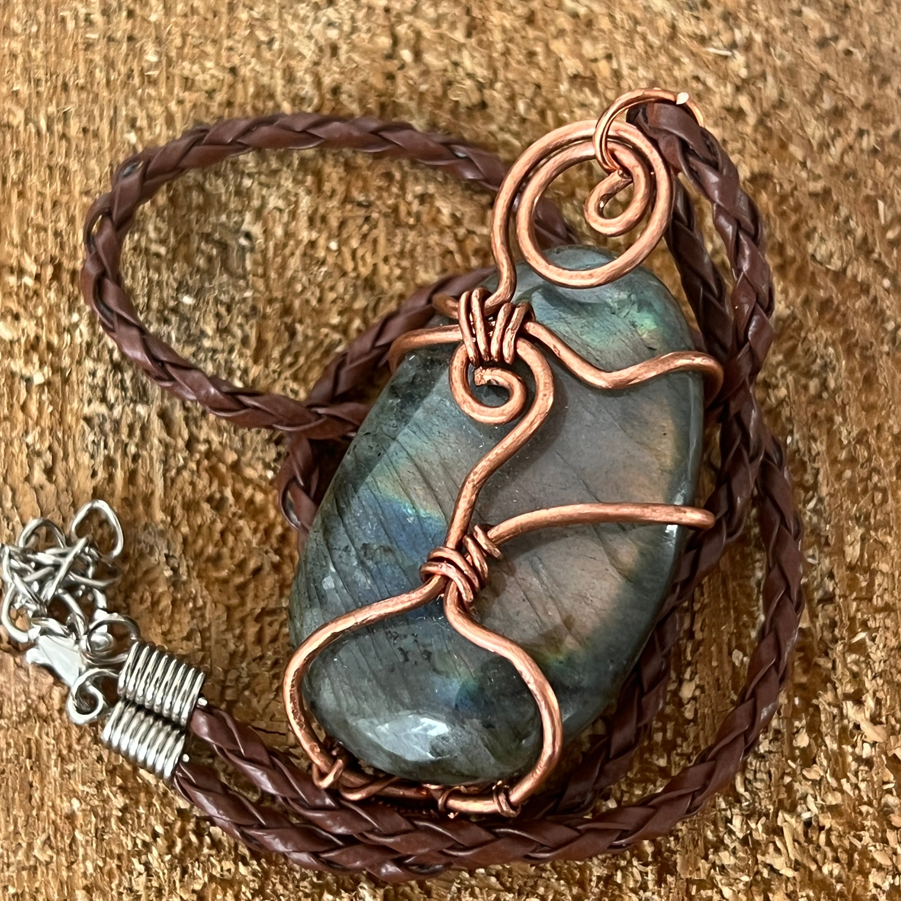 Това уникално колие съживява магията на Африка чрез висулка от естествен лабрадорит, идващ от Мадагаскар. Камъкът, внимателно полиран и поставен в ръчно изработен артистичен меден монтаж, улавя светлината с сини и зелени отблясъци, напомняйки за танца на полярните сияния.