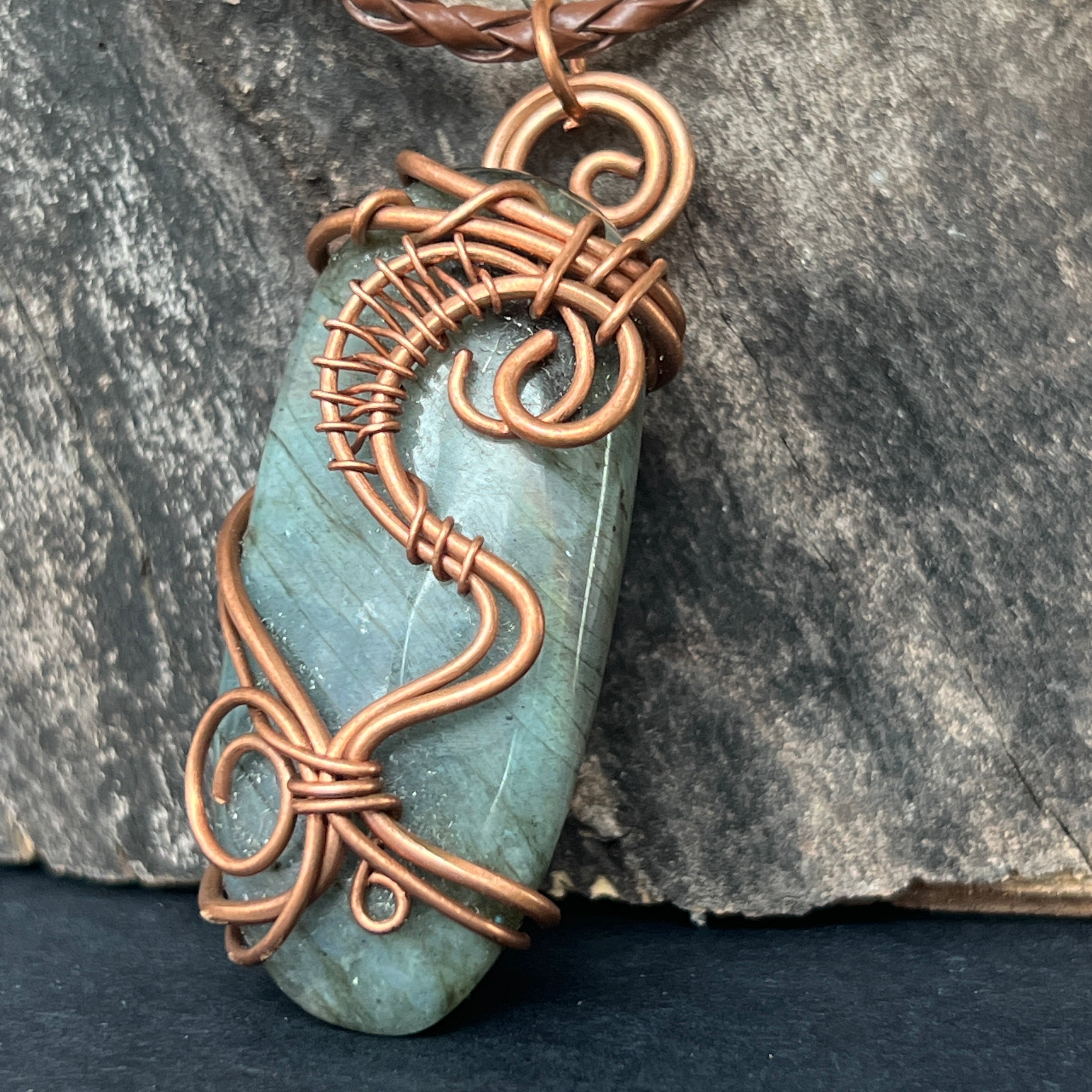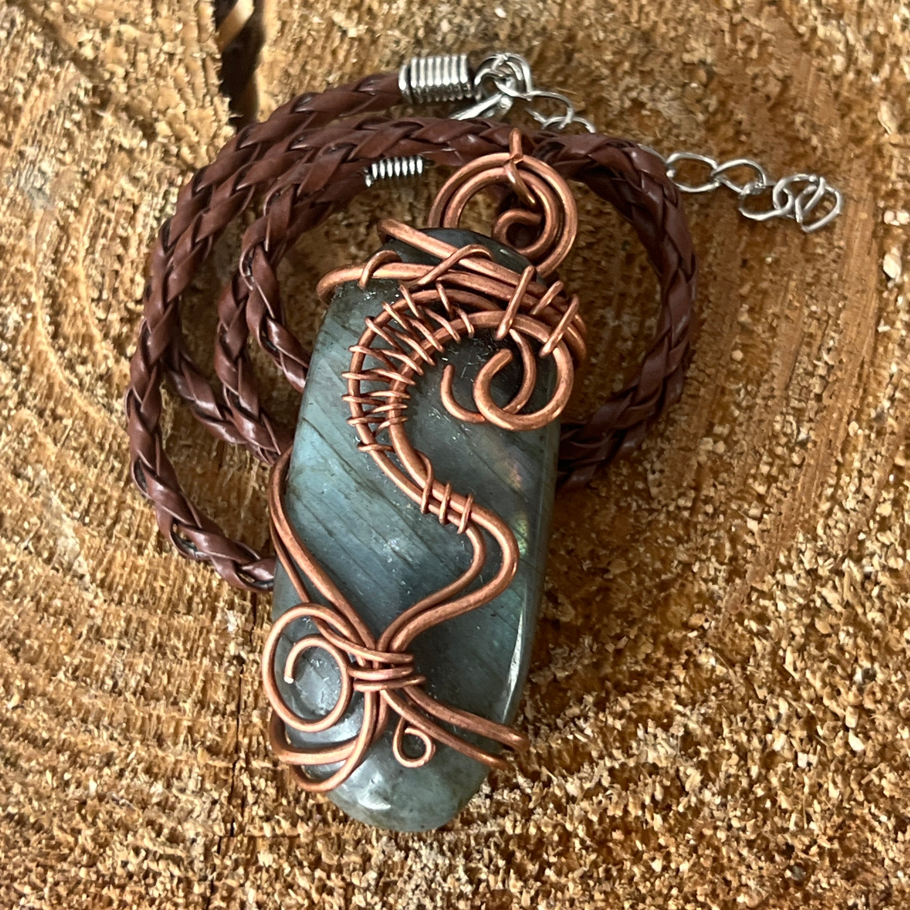 Това уникално колие оживява магията на Африка чрез висулка от естествен лабрадорит, добит от Мадагаскар. Камъкът, внимателно шлифован и закрепен в артистично усукана медна рамка, улавя светлината с сини и зелени отблясъци, напомняйки за танца на северните сияния.