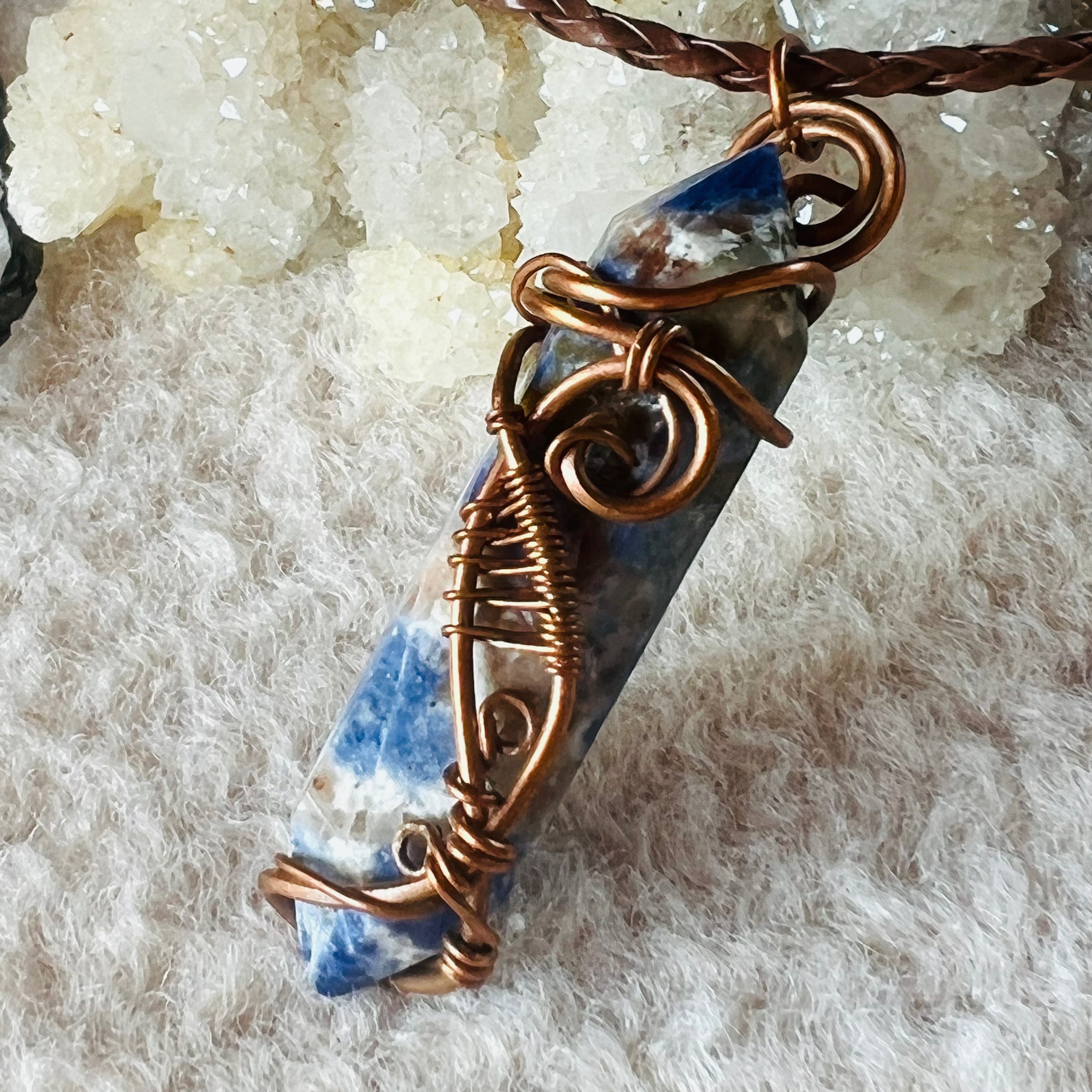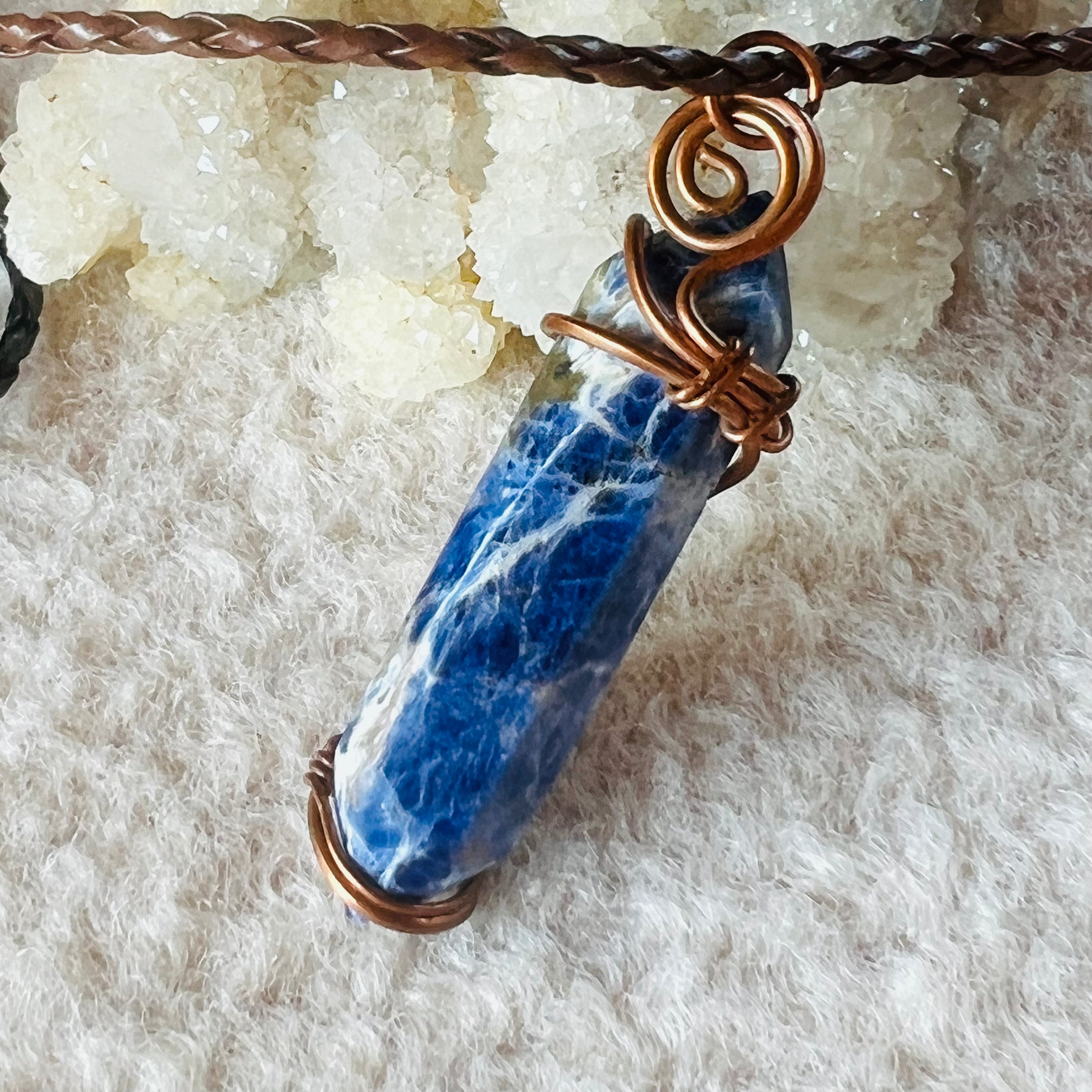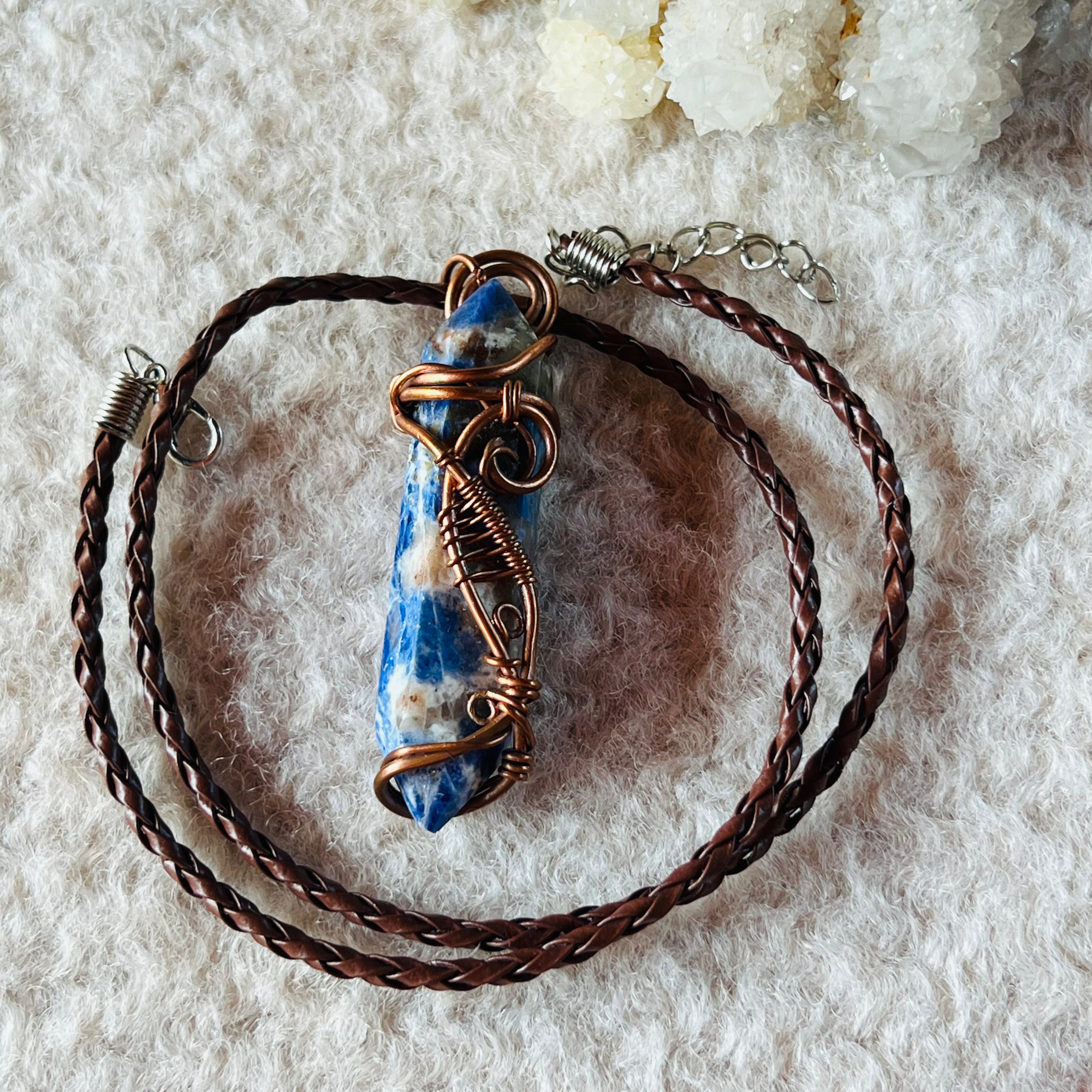 Колие с висулка от содалит с артистична тел, кафяв плетен шнур, ръчна изработка.