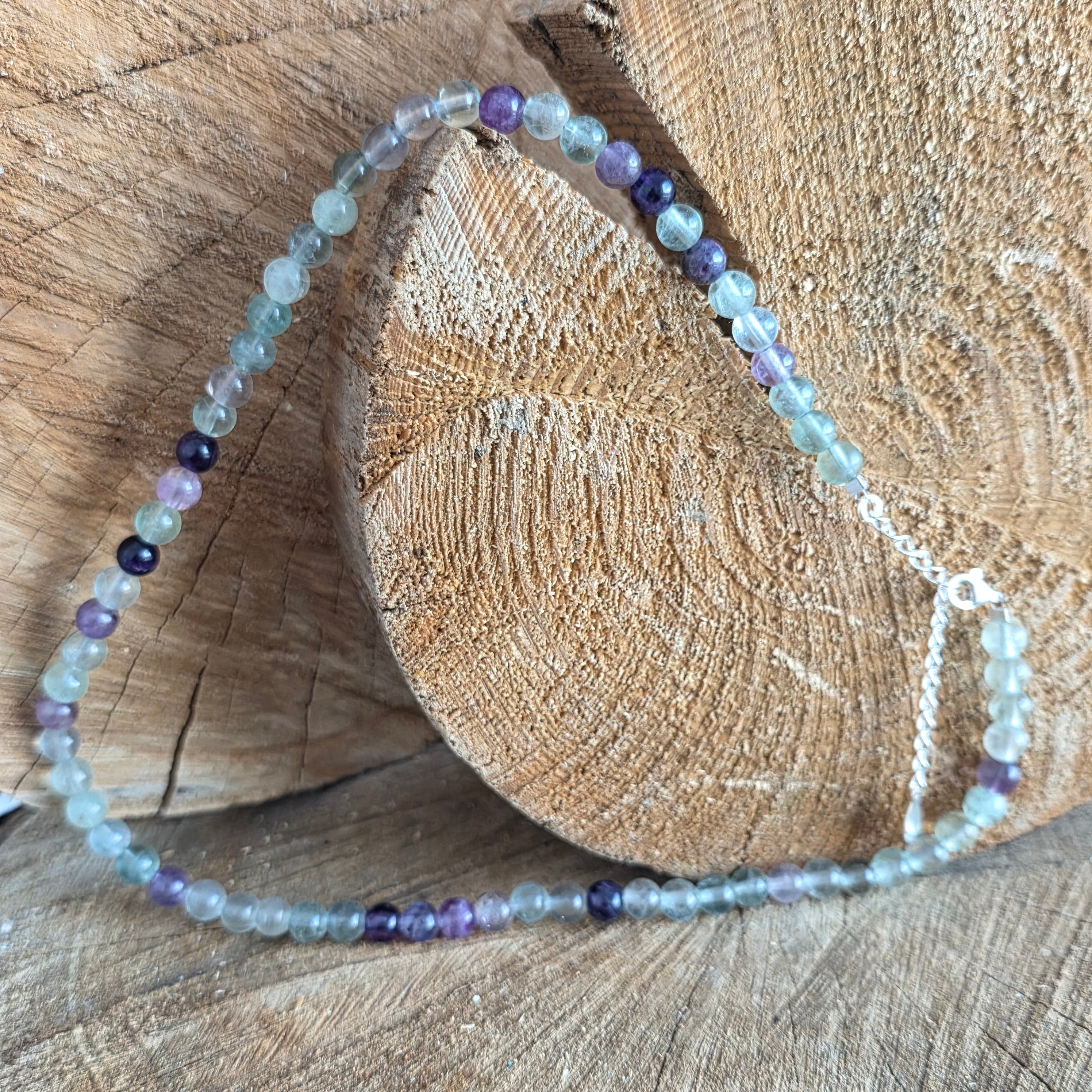 Деликатно и светло, това колие с дъгов флуорит е изработено от фасетирани топчета с диаметър 3 мм, внимателно полиран, за да подчертае прозрачността и естествените цветови вариации на камъка. Нежните нюанси на зелено, лилаво и синьо се преплитат хармонично, придавайки на колието лек и изискан вид.
