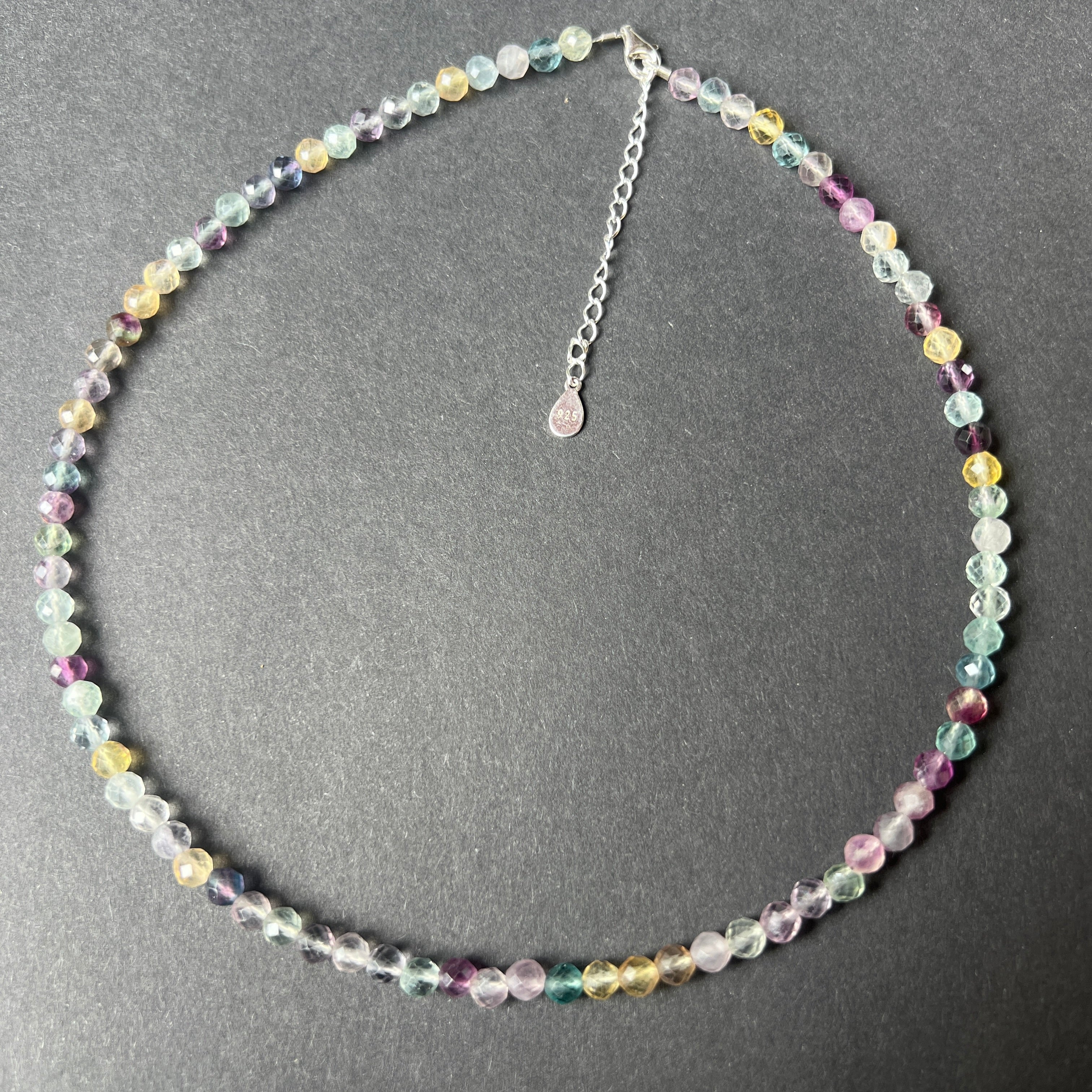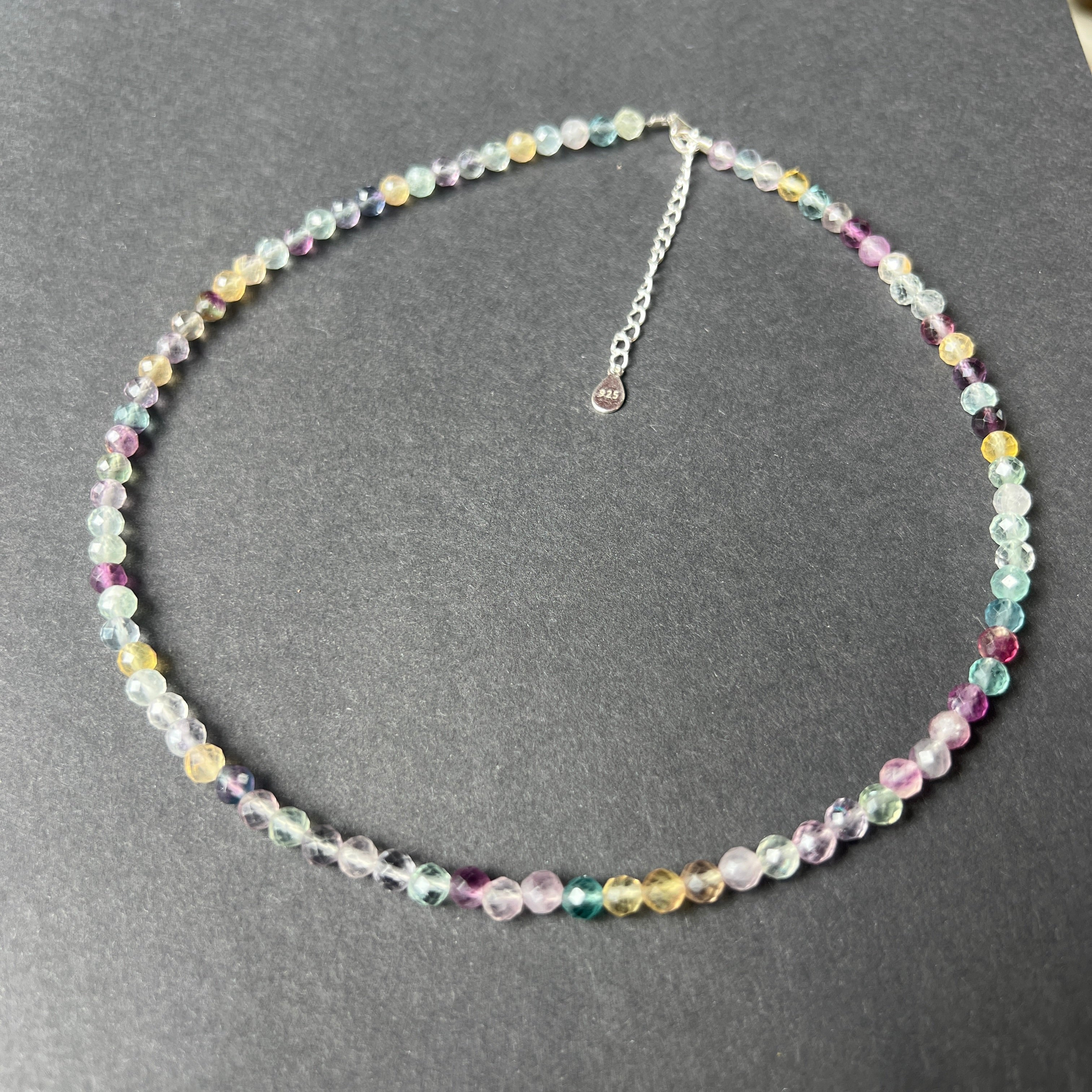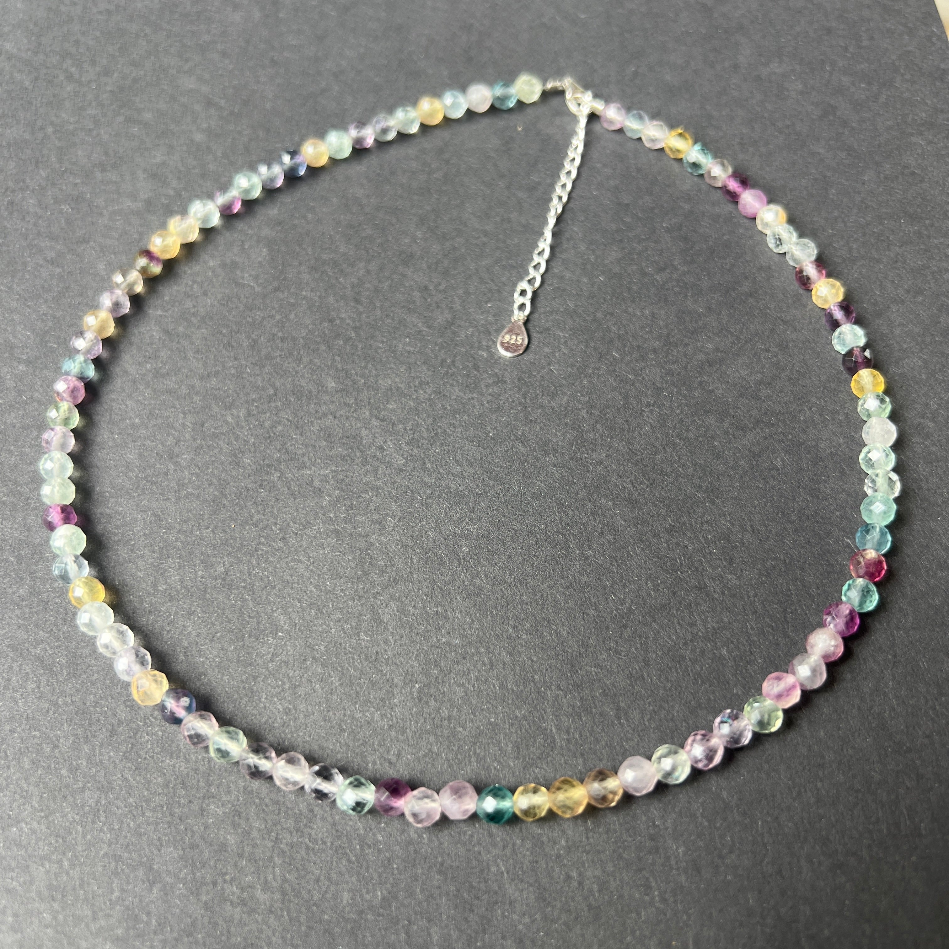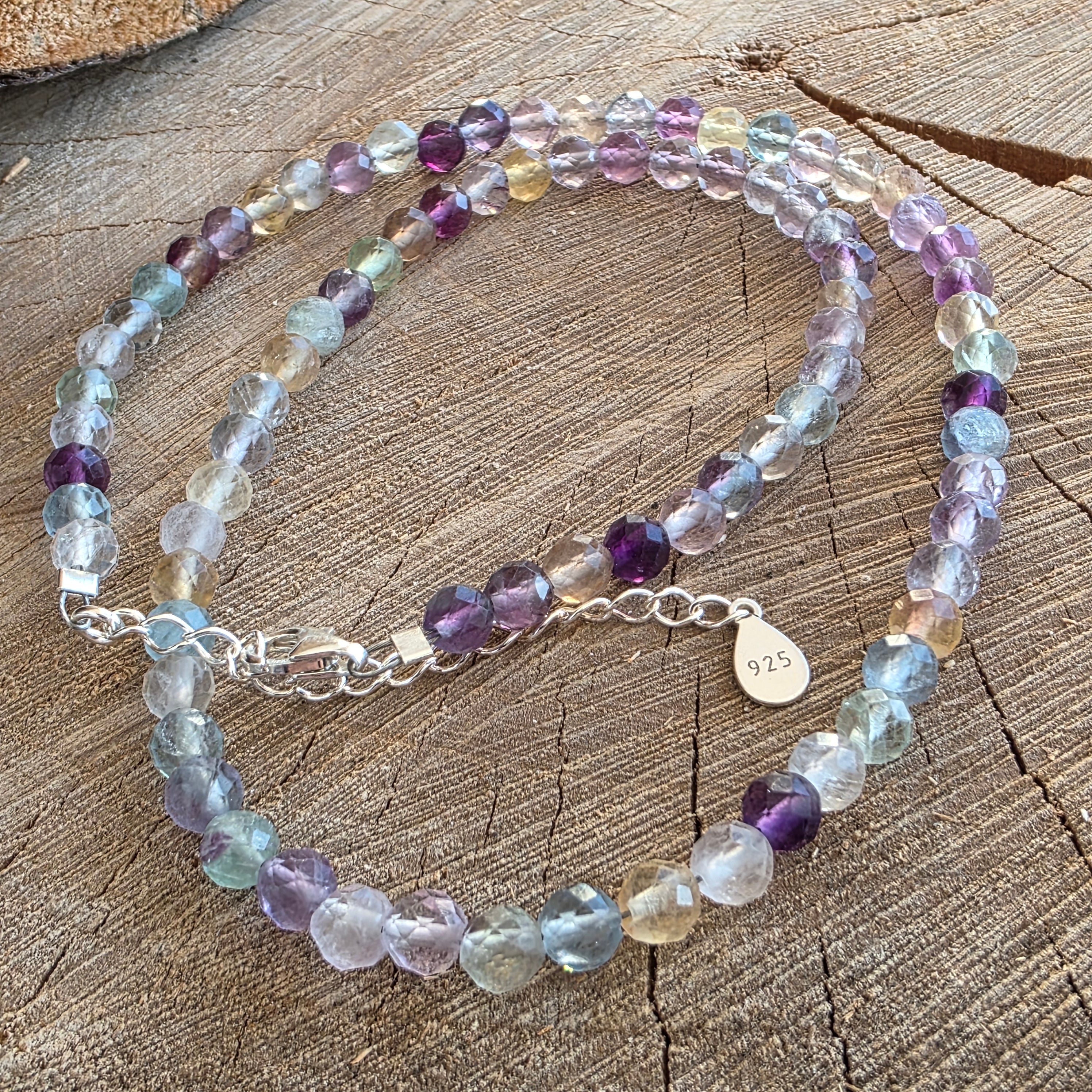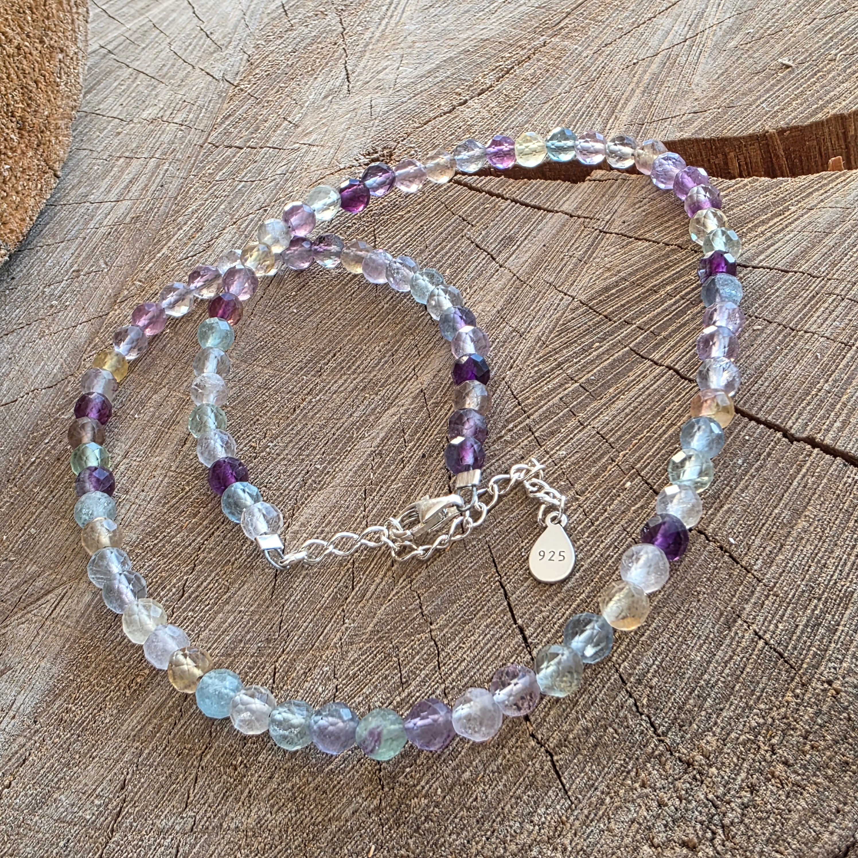 Колие като прозорец, отворен към светлината – живо, ясно, игриво и в същото време дълбоко. Фасетираните перли от дъгов флуорит с диаметър 6 мм блестят в нюанси, които танцуват между виолетово, зелено, синьо и розово, като мост между емоция и разум, между мечта и яснота.
