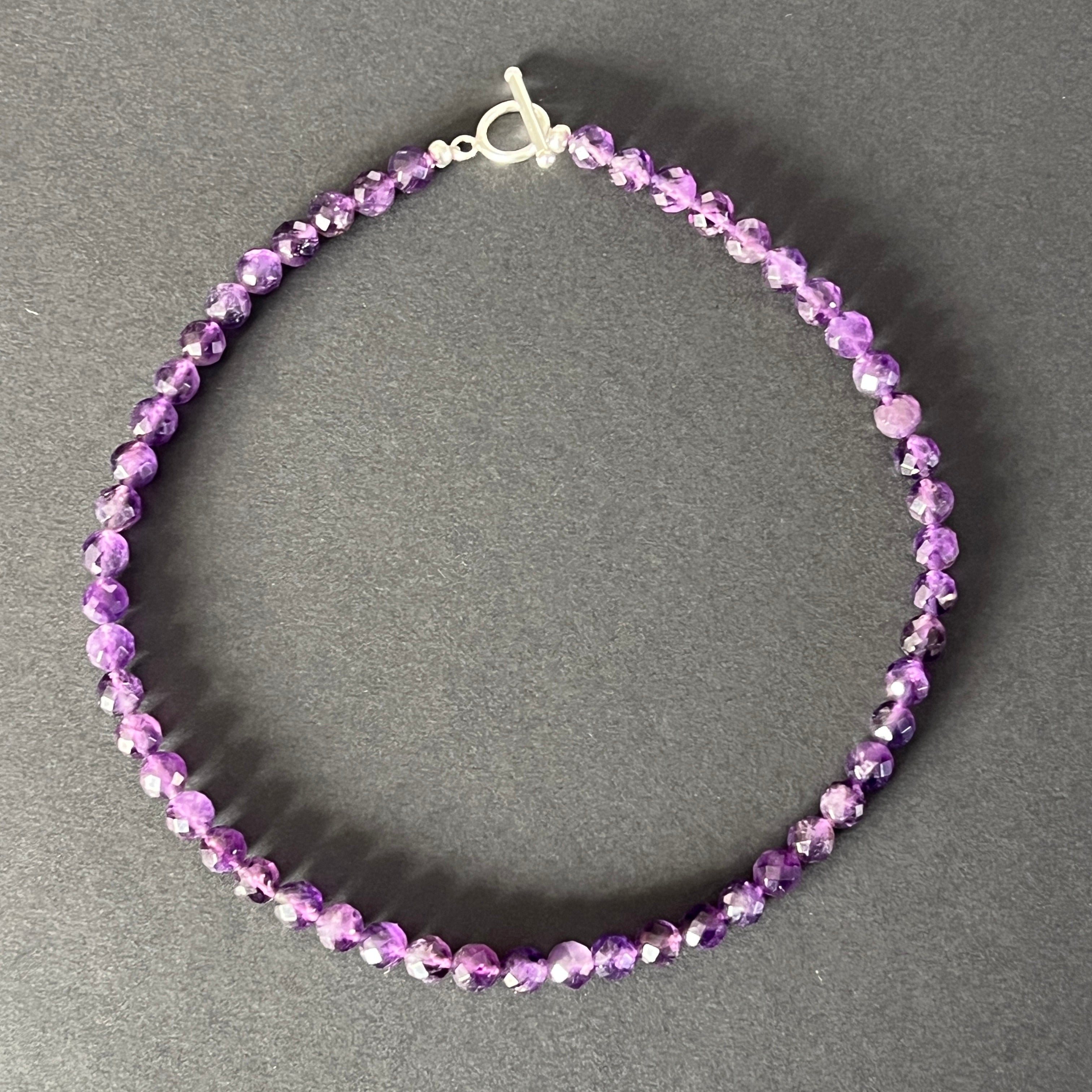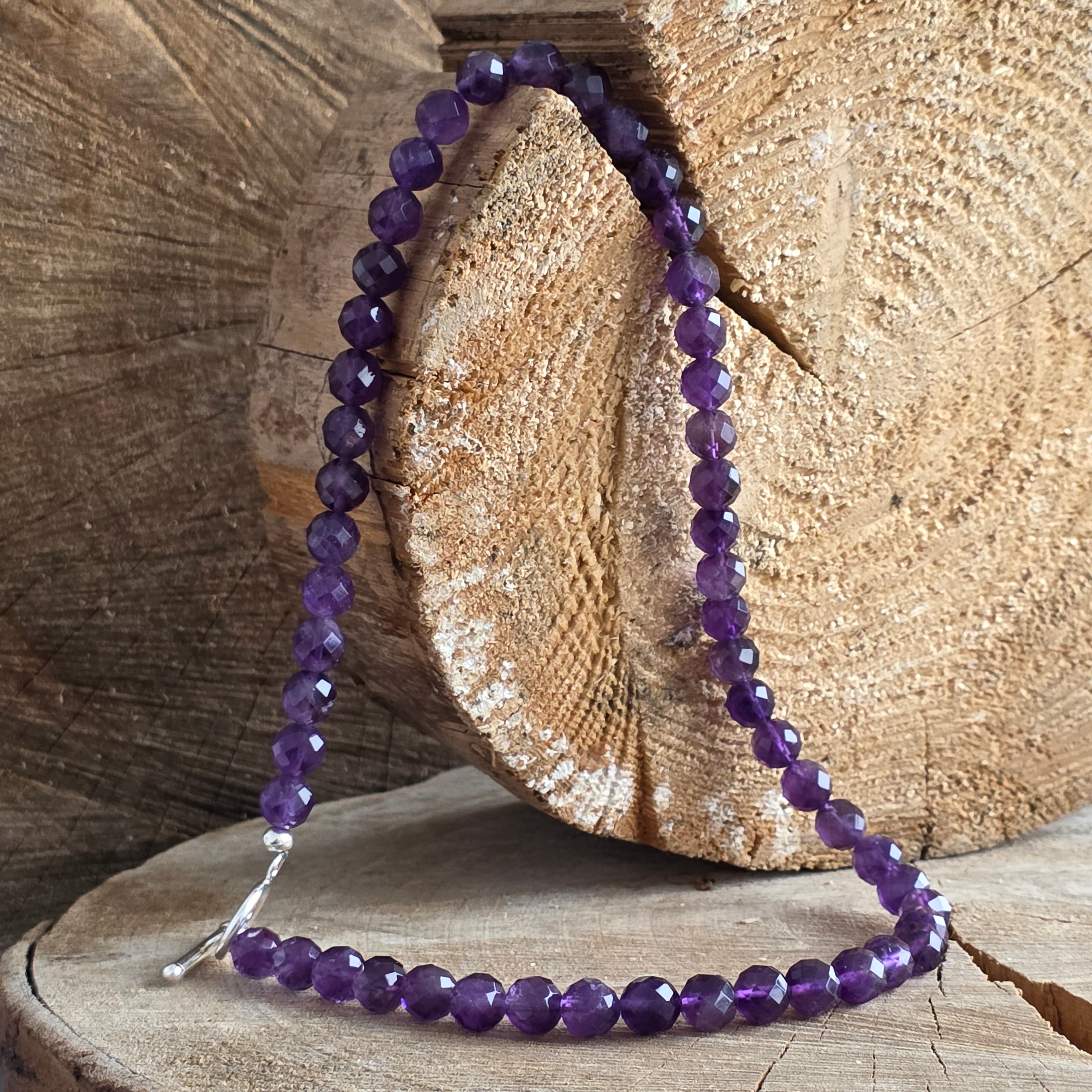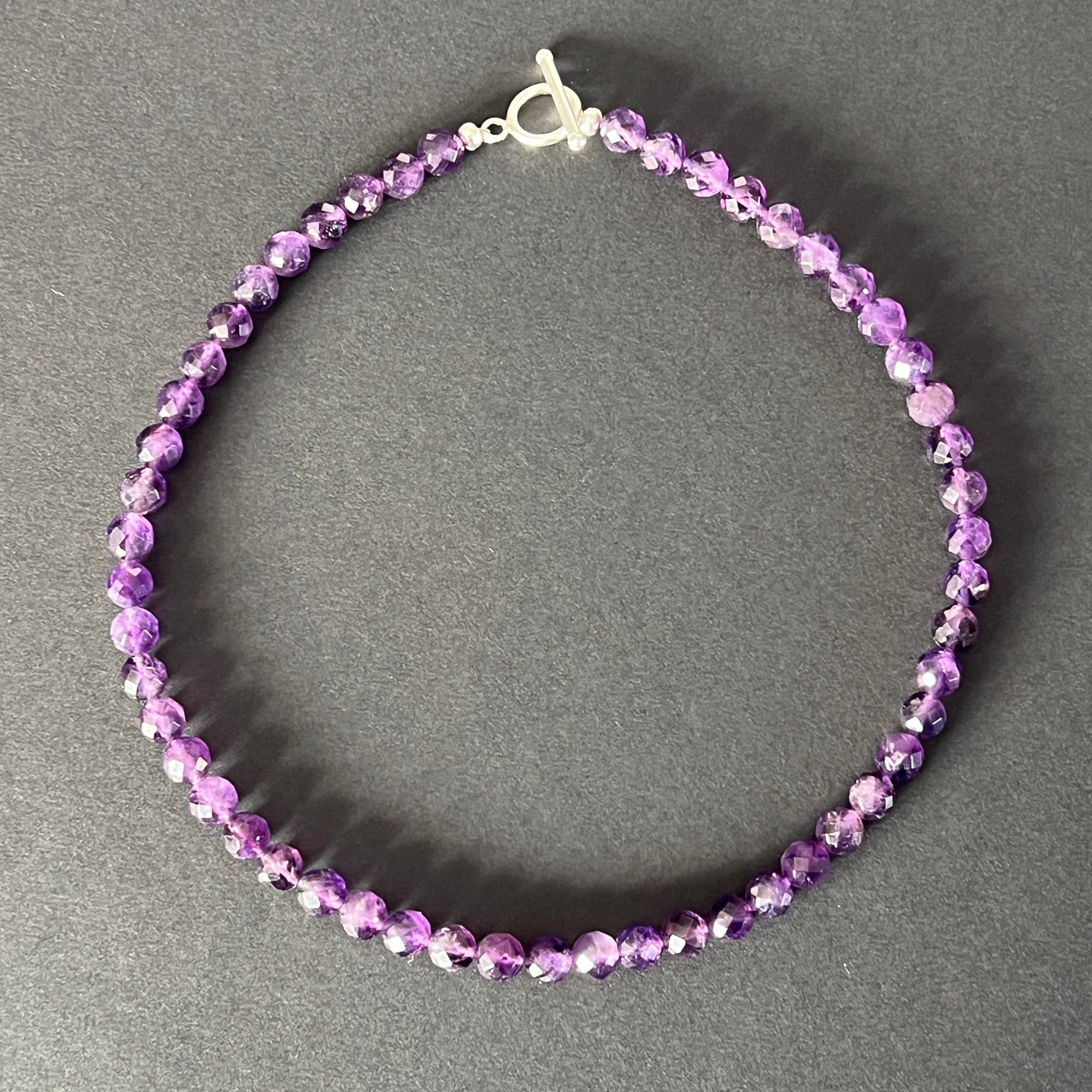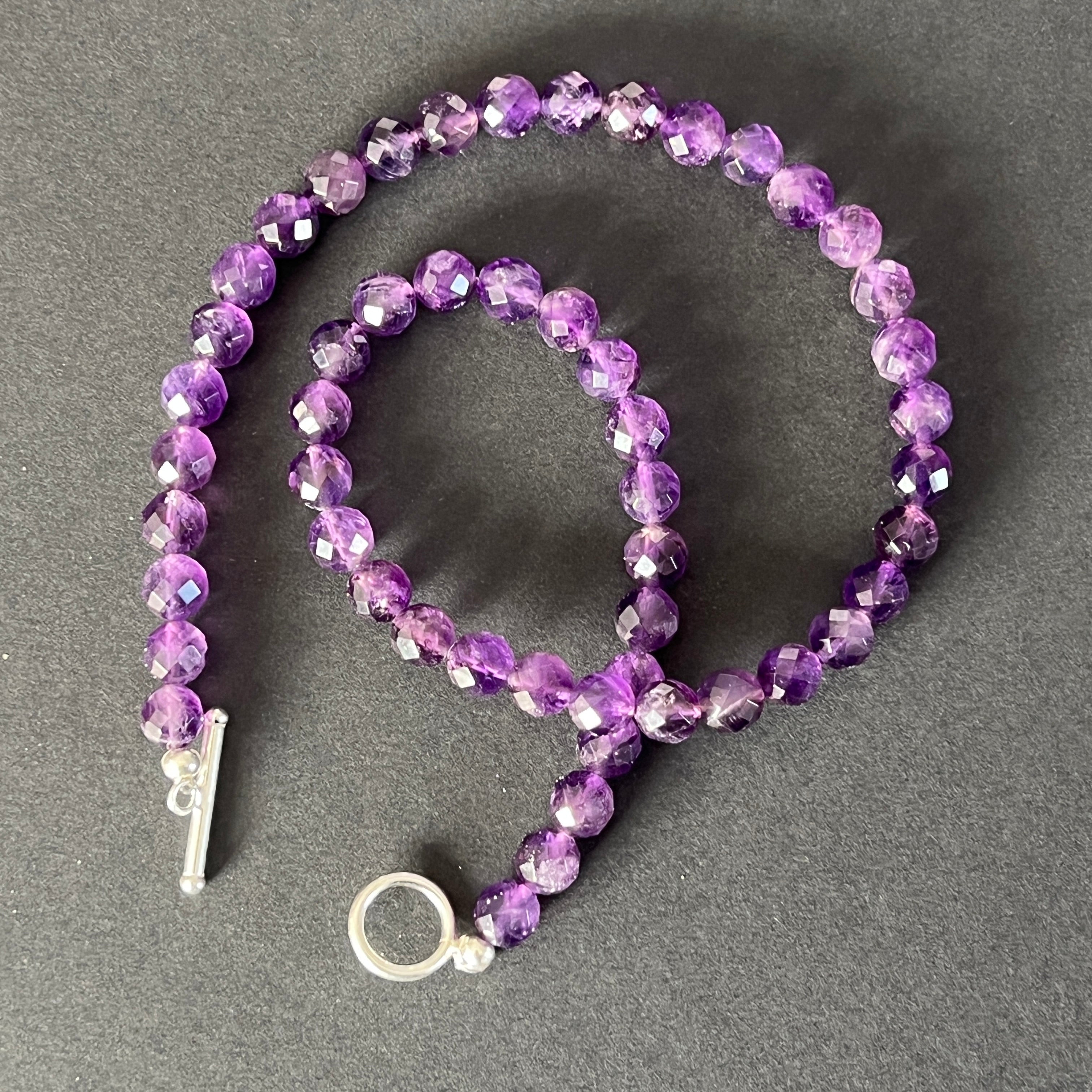 Колие, което съчетава елегантността с дълбочината, подобно на светлина, която се пречупва в виолетовите кристали на здрача. Всяка фасетирана 8 мм сфера от естествен аметист улавя и отразява светлината, създавайки фин танц от отблясъци, като спомен за мистерията и вътрешната благородност.