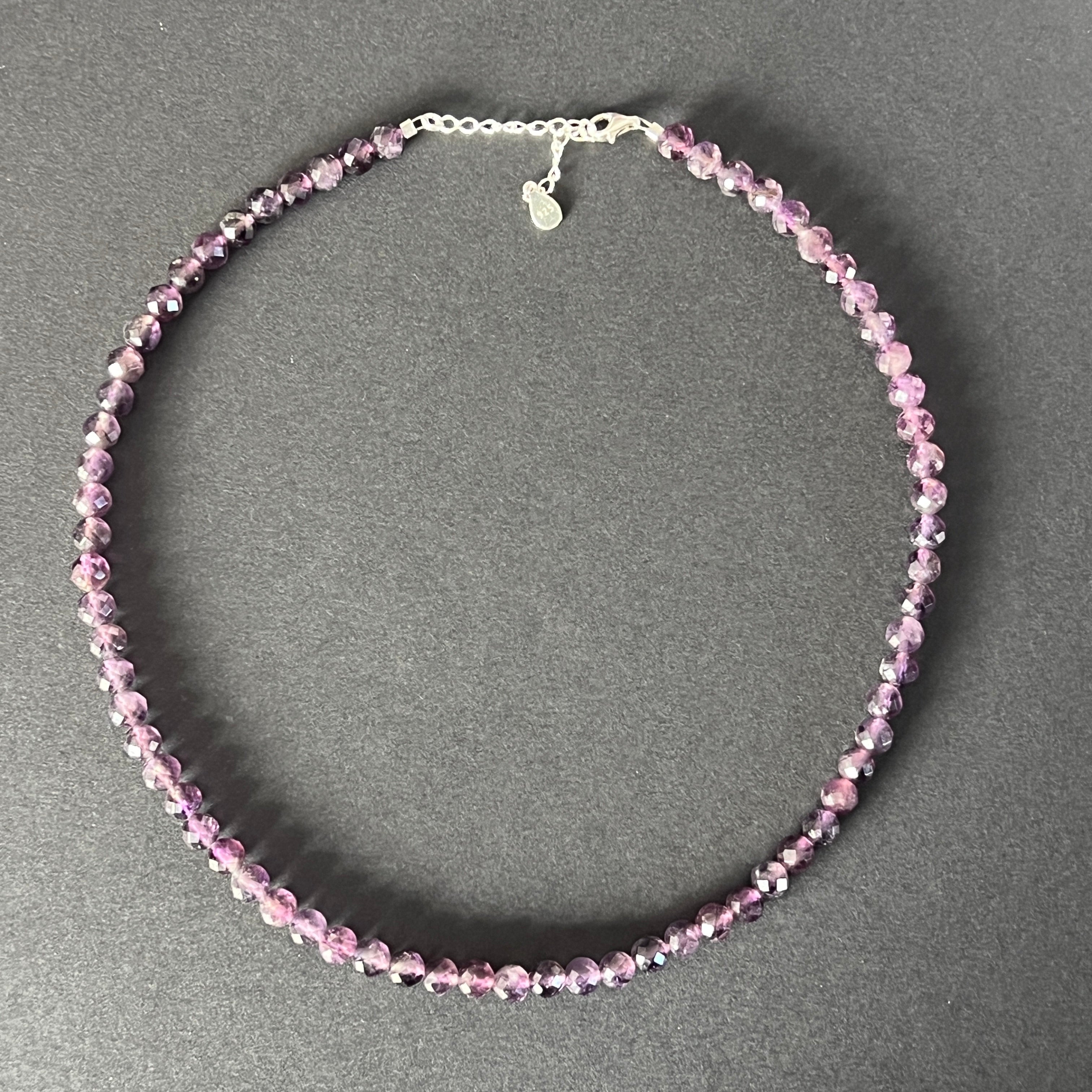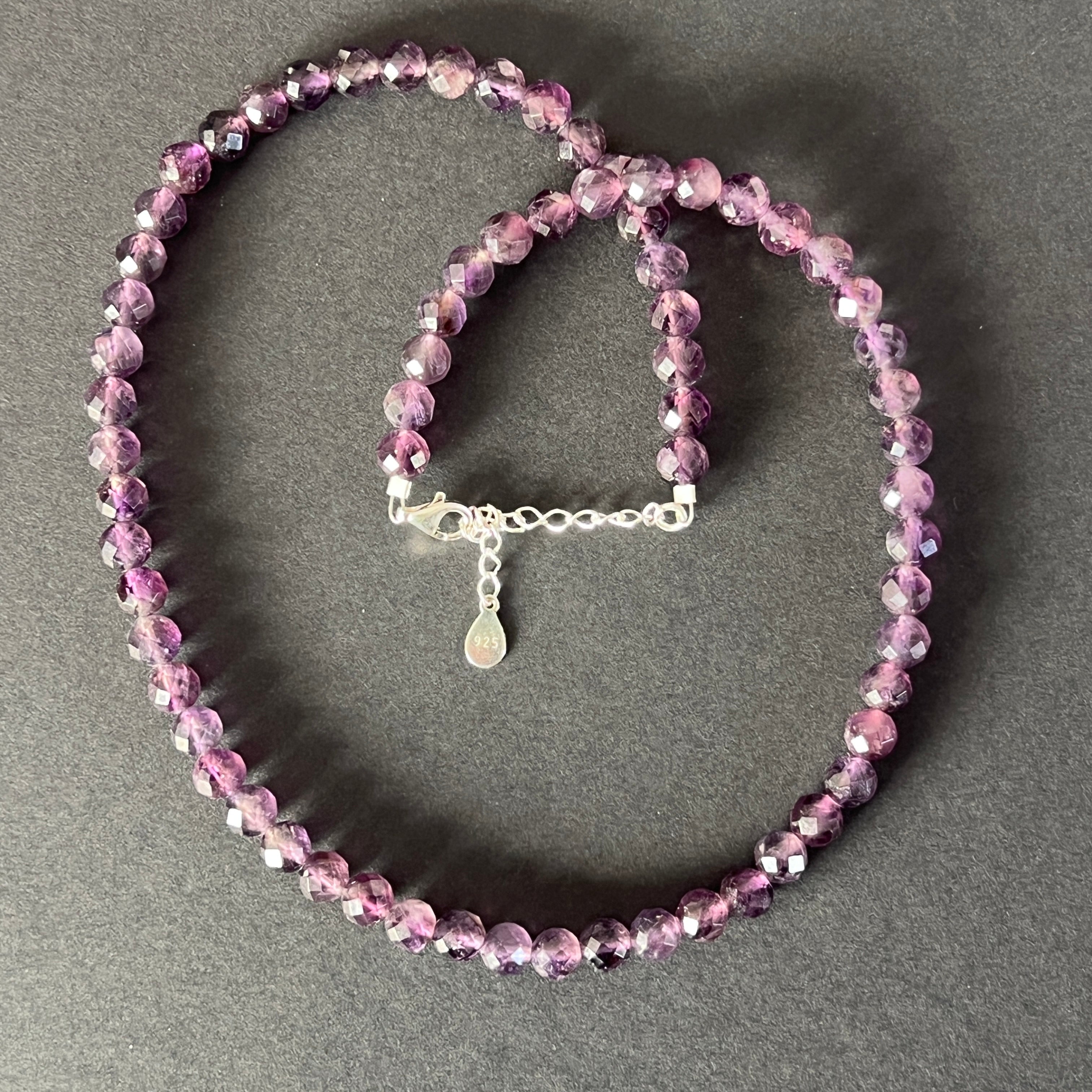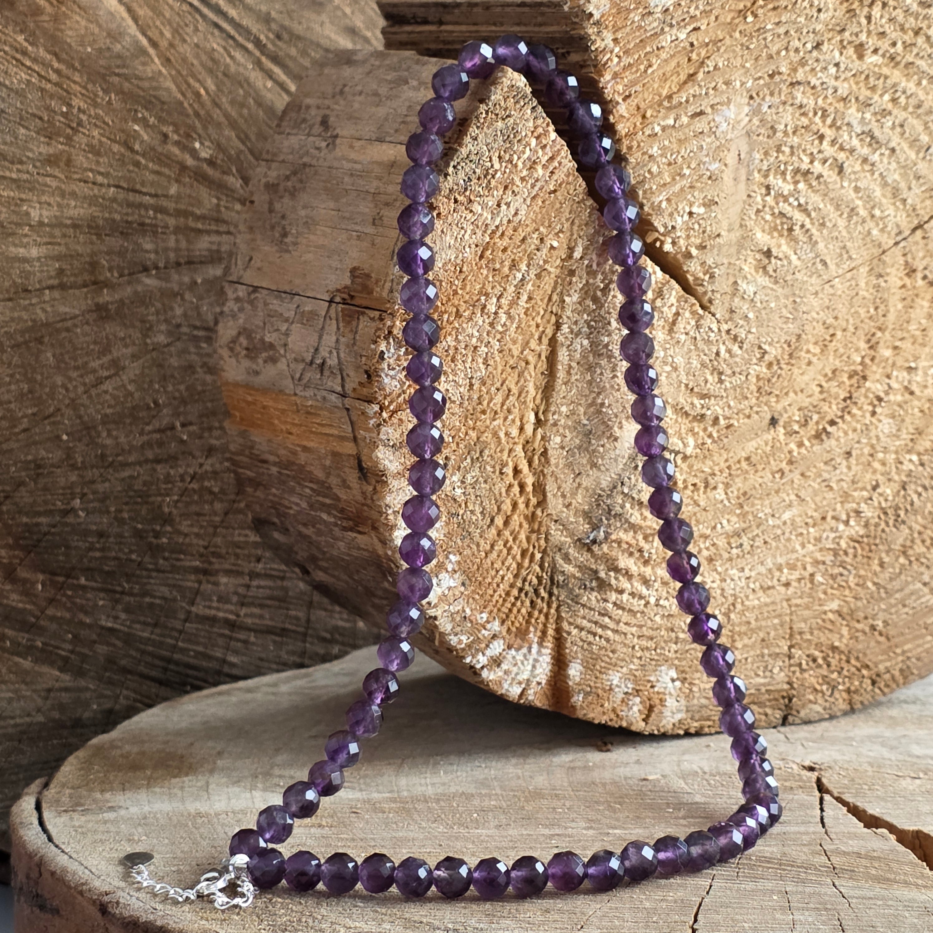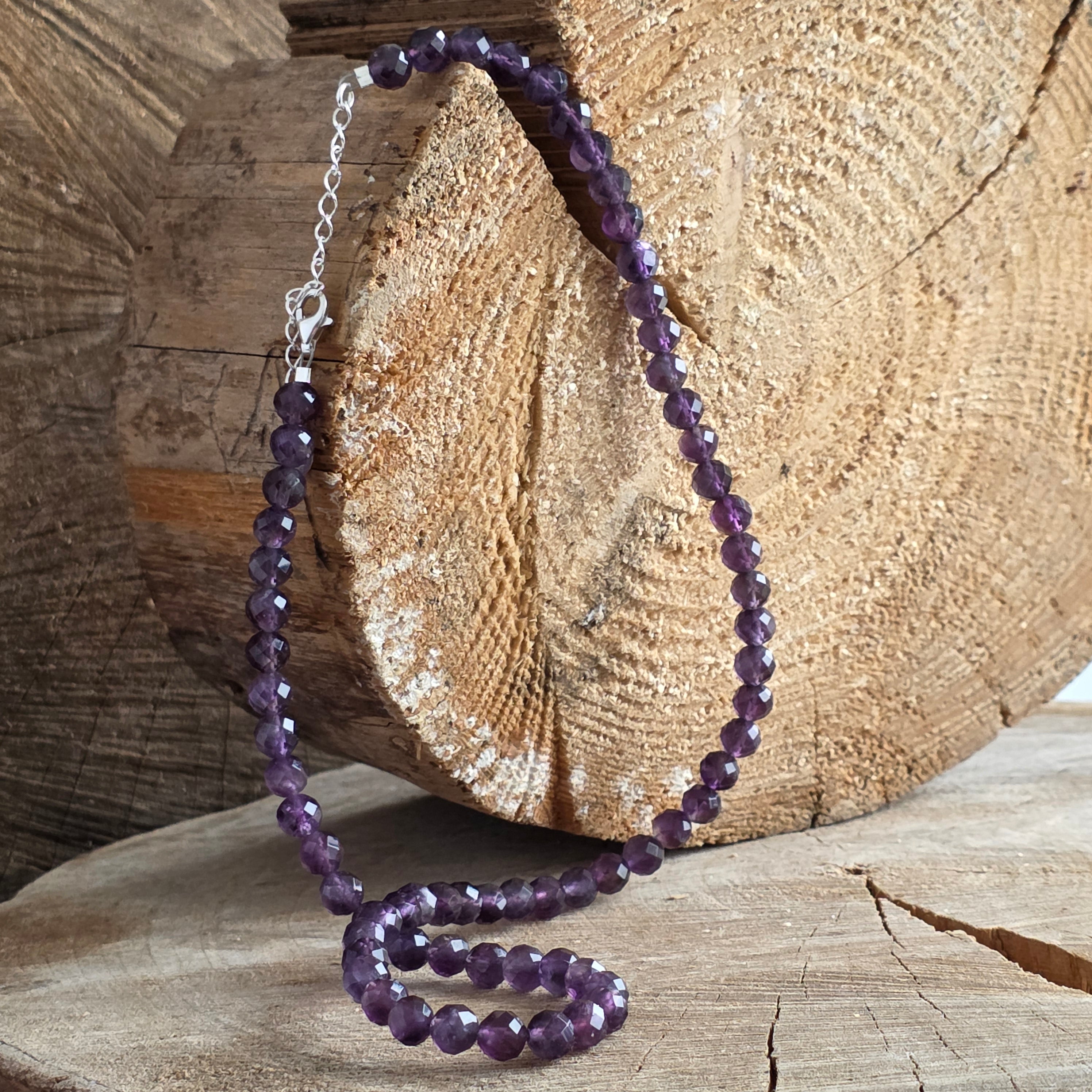 Колие, което носи със себе си деликатността и фината благородност на съня, като шепот на лилаво, запазен върху кожата. 6 мм мънистата от естествен аметист, внимателно фасетирани, блестят дискретно, отразявайки светлината в спокоен и грациозен ритъм.