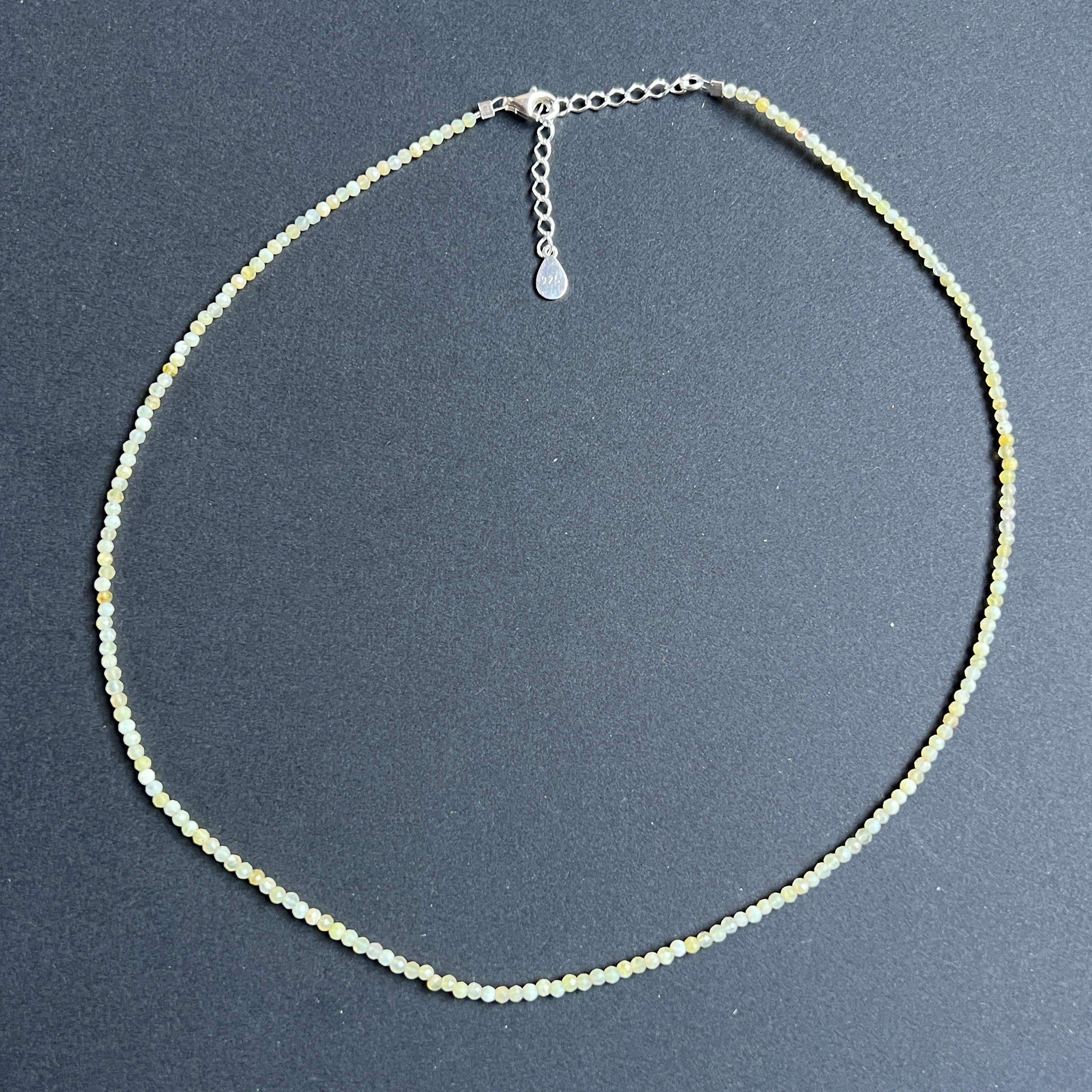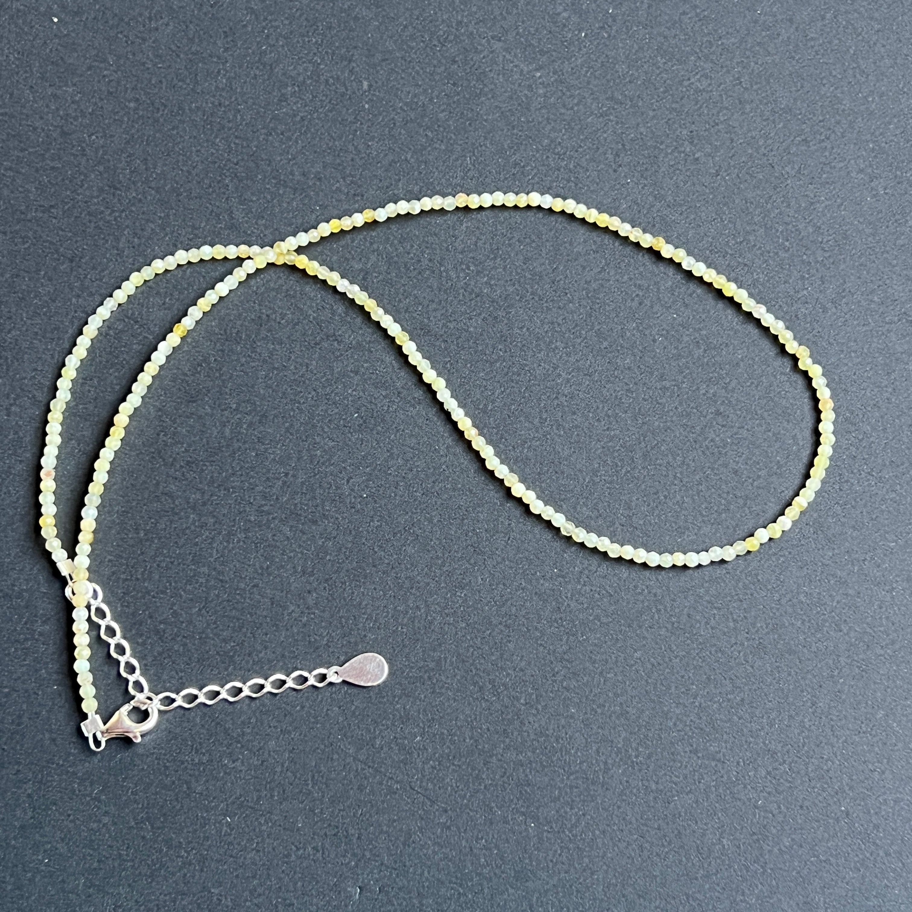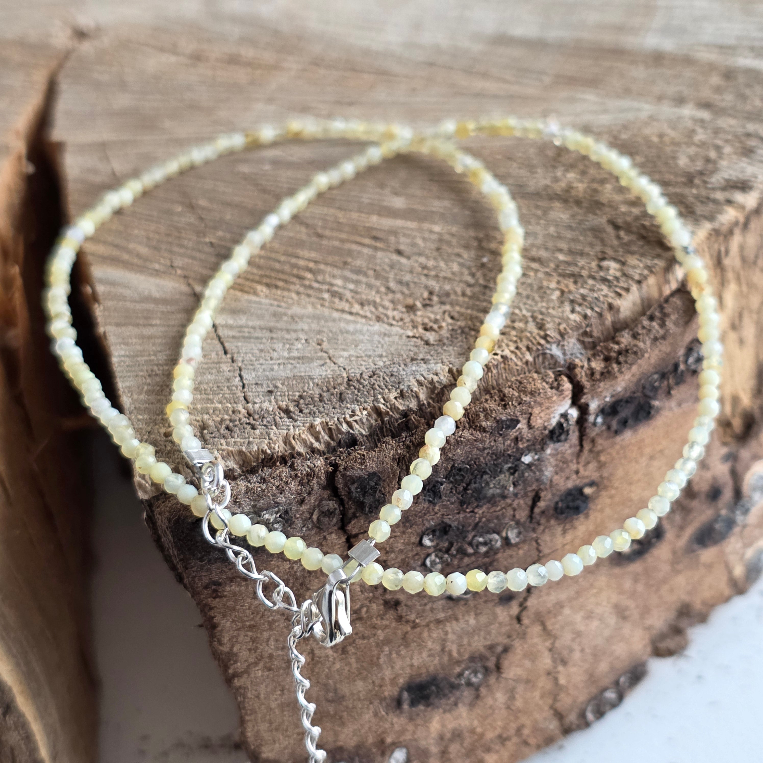 Ниската е съставена от фасетирани сфери от жълт опал 2,5 мм, фини и полупрозрачни мъниста с кадифен блясък, който сякаш идва изпод камъка. Това не е силен цвят, а разсеян, като мед, разтворен в топъл чай, като аурата на тихо утро. Опалесцентните отблясъци, почти незабележими, добавят фина вибрация на мистерия и елегантност.
