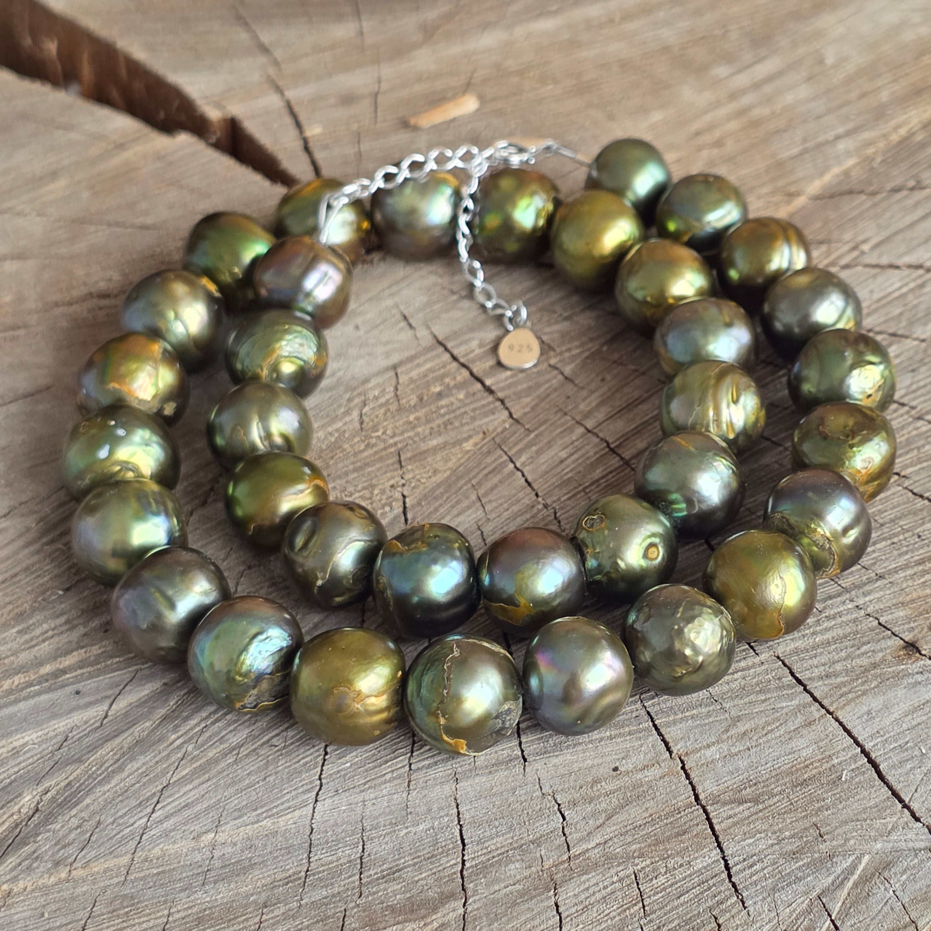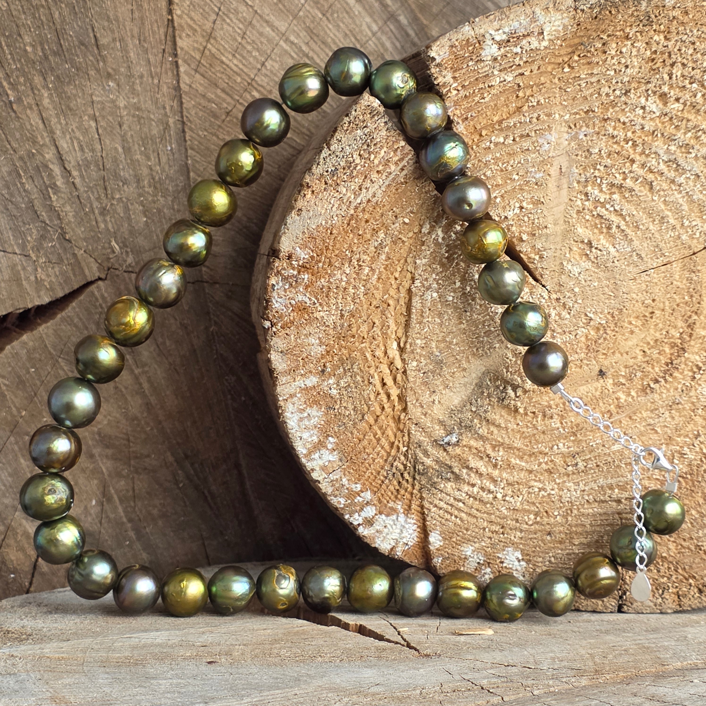 Колие с тиха и изискана елегантност, в нюанси на дълбоко зелено, които предизвикват спокойствието на природата и вътрешния баланс. Перлите от 10 мм придават ясна и изтънчена визия, превръщайки това бижу в аксесоар с характер.