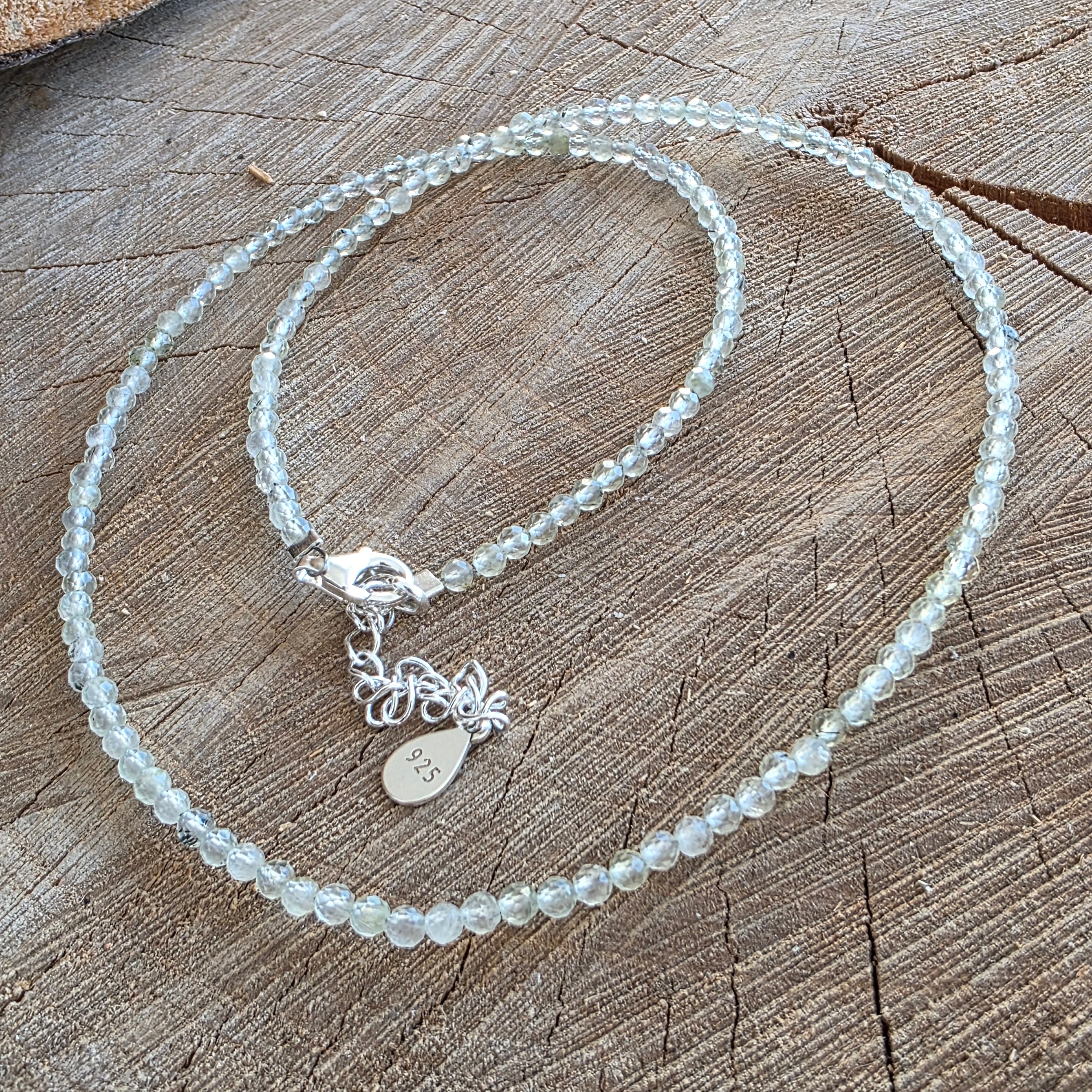 Колие като отворен прозорец към светлината – живо, ясно, игриво и дълбоко едновременно. Фасетираните перли от дъгов флуорит с диаметър 6 мм блестят в нюанси, които танцуват между лилаво, зелено, синьо и розово, като мост между емоцията и разума, между съня и ясно съзнание.