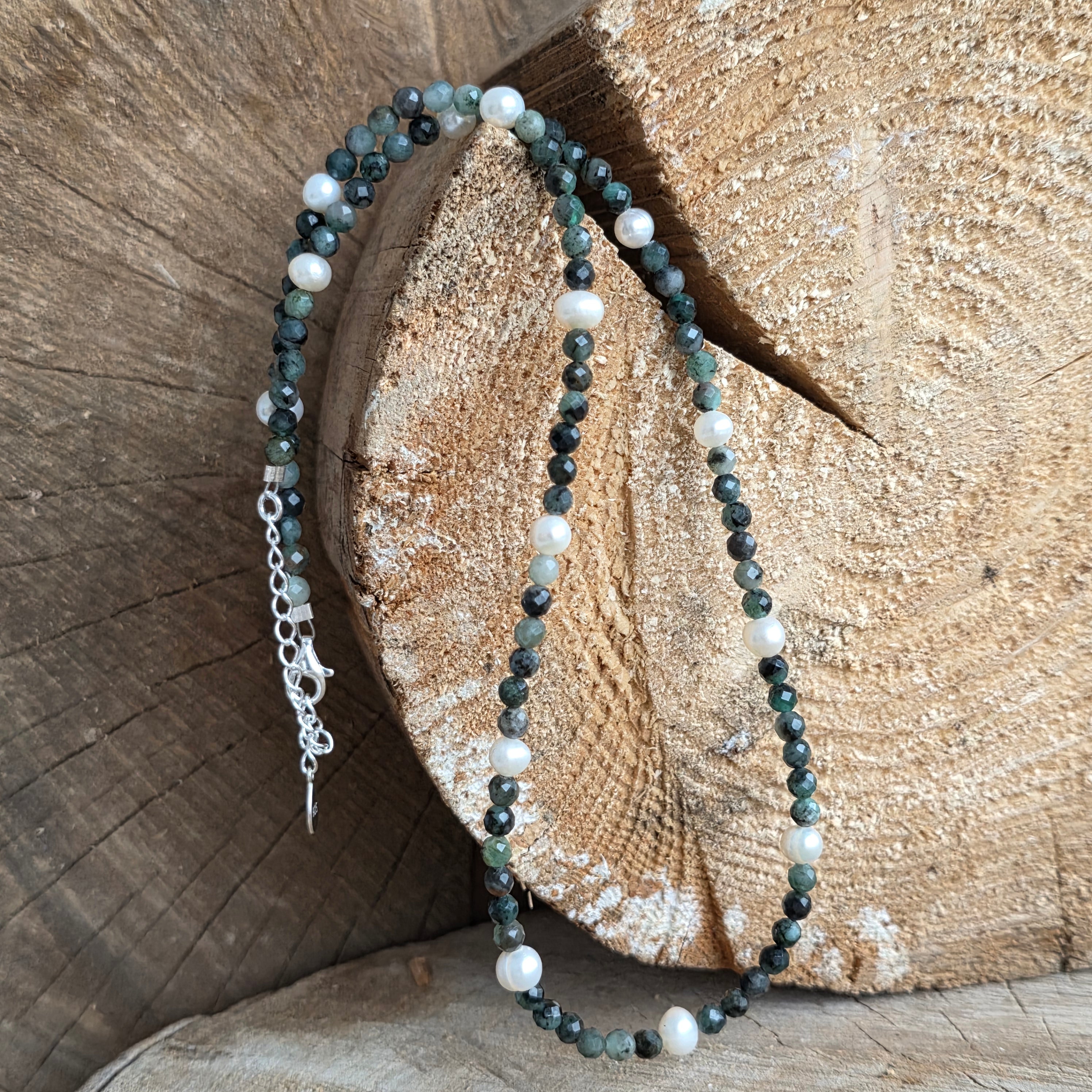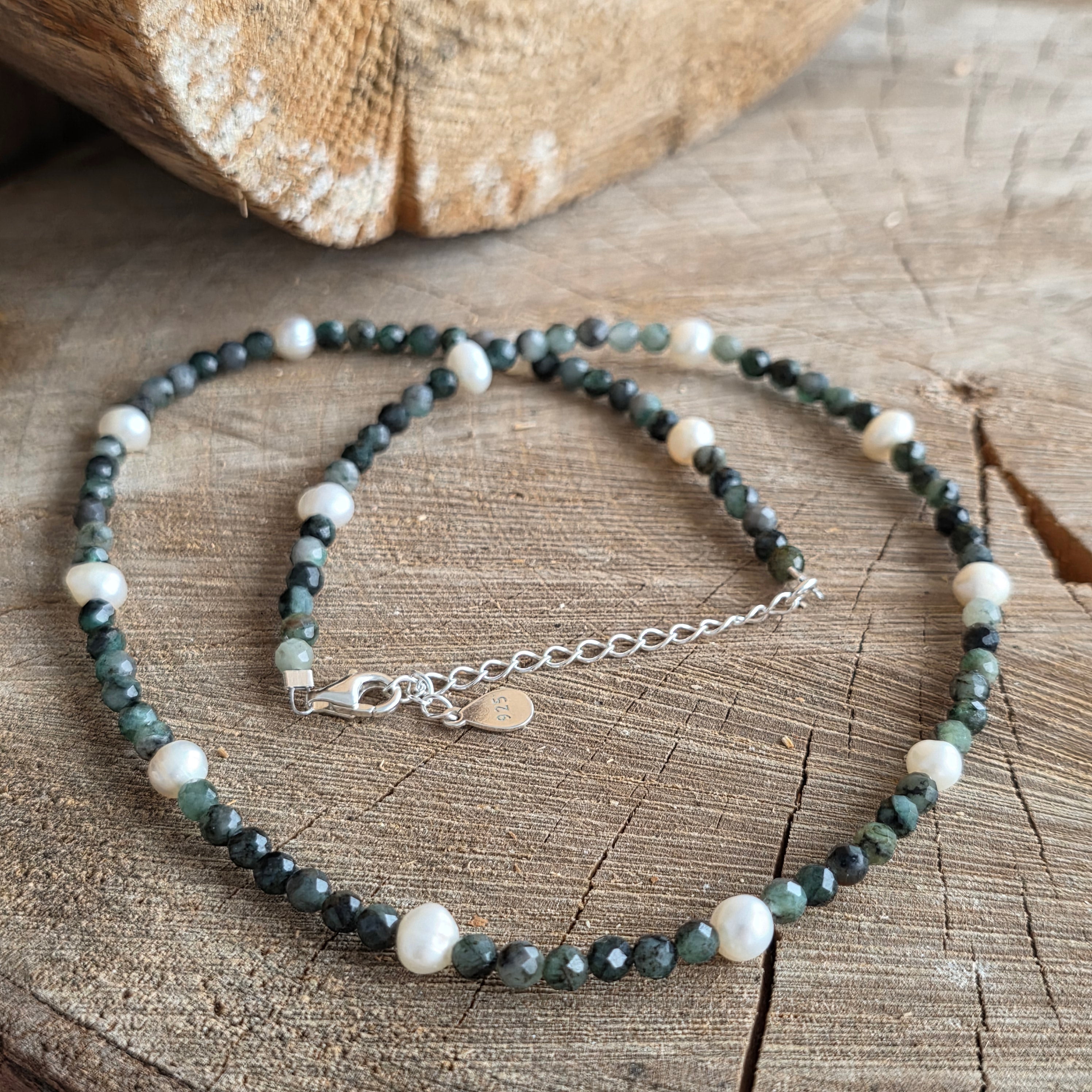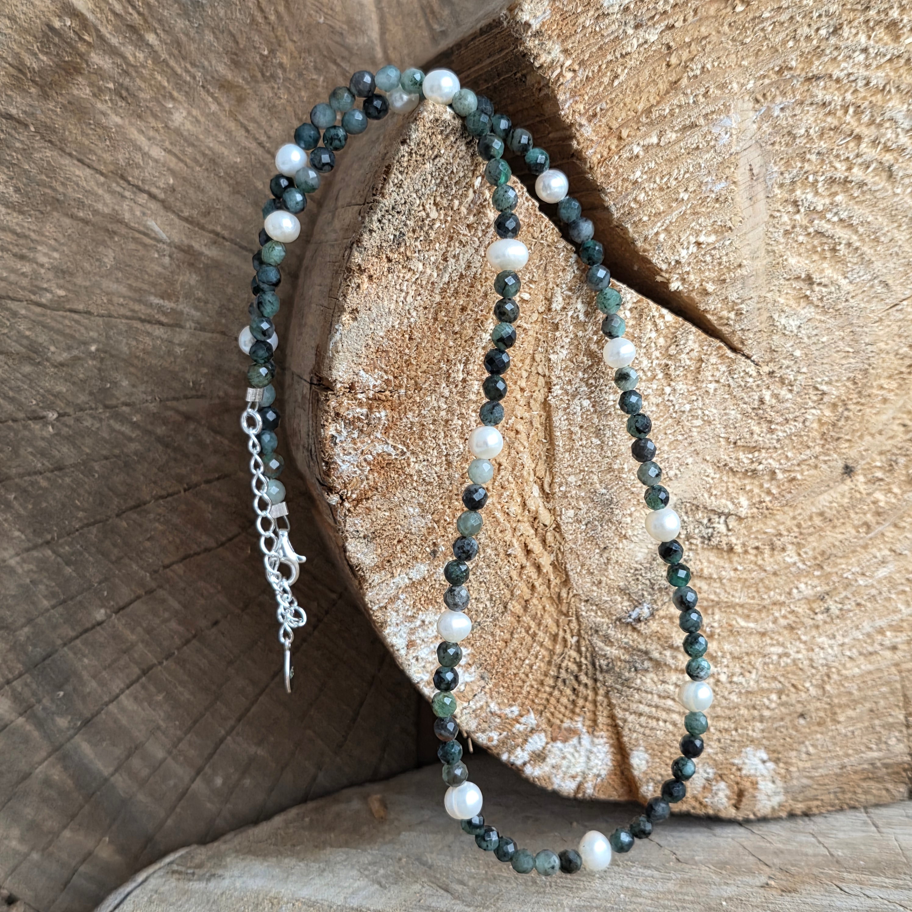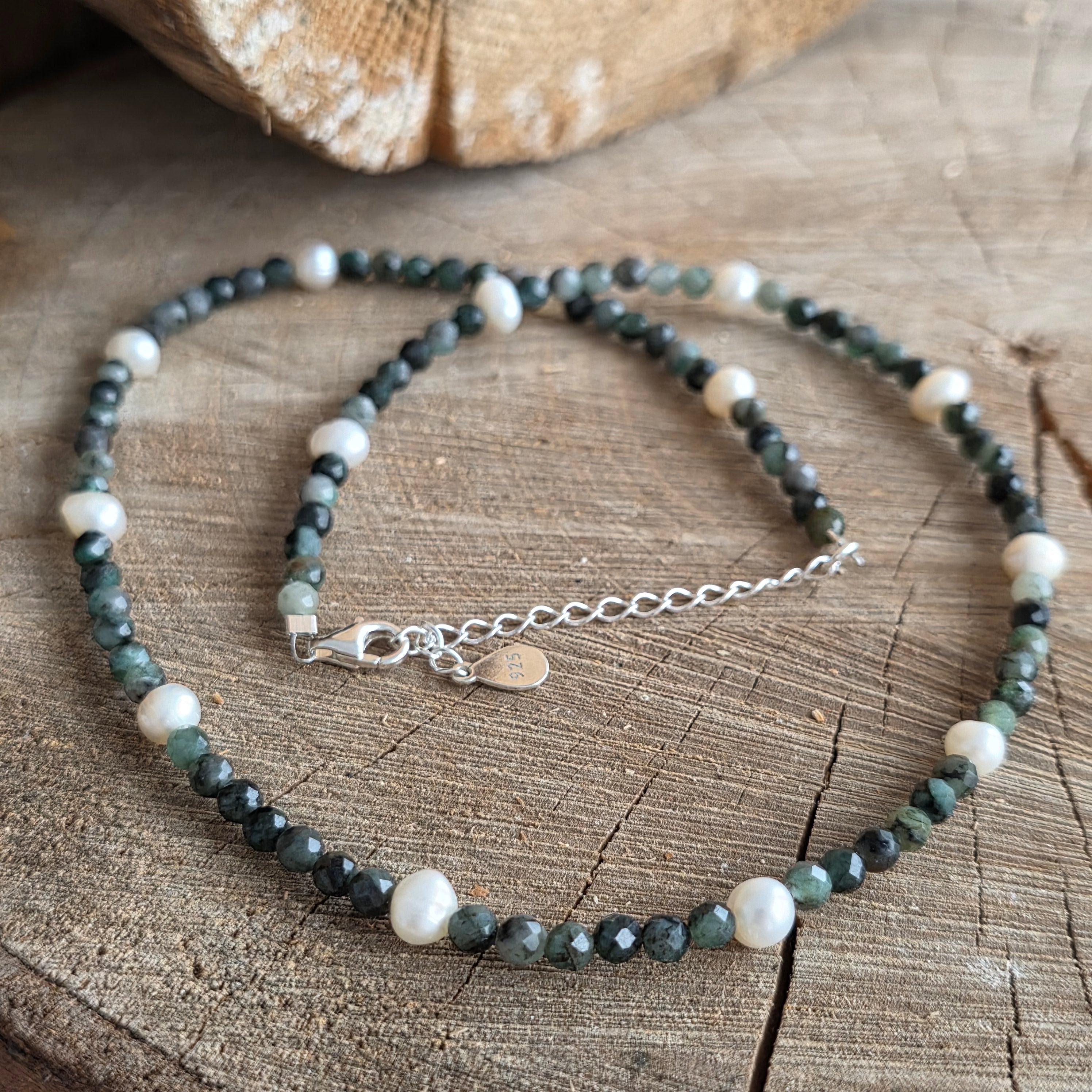 Материали: фасетиран изумруд 3-4 мм, 14 перли 5 мм, сребро 925