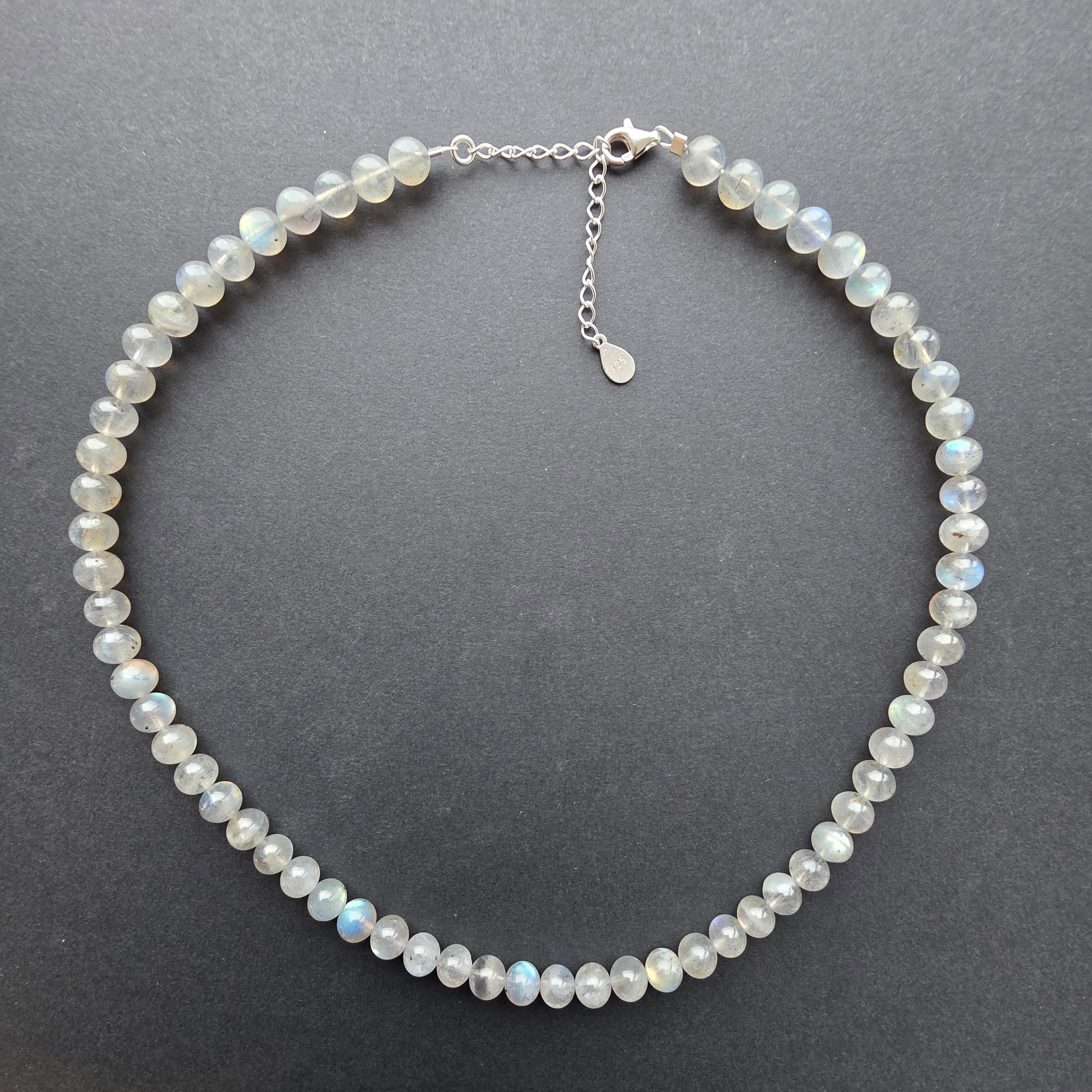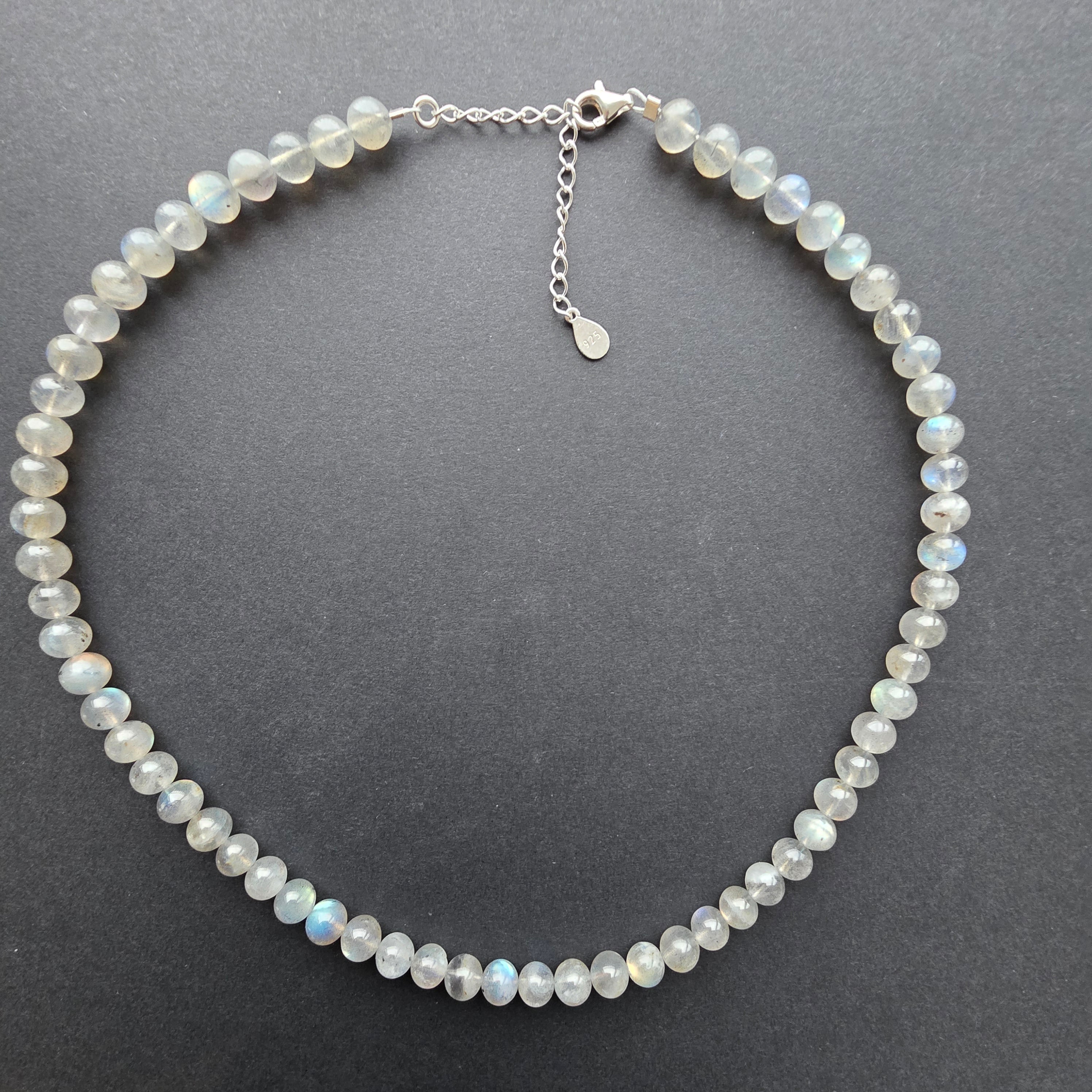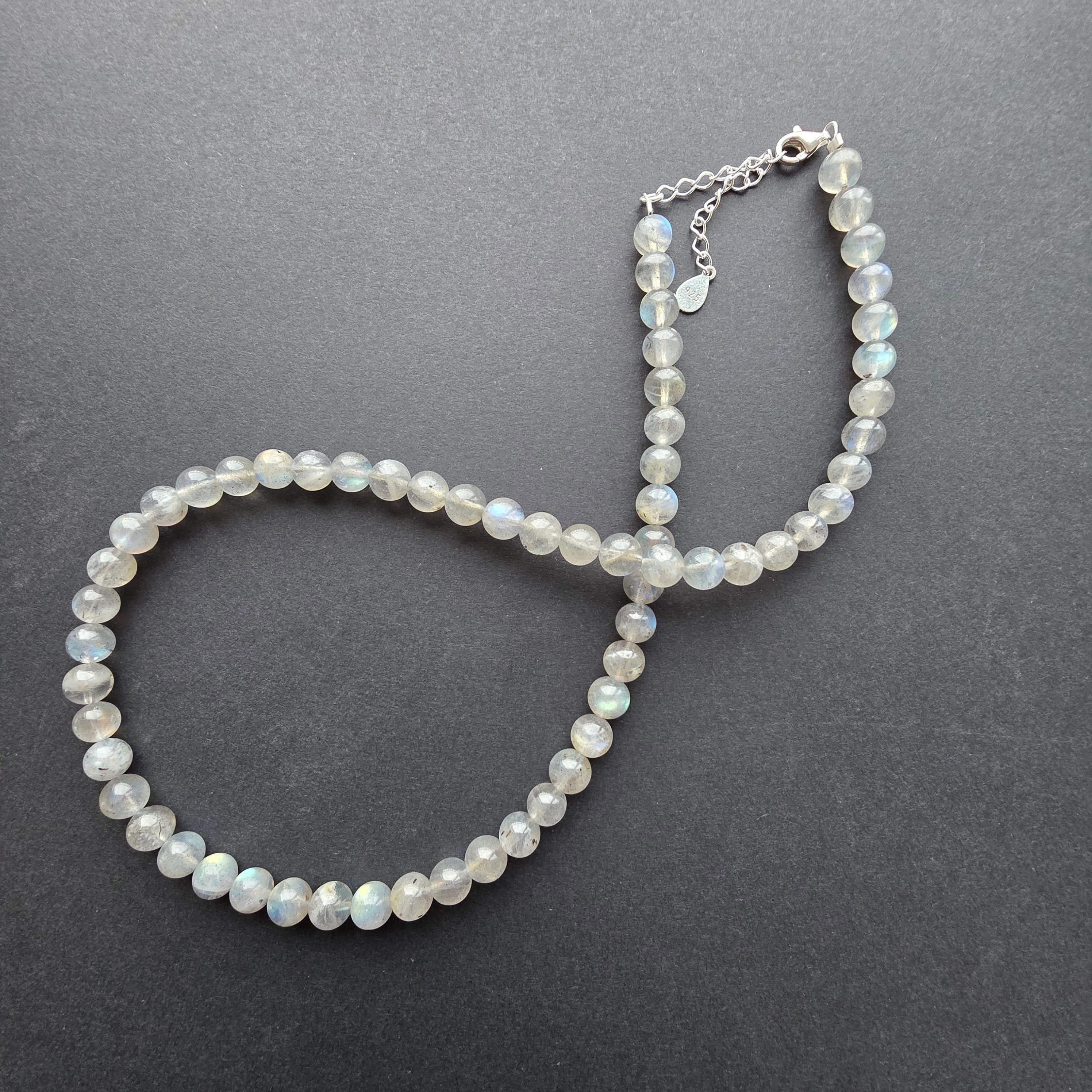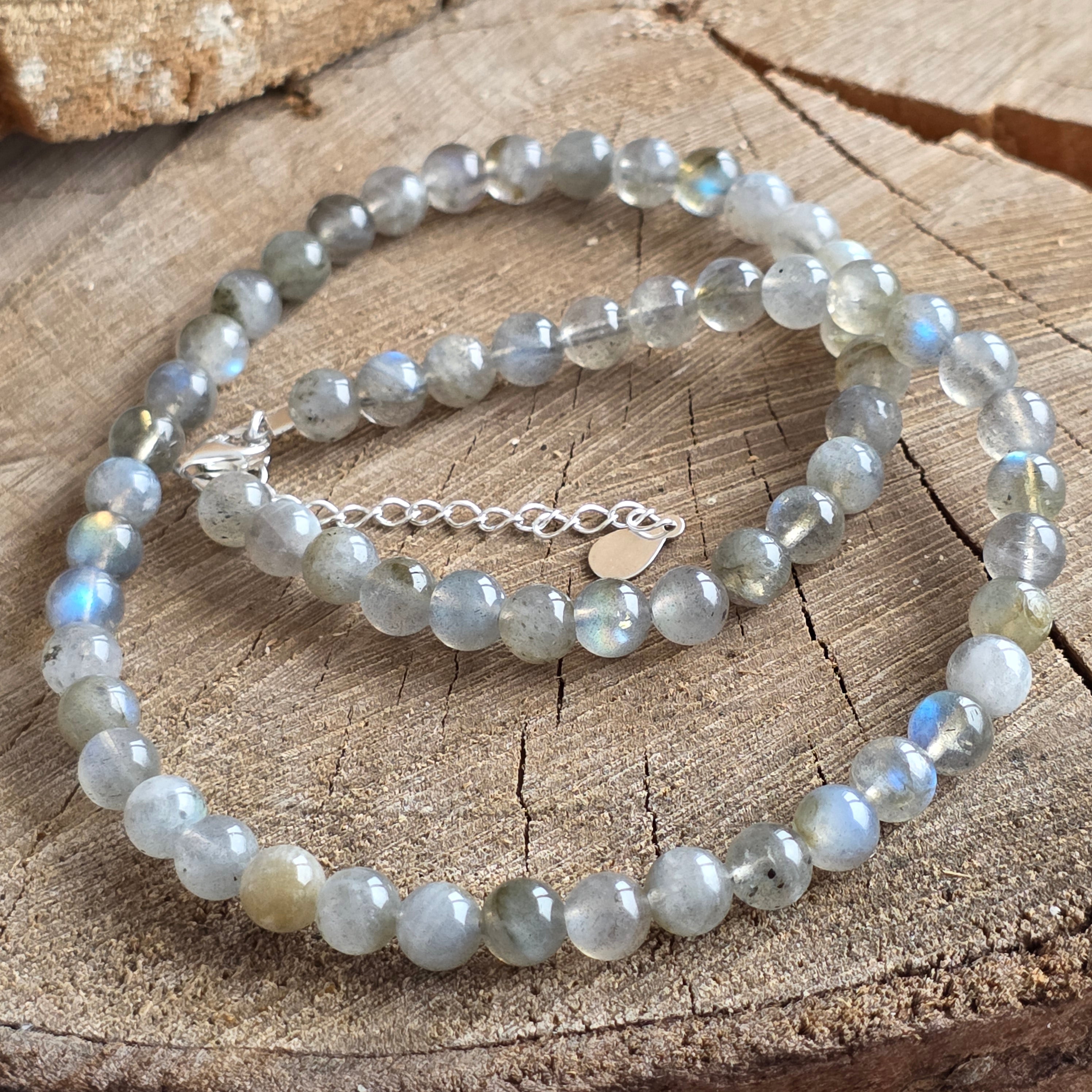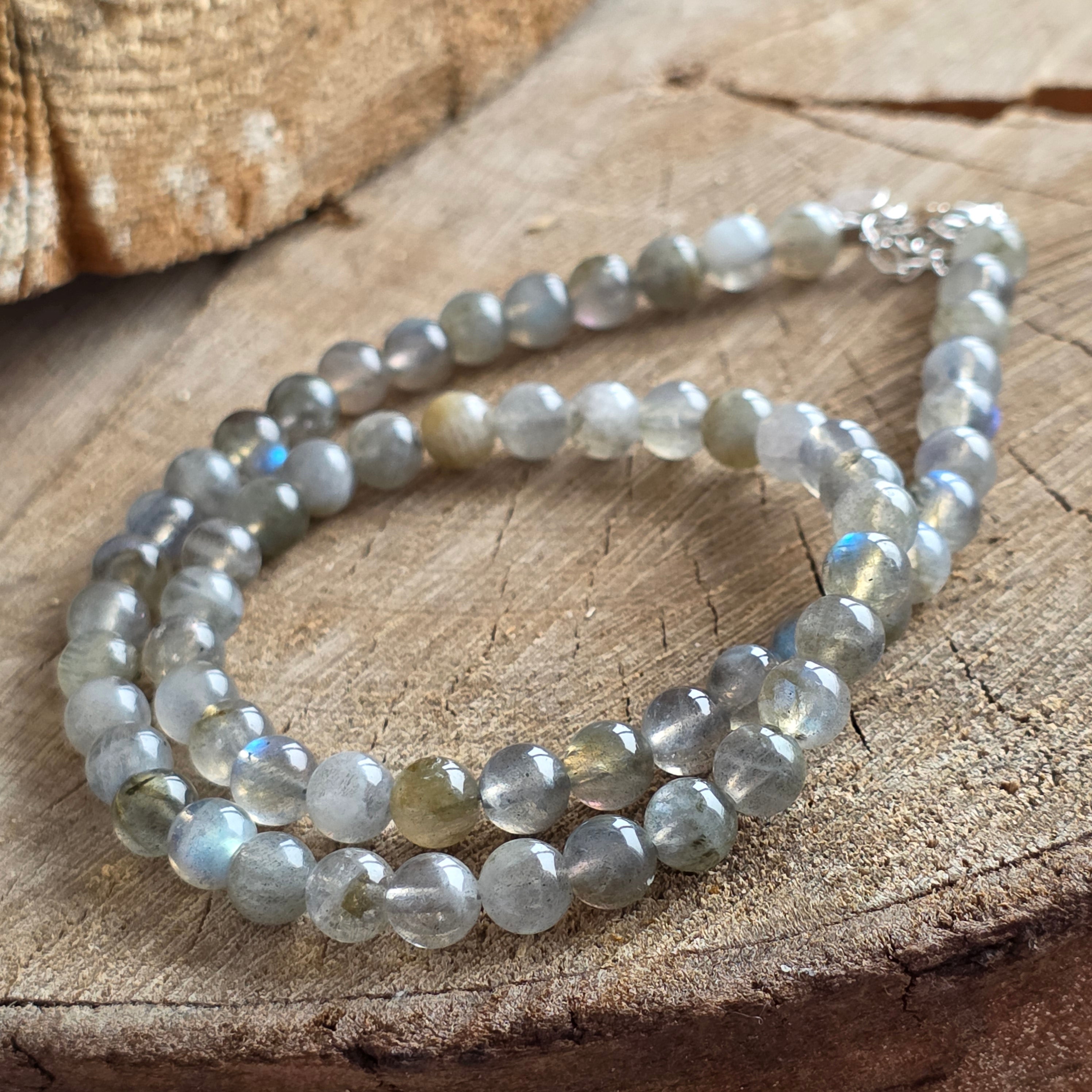 Колие, което улавя северния мистицизъм на светлината, скрита в камъка. Натуралният лабрадорит 6 мм разкрива завладяващи отражения – нюанси на синьо, зелено и понякога златисто – които се движат с светлината, като северно сияние, уловено в кристал. Сферичната форма и гладката повърхност придават модерен и изискан вид, подходящ както за ежедневна употреба, така и за специални моменти.