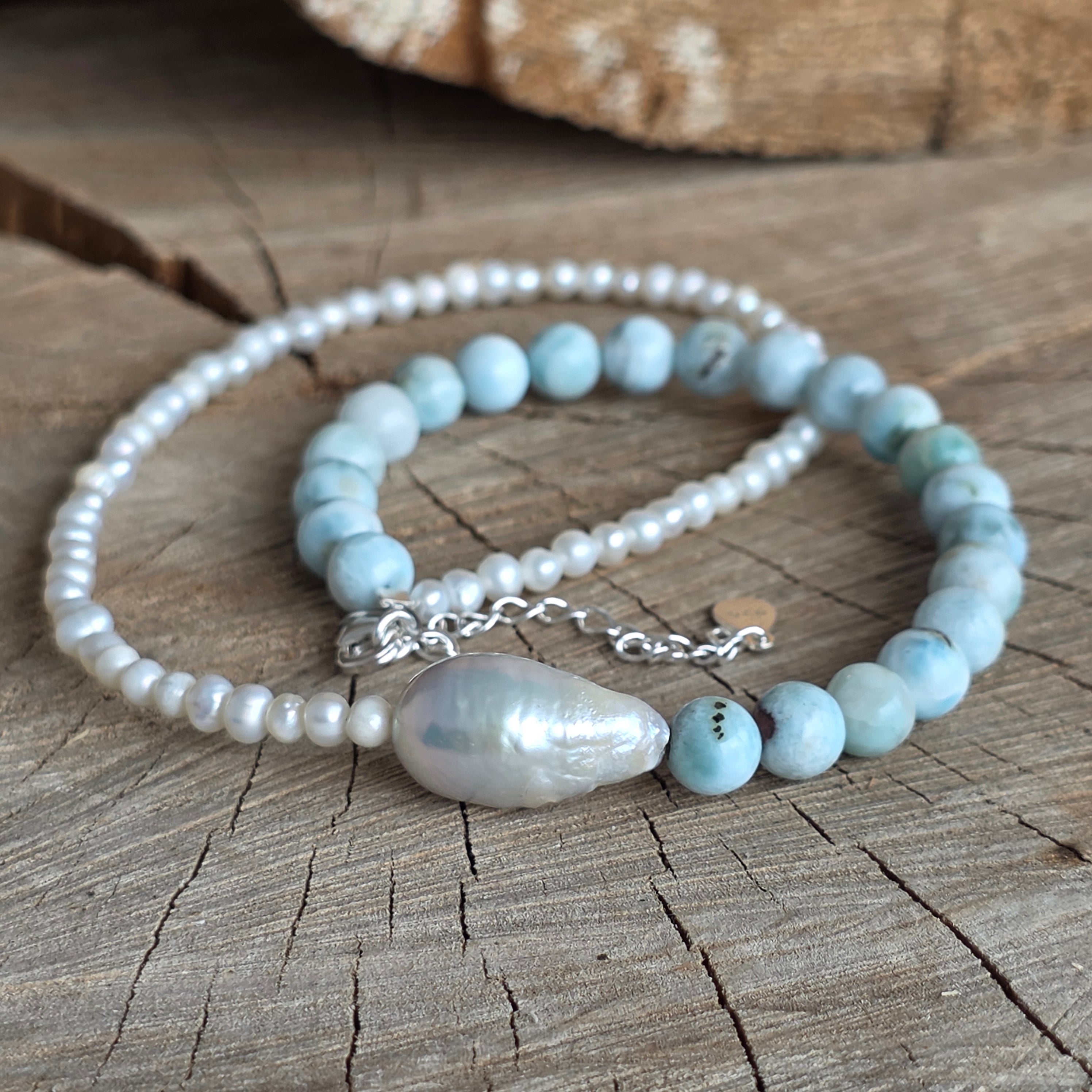 Ларимарът се свързва с спокойствие и яснота, докато културните перли придават нотка на баланс и естествено изящество. Заедно създават бижу, което вдъхва спокойствие, но и дискретна елегантност, лесно за носене по всяко време на деня.
