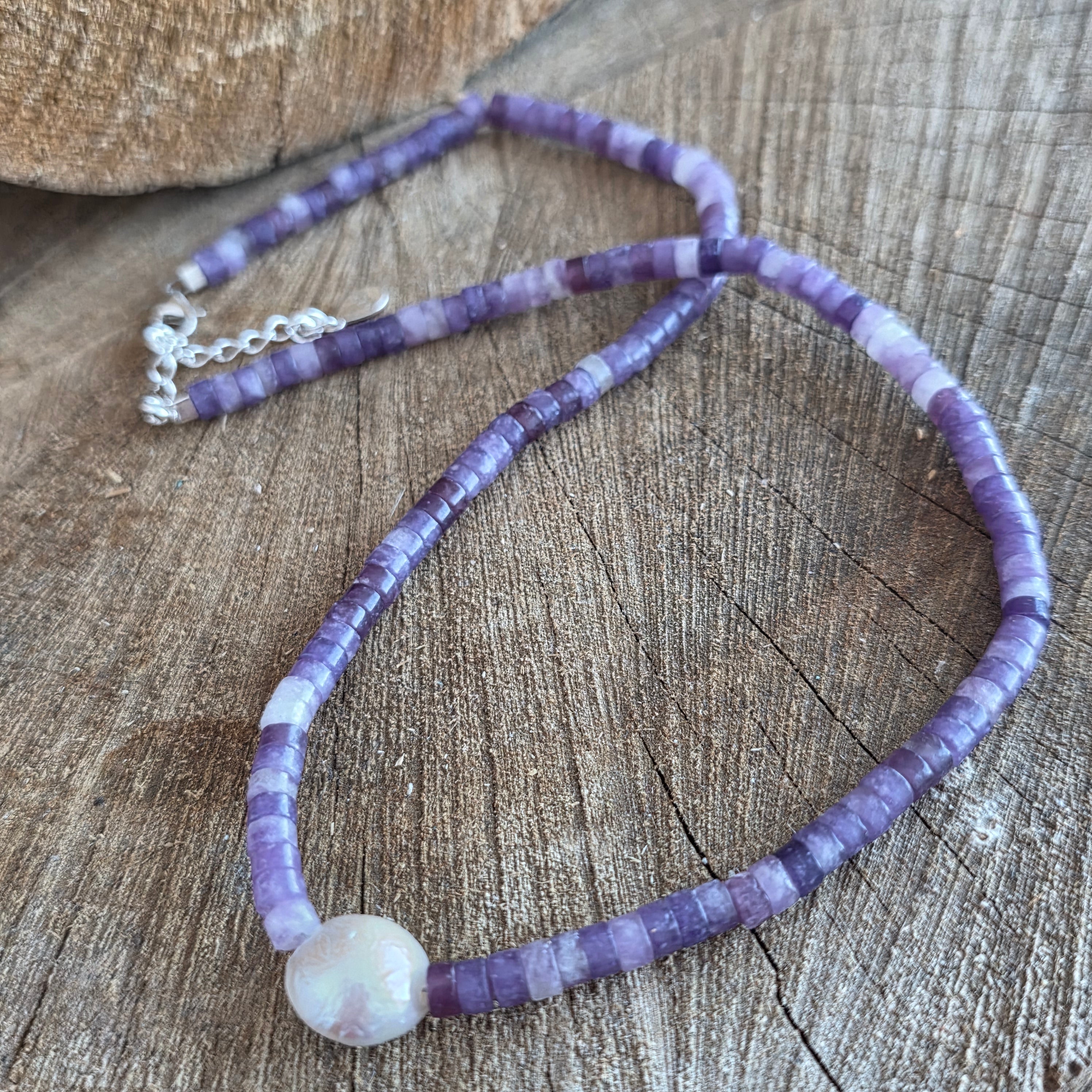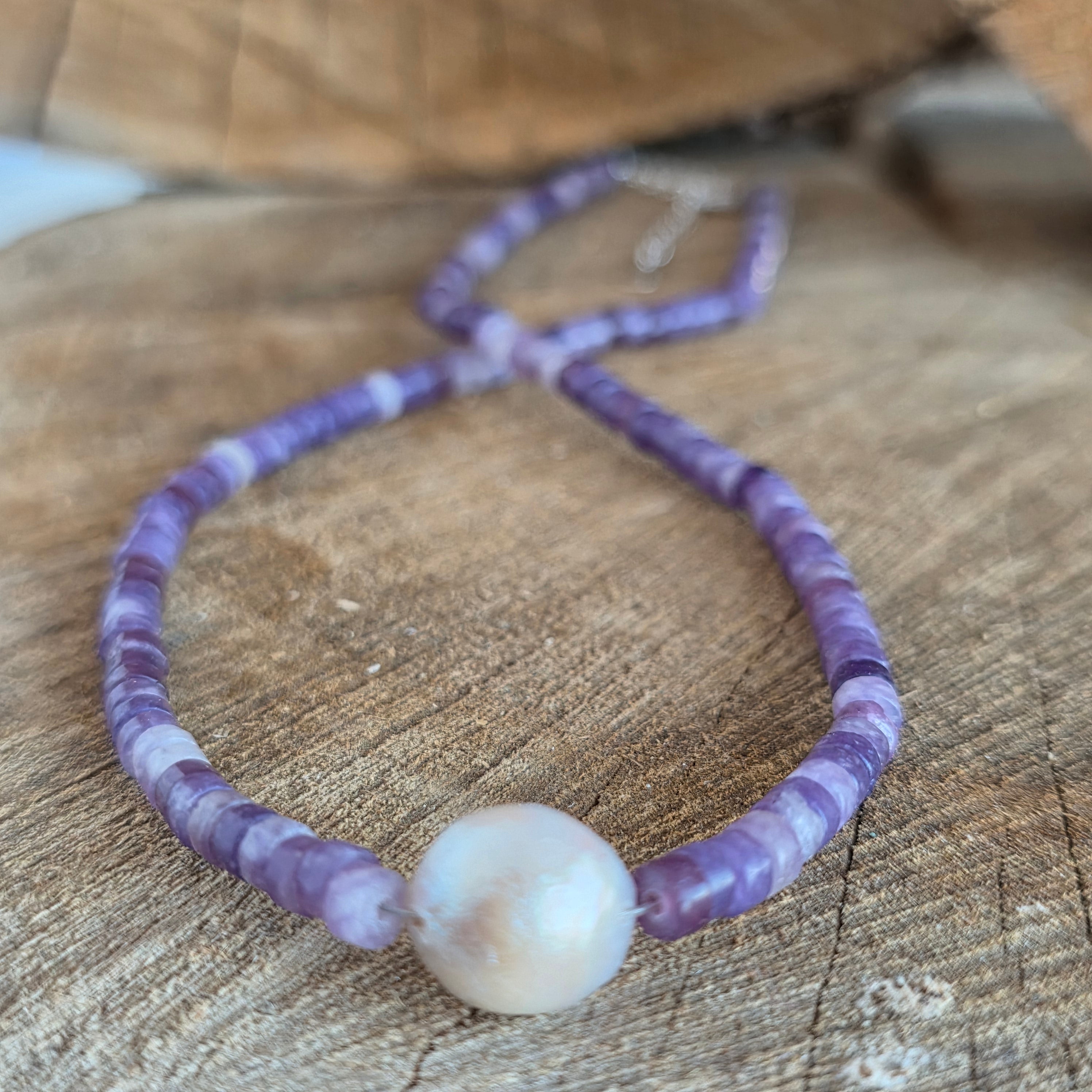 Колие, което излъчва спокойствие и изтънченост, родено от нежната прегръдка на лепидолита с кадифената светлина на перлата. Естественият лепидолит от 8 мм с прозрачните си лилаво-лилави нюанси носи усещане за спокойствие и баланс, като дълбоко вдишване в средата на бурята. Всяка сфера носи нежна, прозрачна вибрация, напомняща за вътрешен мир и яснота на ума.